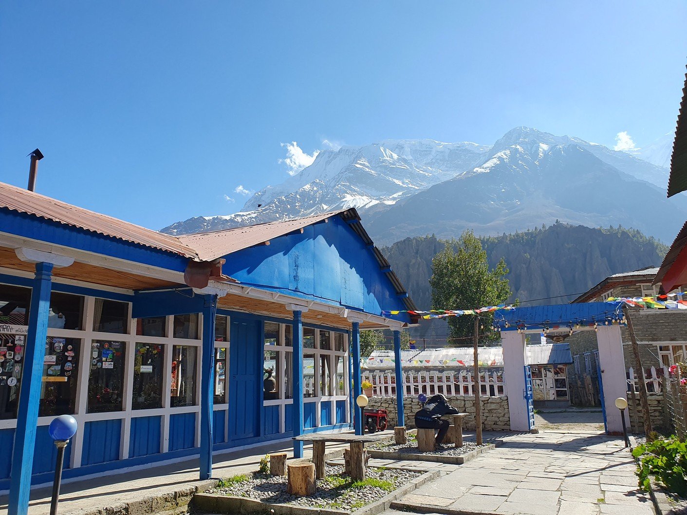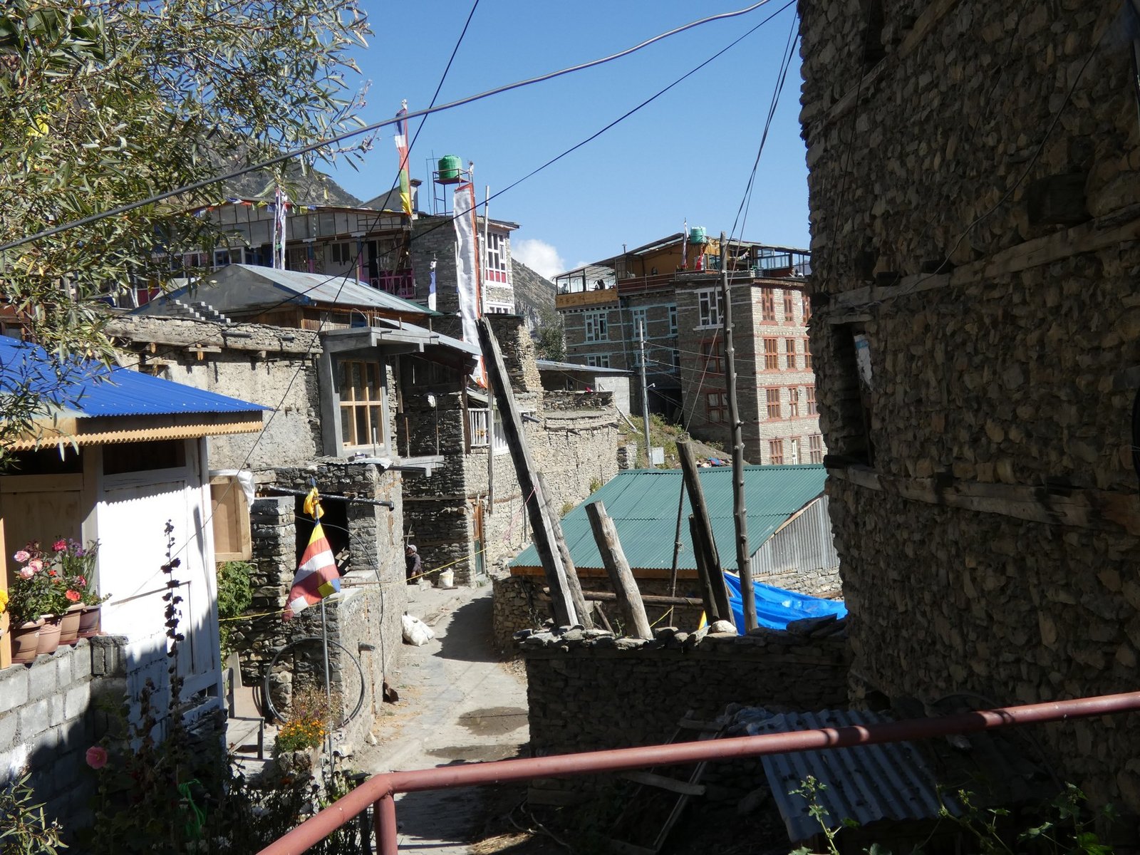 Majatalomme oli melkoisen suuri ja ilmeisen suosittu, koska jo alkuiltapäivästä ilman varausta huonetta kyselemään tulleet vetivät vesiperän. Ilmainen lämmin suihku on luksusta näillä seuduilla, jota saattoi tosin avittaa se, että Amrit ja majatalon pitäjä olivat tuttuja oletettavasti edellisiltä vaelluksilta. Ruokasalissa oli suuri tynnyrikamiina, jonka päälle oli kasattu kiviä kuin kiukaalle konsanaan. Illalla kamiina ja täysi sali porukkaa lämmittivät tilan oikein mukavasti. Netti toimi myös luotettavasti ja nopeasti, joten päivitin blogia kuvilla ja tekstillä pitkän aikaa.