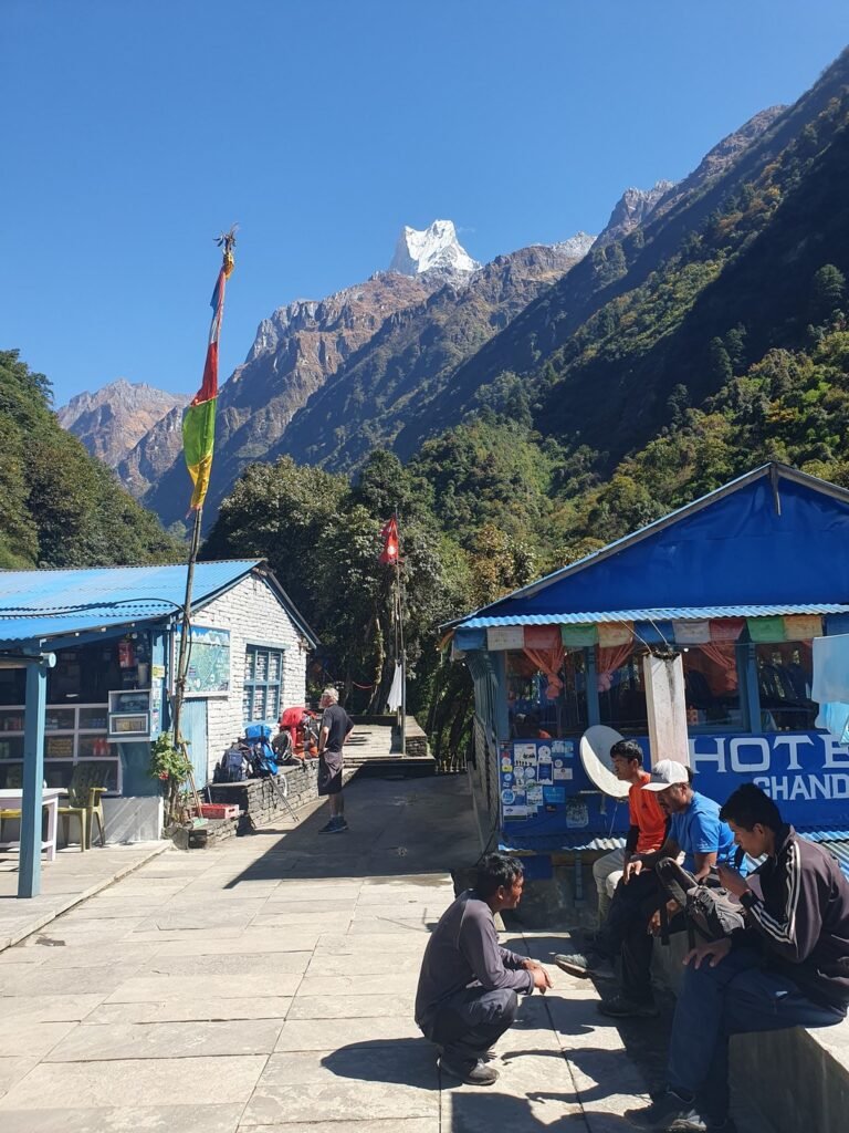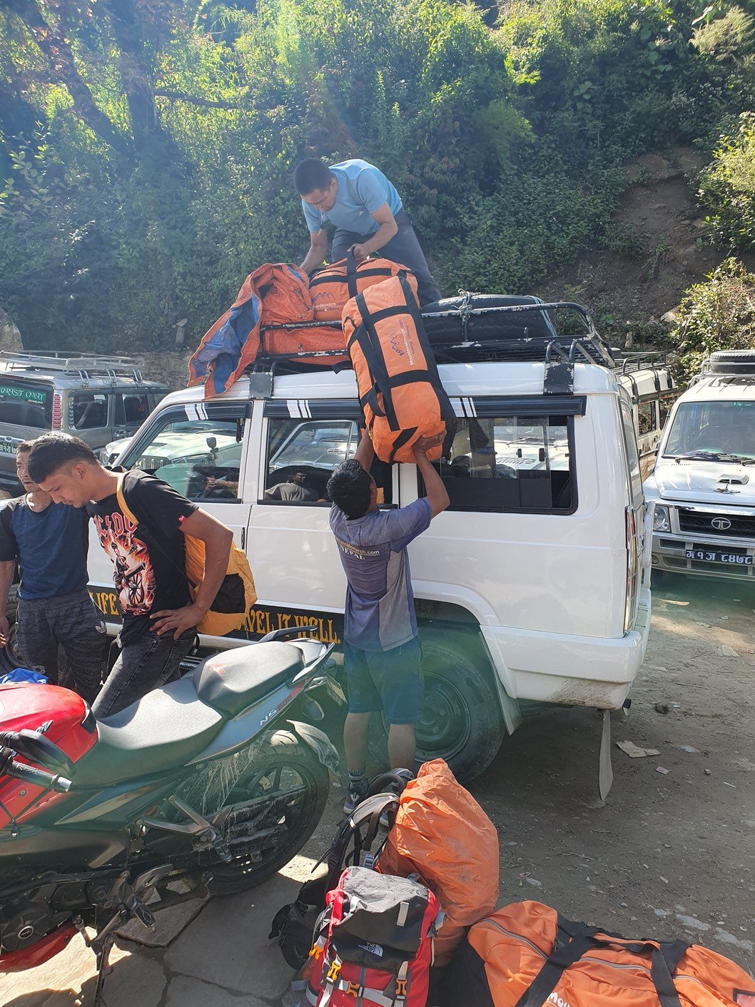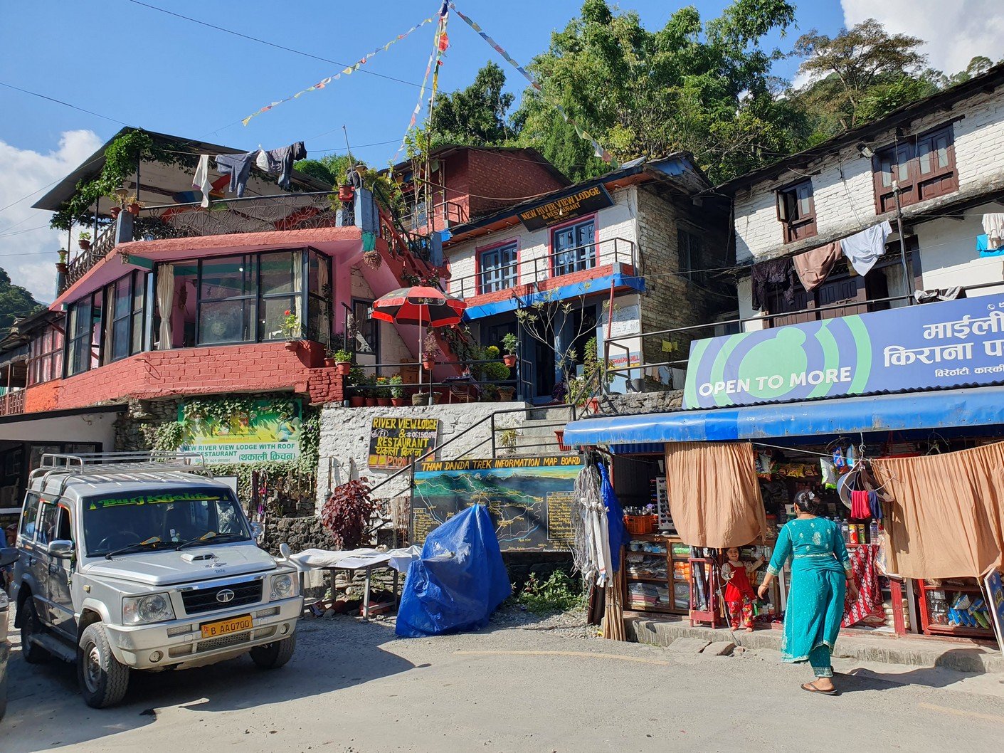 Lähdimme liikkeelle normaaliksi muodostuneeseen aikaan eli varttia vaille kahdeksan. Saavutimme Chomrongin yllättävänkin nopeasti yhdeksään mennessä. Pakkasimme säilytykseen jätetyt kamat takaisin varustekasseihin ja Pasang ja Sanjay köyttivät painavat kassit jälleen kantoliinaan sopiviksi paketeiksi. Limsojen ja valokuvien jälkeen olimme valmiit jatkamaan kohti jeep stationia. Reitti tien alkuun ei tietenkään voi alkaa suoraan Chomrongista, vaan ensiksi pitää jatkaa rappusia vielä kukkulan laelle, josta voi aloittaa laskeutumisen.