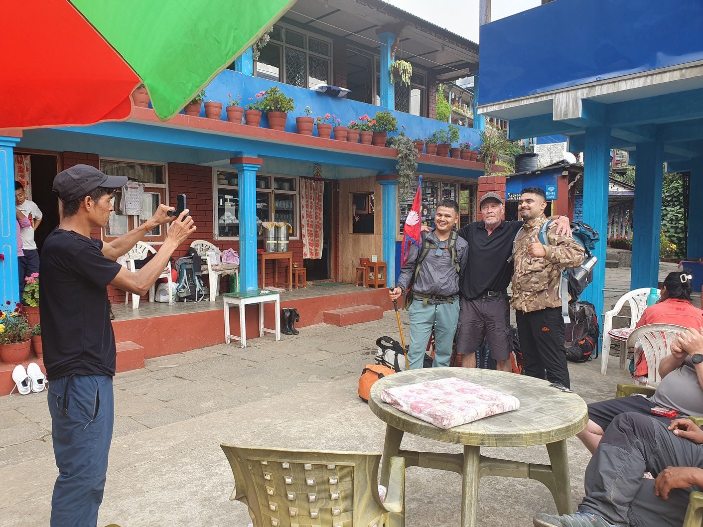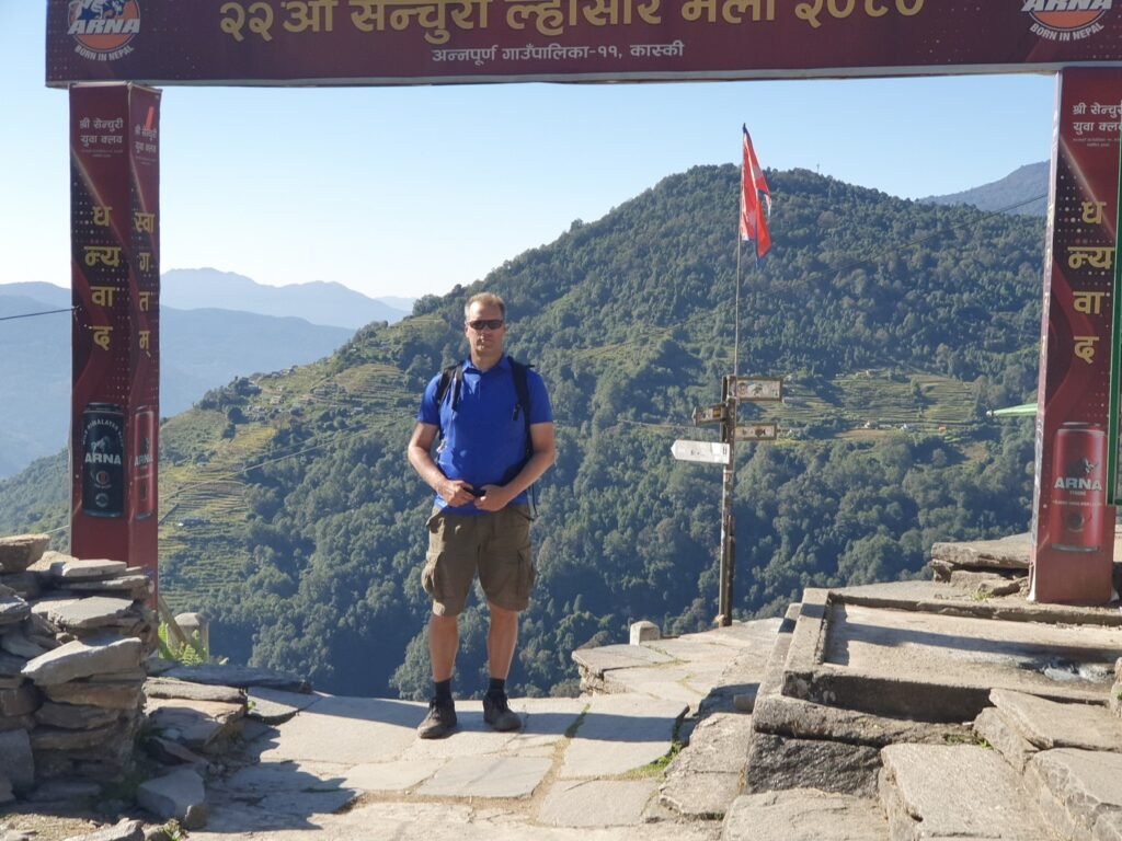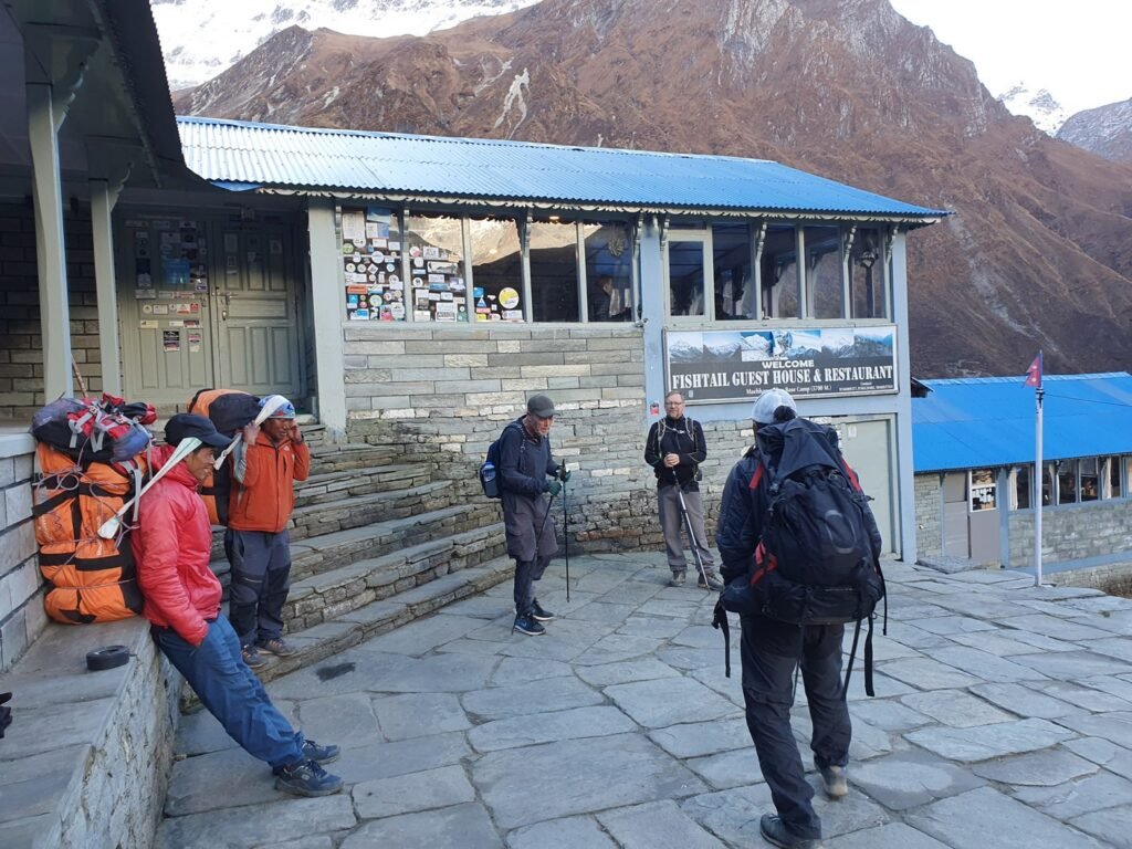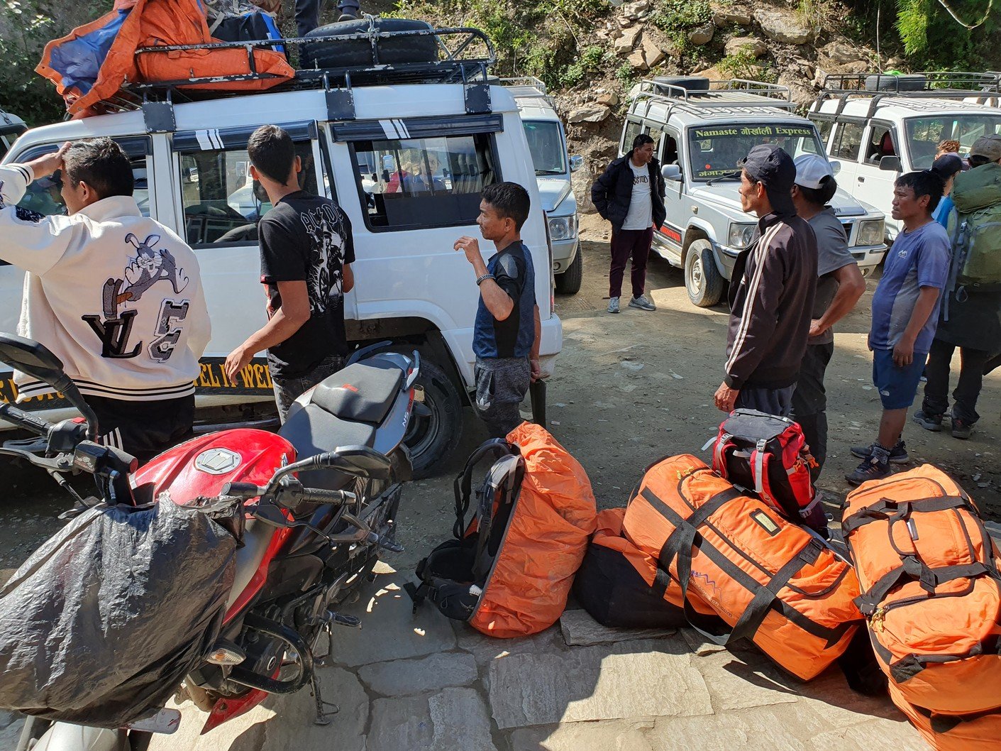 Lähdimme liikkeelle normaaliksi muodostuneeseen aikaan eli varttia vaille kahdeksan. Saavutimme Chomrongin yllättävänkin nopeasti yhdeksään mennessä. Pakkasimme säilytykseen jätetyt kamat takaisin varustekasseihin ja Pasang ja Sanjay köyttivät painavat kassit jälleen kantoliinaan sopiviksi paketeiksi. Limsojen ja valokuvien jälkeen olimme valmiit jatkamaan kohti jeep stationia. Reitti tien alkuun ei tietenkään voi alkaa suoraan Chomrongista, vaan ensiksi pitää jatkaa rappusia vielä kukkulan laelle, josta voi aloittaa laskeutumisen.