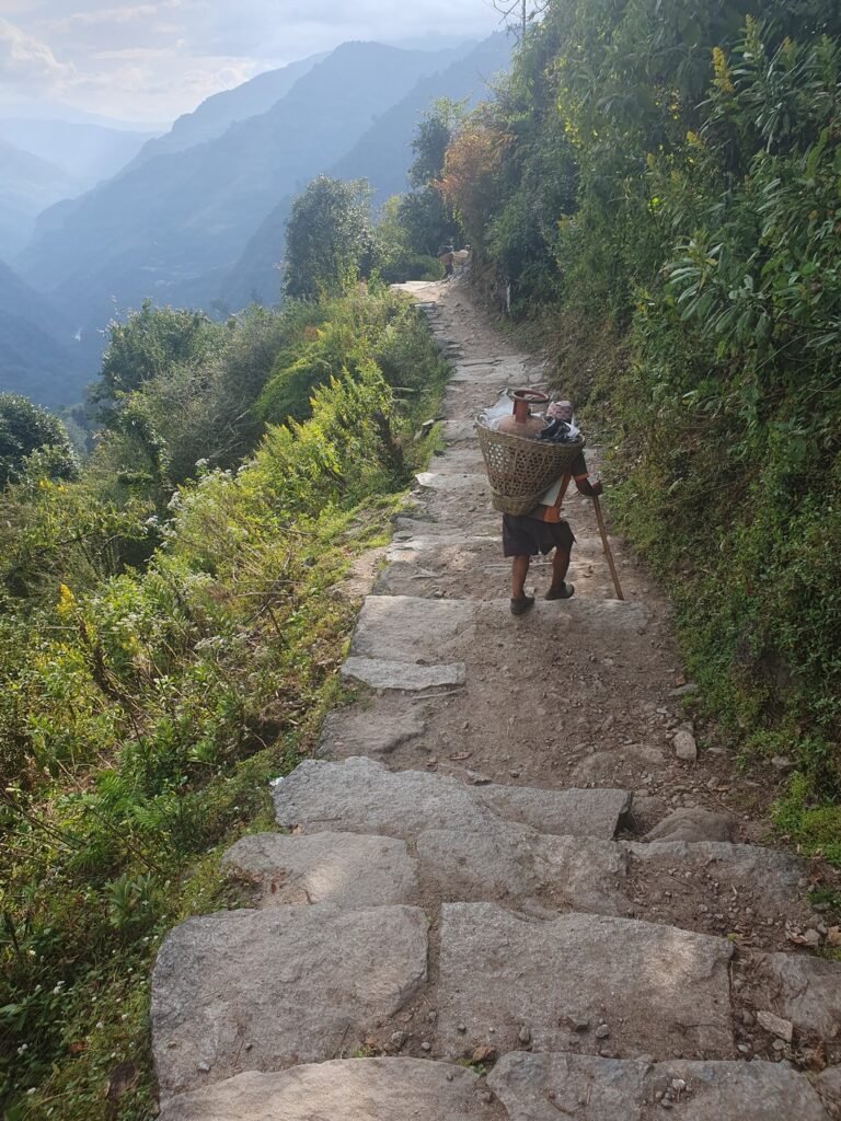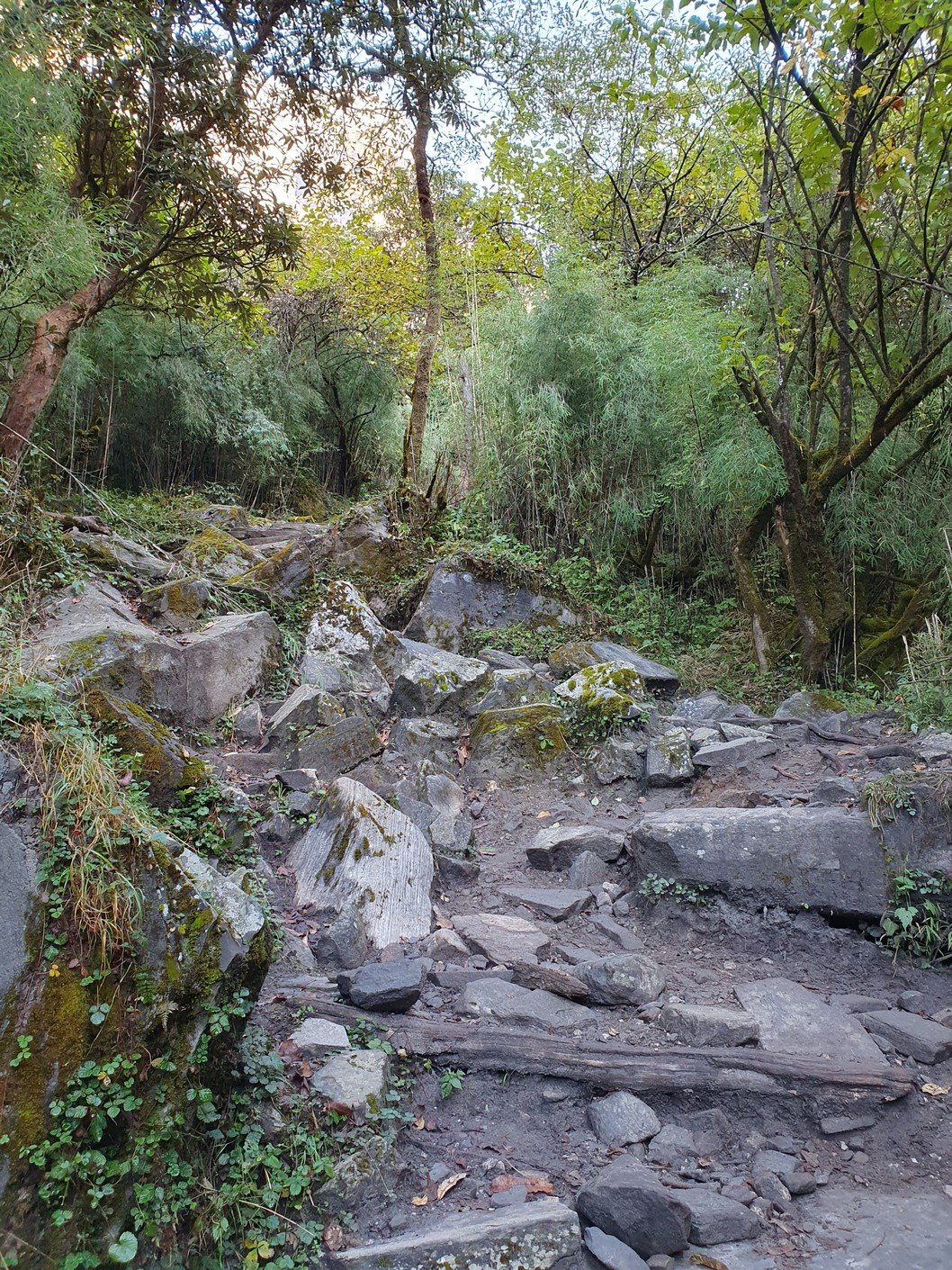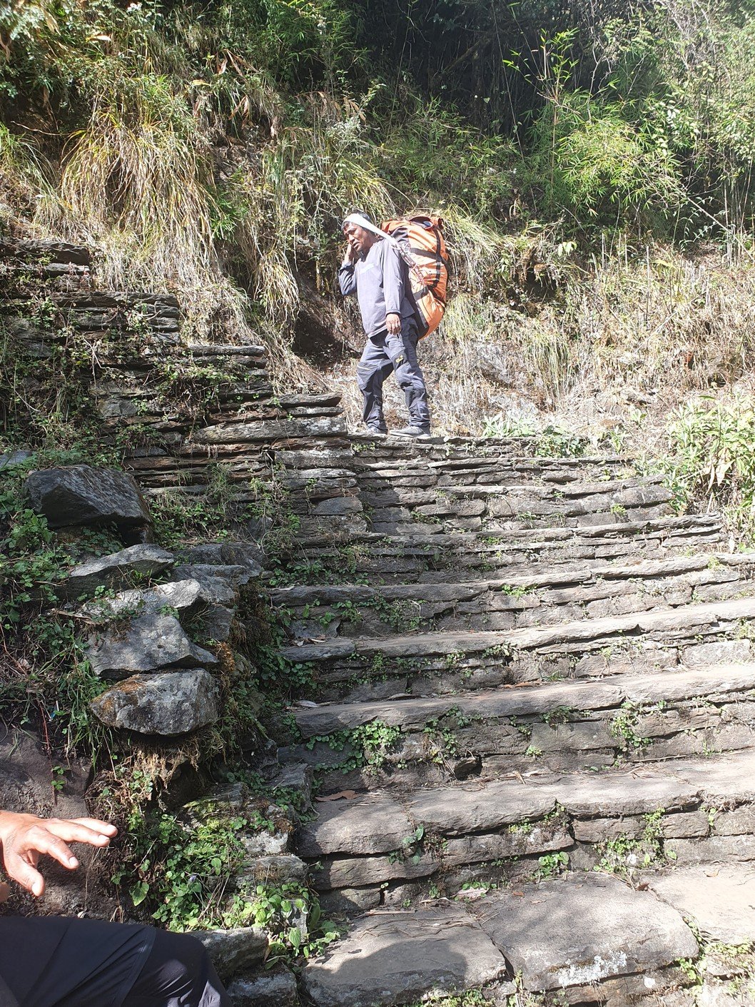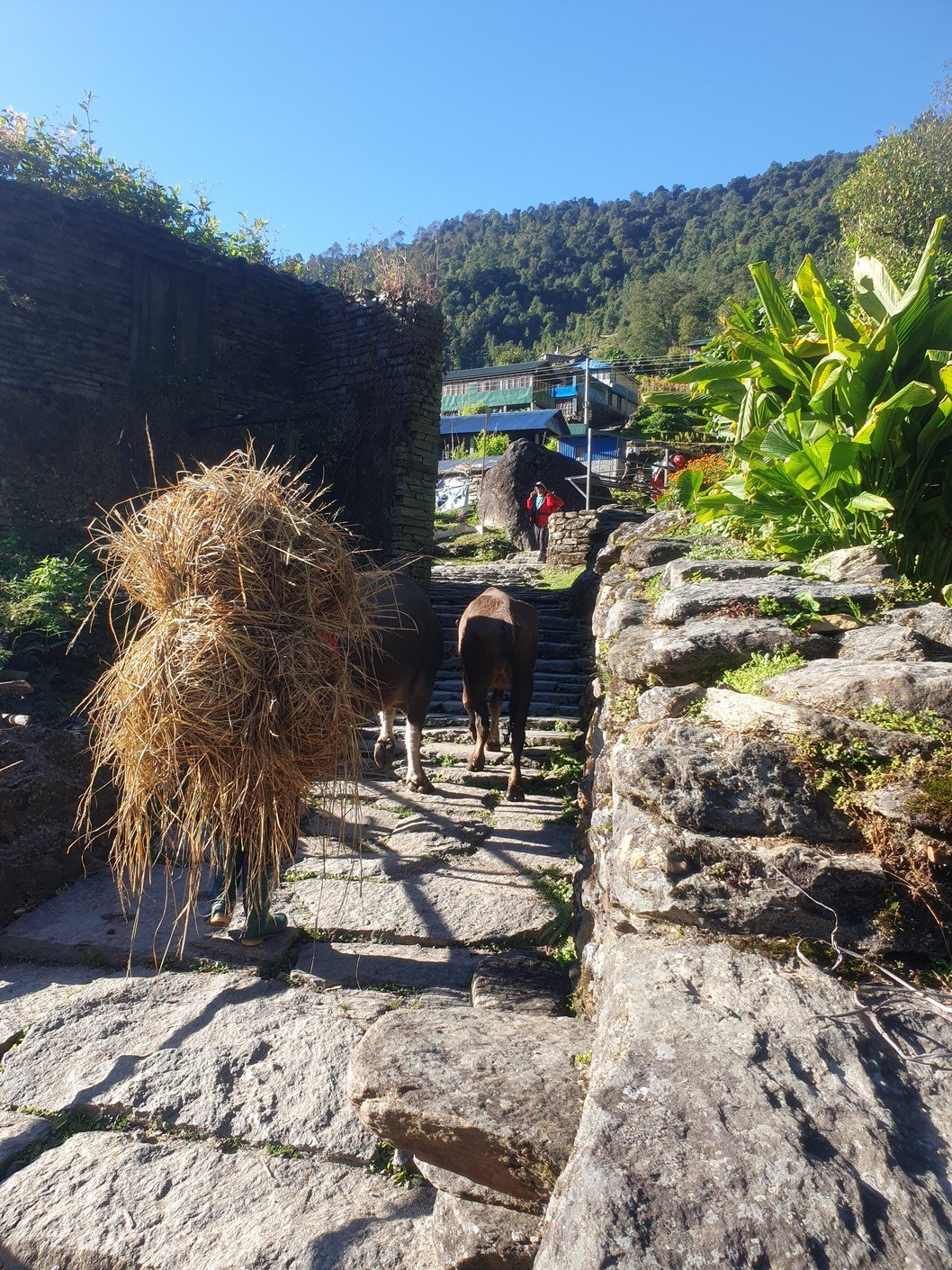 Kivikkoista alamäkeä tai jyrkkiä portaita on yllättävän raskasta laskeutua, mutta onhan se tietenkin selkeästi helpompaa kuin ylöspäin meno. Jalkojen lihakset kyllä rasittuvat, mutta eteneminen ei ole jatkuvaa huohottamista. Olimme kiivenneet lähes saman reitin kaksi päivää aiemmin. Meillä oli kulunut seitsemän tuntia Lower Sinuwasta Deuraliin, lounas mukaanlukien. Tänään aloitimme yhden kylän ylempää, mutta osuusaikojen perusteella lähdimme Deuralista 09:15 ja saavuimme Lower Sinuwaan 15:00 eli viiden tunnin ja kolme vartin päästä, lounas mukaanlukien. On hämmästyttävää, kuinka pieni ero ajoissa oli kun ajattelee että Bamboon ja Deuralin korkeusero on melko tasan 1000 metriä.