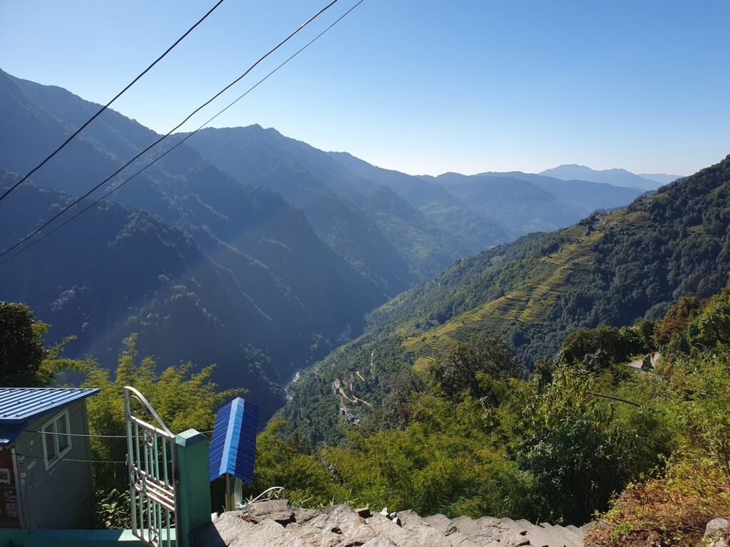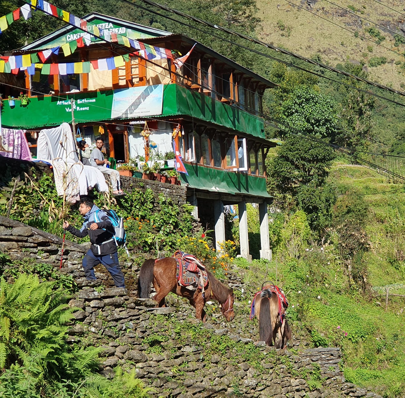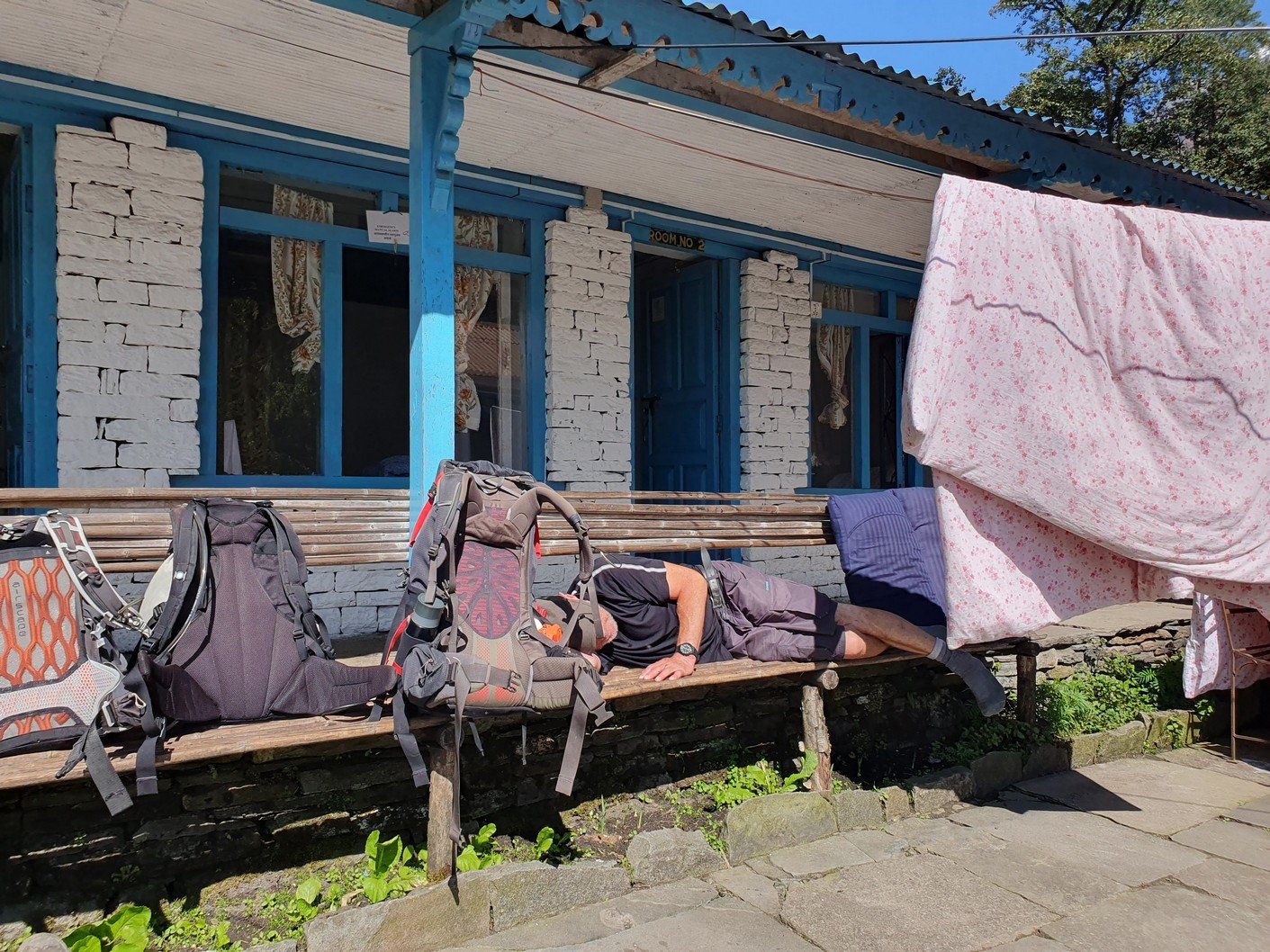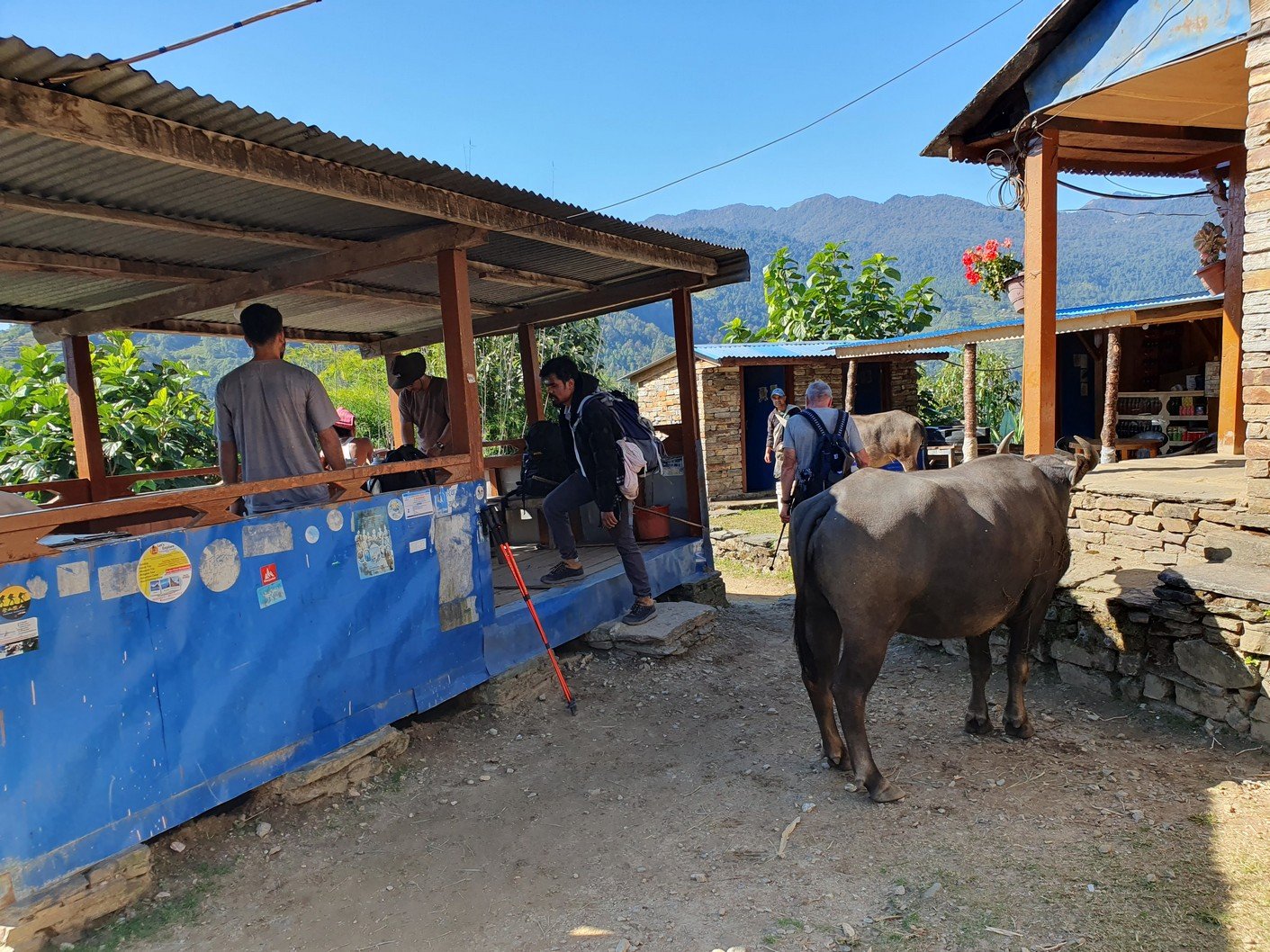 Kivikkoista alamäkeä tai jyrkkiä portaita on yllättävän raskasta laskeutua, mutta onhan se tietenkin selkeästi helpompaa kuin ylöspäin meno. Jalkojen lihakset kyllä rasittuvat, mutta eteneminen ei ole jatkuvaa huohottamista. Olimme kiivenneet lähes saman reitin kaksi päivää aiemmin. Meillä oli kulunut seitsemän tuntia Lower Sinuwasta Deuraliin, lounas mukaanlukien. Tänään aloitimme yhden kylän ylempää, mutta osuusaikojen perusteella lähdimme Deuralista 09:15 ja saavuimme Lower Sinuwaan 15:00 eli viiden tunnin ja kolme vartin päästä, lounas mukaanlukien. On hämmästyttävää, kuinka pieni ero ajoissa oli kun ajattelee että Bamboon ja Deuralin korkeusero on melko tasan 1000 metriä.