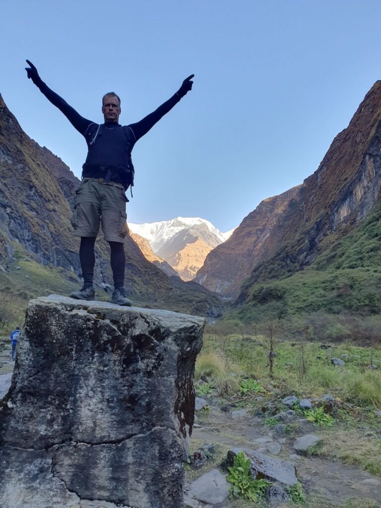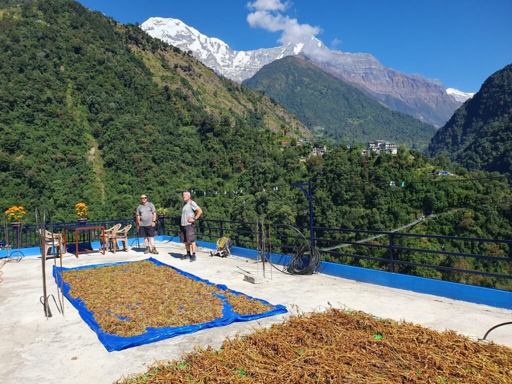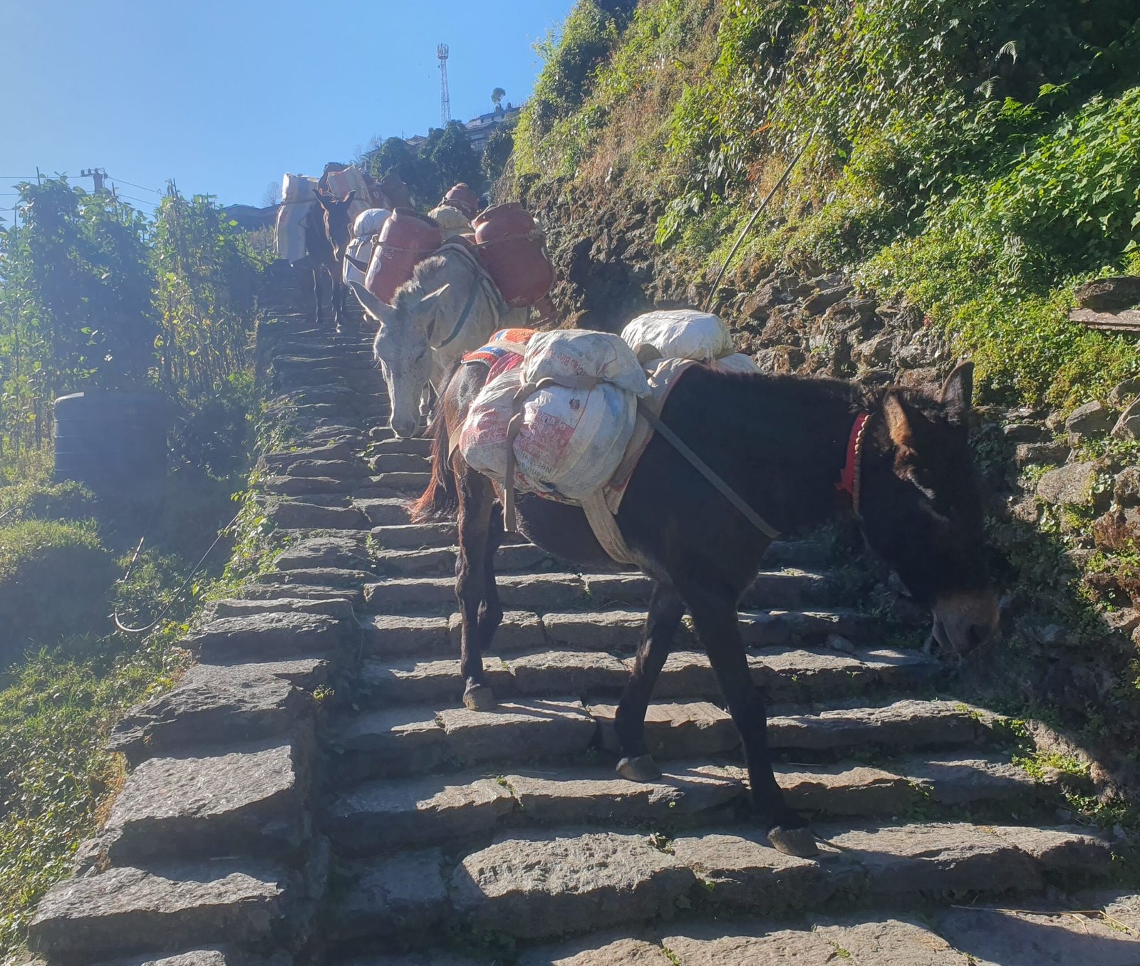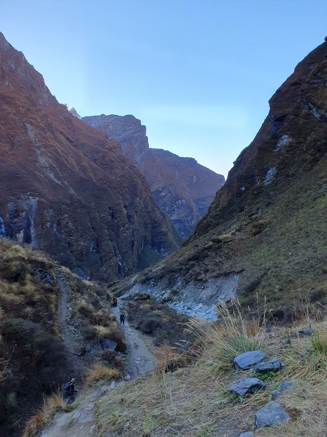 Kivikkoista alamäkeä tai jyrkkiä portaita on yllättävän raskasta laskeutua, mutta onhan se tietenkin selkeästi helpompaa kuin ylöspäin meno. Jalkojen lihakset kyllä rasittuvat, mutta eteneminen ei ole jatkuvaa huohottamista. Olimme kiivenneet lähes saman reitin kaksi päivää aiemmin. Meillä oli kulunut seitsemän tuntia Lower Sinuwasta Deuraliin, lounas mukaanlukien. Tänään aloitimme yhden kylän ylempää, mutta osuusaikojen perusteella lähdimme Deuralista 09:15 ja saavuimme Lower Sinuwaan 15:00 eli viiden tunnin ja kolme vartin päästä, lounas mukaanlukien. On hämmästyttävää, kuinka pieni ero ajoissa oli kun ajattelee että Bamboon ja Deuralin korkeusero on melko tasan 1000 metriä.