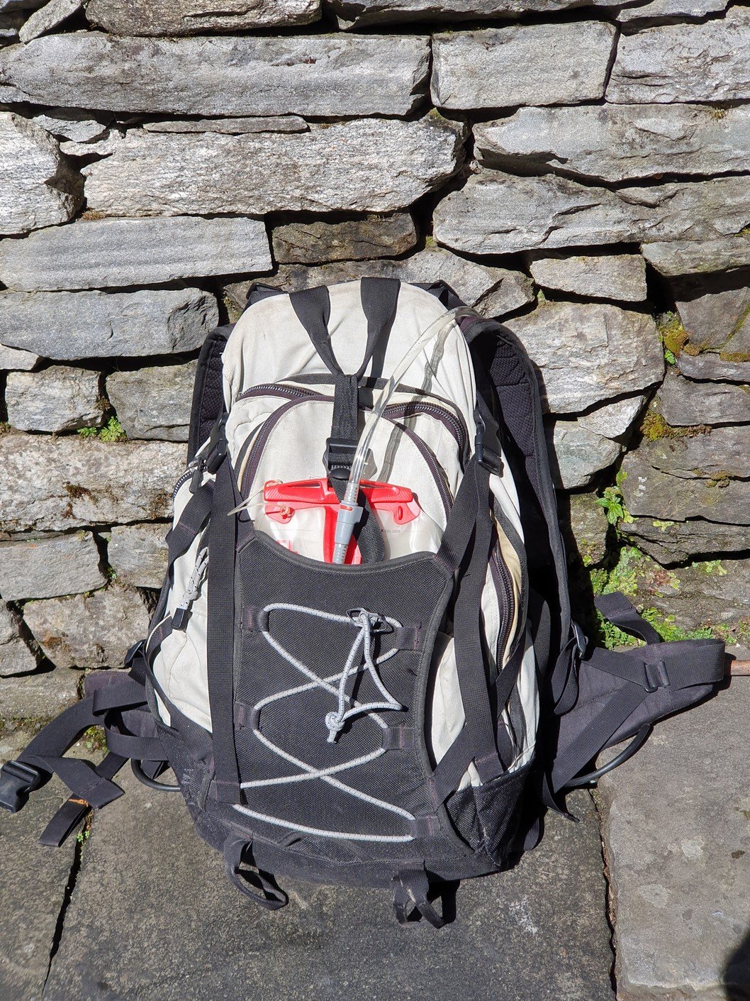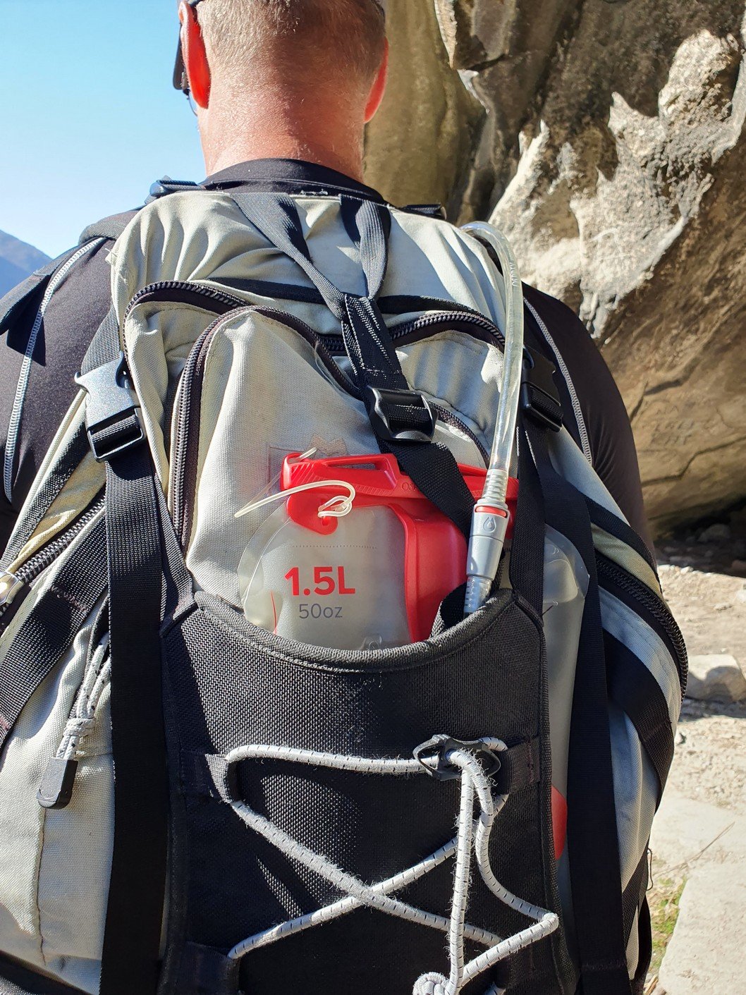 Juotavaa kului joka päivä paljon hikoilun takia sekä akklimatisoitumisen toimivuuden varmistamiseksi. Polkujuoksijat käyttävät reppuja, joissa on kantoremmeissä paikat juomapulloille. Kyseiset reput ovat kuitenkin käyttötarkoituksensa mukaisesti yleensä melko pieniä kuin myös niihin tarkoitetut juomapullot, eikä meillä kenelläkään ollut sellaisia. Juomapussi on kätevä ratkaisu siinä mielessä, että juotavaa saa helposti milloin vain ilman, että tarvitsee pysähtyä ja kaivaa pulloa repusta. Usein juomapussi laitetaan repun sisään, mutta itse en sitä halunnut tehdä, koska repussa oli läppäri sekä muuta elektroniikkaa. Omassa repussani on ulkoinen varustetaskun tapainen lippa, jonne juomapussin sai viriteltyä ylimääräisen kiristysremmin avulla.
