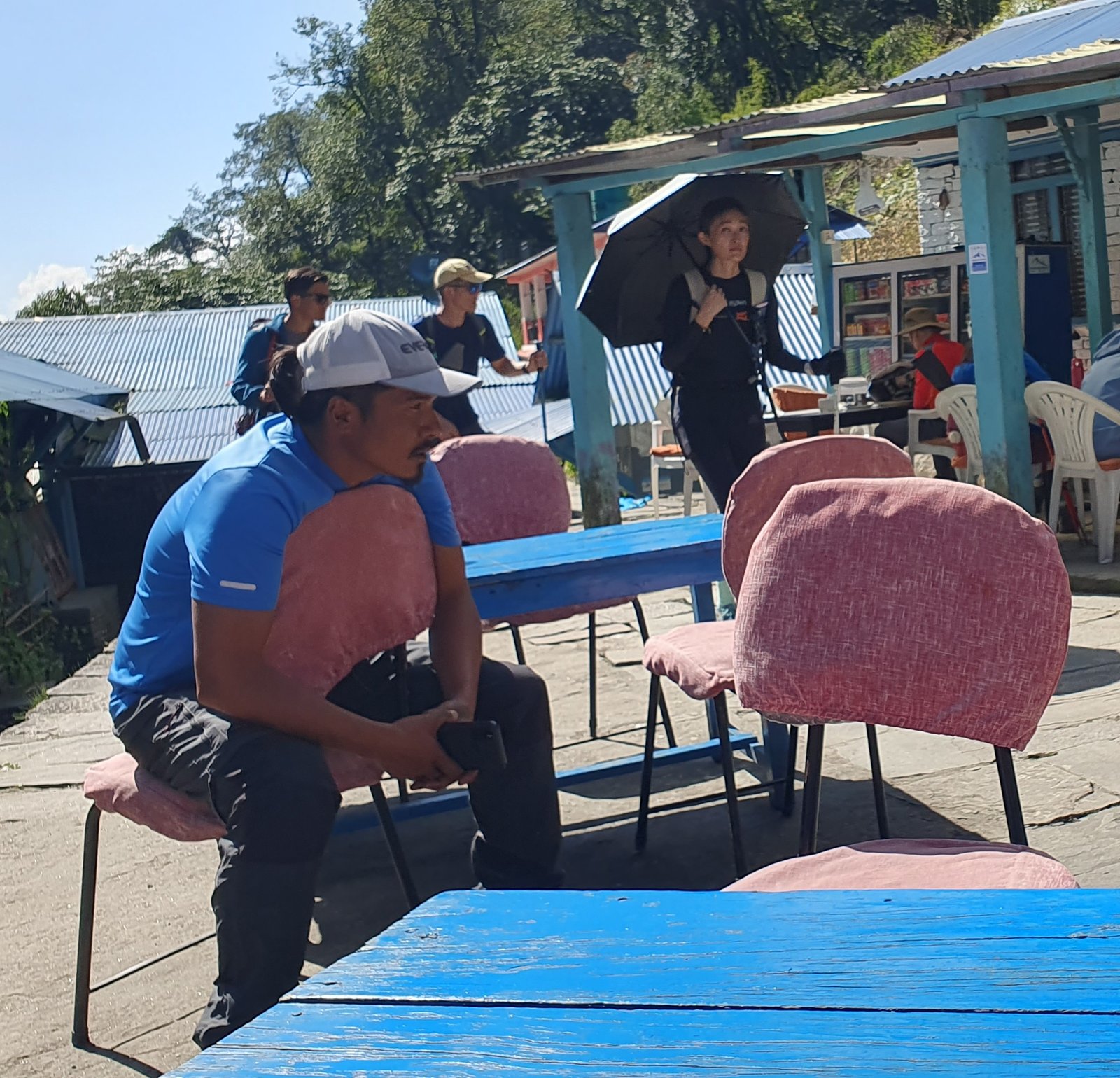 Juomiin liittyvä rutiini muodostui nopeasti. Illalla Nalgene-pullot täyteen suodatettua vettä ja pilleri kumpaankin pulloon. Pude otti pääosin keitettyä ja kuumaa vettä, mutta sillä on paha esim. harjata hampaita tai juoda, jos illalla on jano. Aamulla sekoitin toiseen pulloon urheilujuomajauhetta, jota ehdottomasti kannattaa ottaa tyyliin puolen kilon pussi mukaan. Amrit väitti, että jauhetta on helposti saatavilla, mutta se pätee ehkä vain Kathmanduun, koska en nähnyt sitä tarjolla pienempien kylien kioskeissa tai kaupoissa. Puolen kilon pussi on tarkoitettu noin 25 pullolliselle, joka oli sopiva määrä jopa meidän kahden vaelluksen kombolle. Sekoituksen jälkeen urheilujuoma sekä vajaa puolet toisesta vesipullosta pussiin. Tyhjä pullo varustekassiin ja pullo johon jäi vielä 3-4 desilitraa vettä päiväreppuun. Se toimi sopivana reservinä, jos pussin sisältö loppuu, mitä on vaikea huomata ellei tauolla erikseen tarkista pussin sisältöä. Hampaidenpesun ja mahdollisen muutaman huikan jälkeen Nalgene-pulloista irtoaa aamulla yhteensä noin 1,8 litraa. Lounaalla oli aina teen tai kaakaon kaltainen kuuma juoma, joka on pari desiä lisää. Päivän aikana lounaalla tai tauolla juotiin käytännössä aina myös kokis tai joku muu limsa, joka oli normaalisti puoli litraa tai Annapurnan perusleiriä lähestyttäessä hieman pienempi lasipullo. Näistä tuli yhteensä noin 2,5 litraa, joka oli riittävä määrä, ellei päivä ollut erityisen kuuma tai pitkä. Varsinkin alempana oli kuuma, jolloin nestettä kului vielä enemmän. Tällöin lounaan yhteydessä piti vielä ostaa yksi pullovesi tai täyttää yksi Nalgene suodatetulla vedellä.