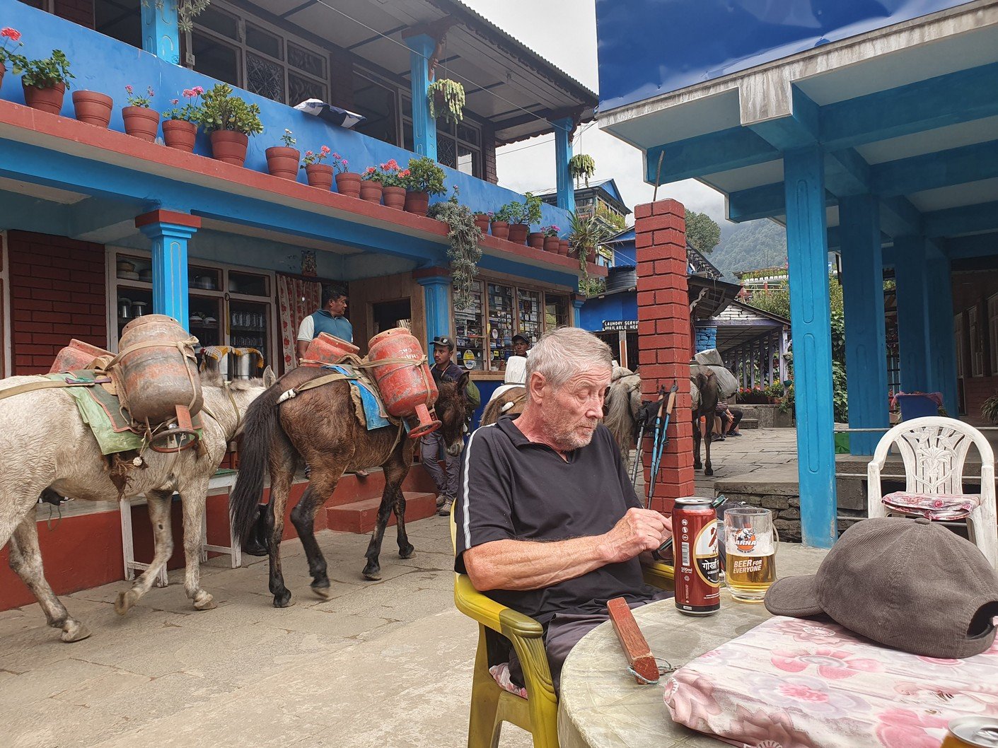 Juomapussien lisäksi meillä oli pari Nalgene-pulloa, jotka saimme täytettyä iltaisin. Juomavesi oli joko juuri keitettyä tai suodatettua, mitä se sitten käytännössä tarkoittikaan. Itse ainakin tiputin pulloihin vielä vedenpuhdistustabletin saatuani pullot täytettyinä. Keitetty tai suodatettu vesi ei ollut ilmaista, mutta se kuului ruuan ohella matkapakettiimme. Ilmeisesti se maksoi 150 – 200 rupiaa per litra, joka oli melkolailla sama hinta kuin pullotetulla vedellä. Pulloveden hinta ainakin ylempänä Annapurnan pohjoispuolella oli yllättävän vähäinen, kun ajattelee kuinka paljon se painaa ja kuinka pitkältä se on pitänyt rahdata muulin tai kantajan toimesta. Annapurnan eteläpuolella perusleiriin vievällä reitillä muovipullot olivat kiellettyjä. Mutta ei se kolmanneslitran lasinen limsapullokaan mitenkään kevyt tai biohajoava ole!