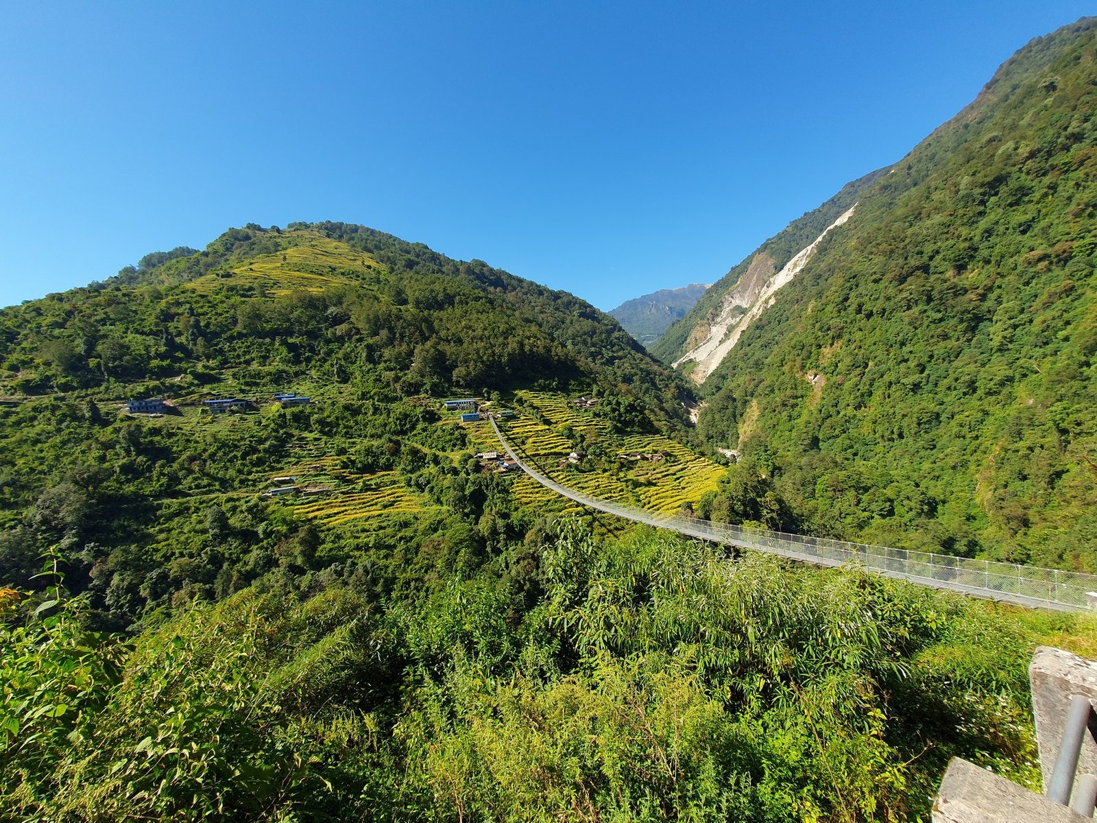 Tänään oli viimeisen ponnistuksen aika. Tien pää ja ‘jeep station’ näkyivät Lower Sinuwaan asti, mutta linnuntien ja todellisen reitin välillä oli kiusallisen suuri ero. Ensiksi piti laskeutua puolisen tuntia laakson pohjalla virtaavan joen ylittävälle riippusillalle. Sen jälkeen vuorossa oli 1797 rappusta Chomrongiin, jonne olimme jättäneet ylimääräiset varusteemme. Siitä piti vielä jatkaa 402 rappusta lähestulkoon kukkulan laelle, jonka jälkeen seurasi tietenkin infernaalinen alamäki ylivoimaisesti suurimmalle näkemällemme riippusillalle, joka oli samalla ABC-trekin alkupiste. Tai alkupiste niille, jotka tekevät pelkän ABC-trekin ja tulevat jeepillä tien päähän. Mehän emme näin tehneet, vaan tetsasimme useamman päivän vuoria ylös ja alas Tatopanista Ghorepanin ja Chuilen kautta Chomrongiin.