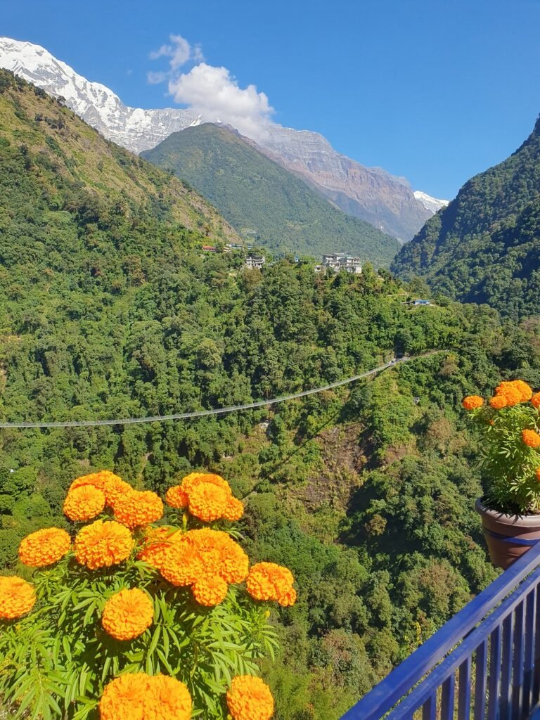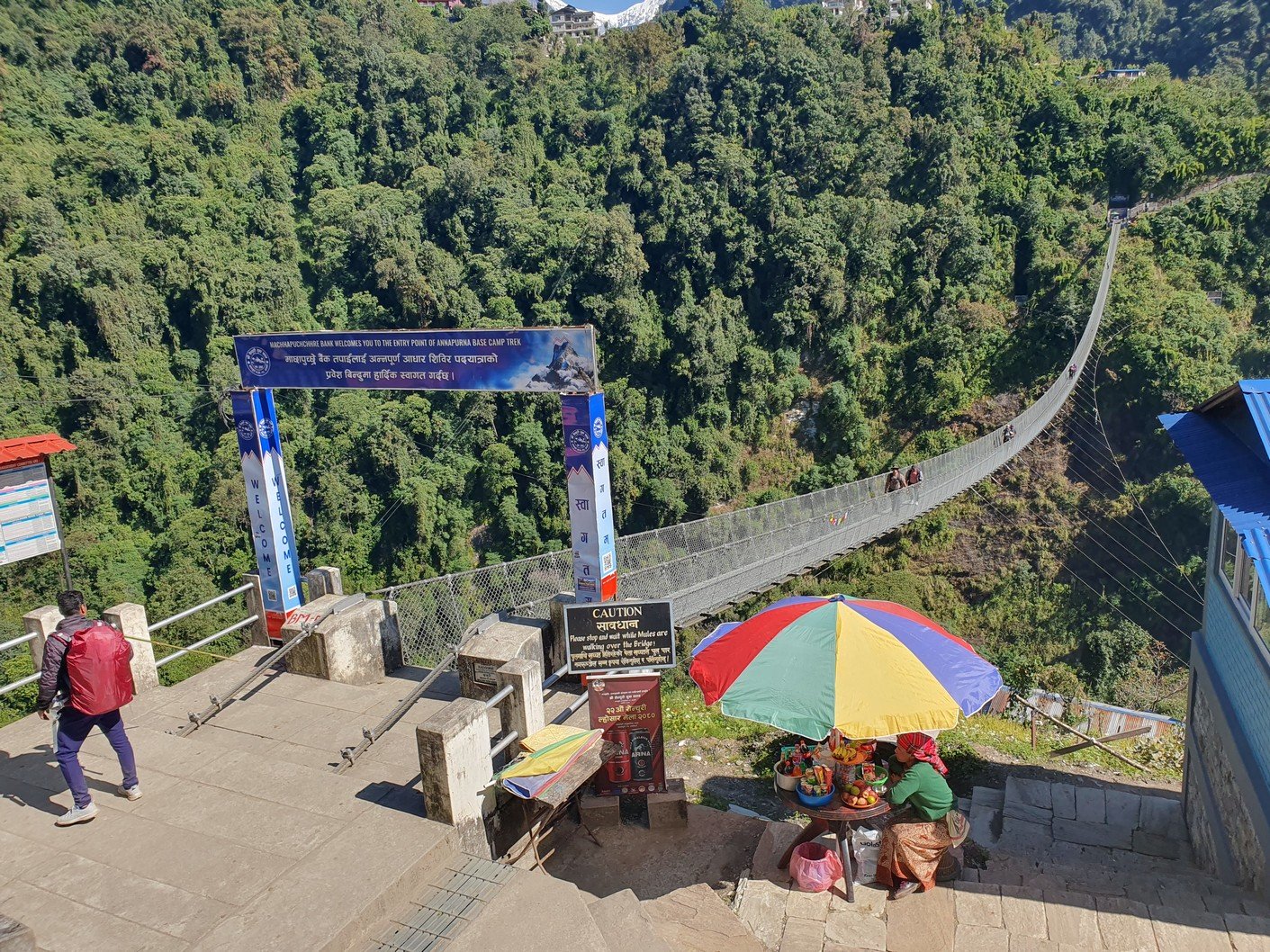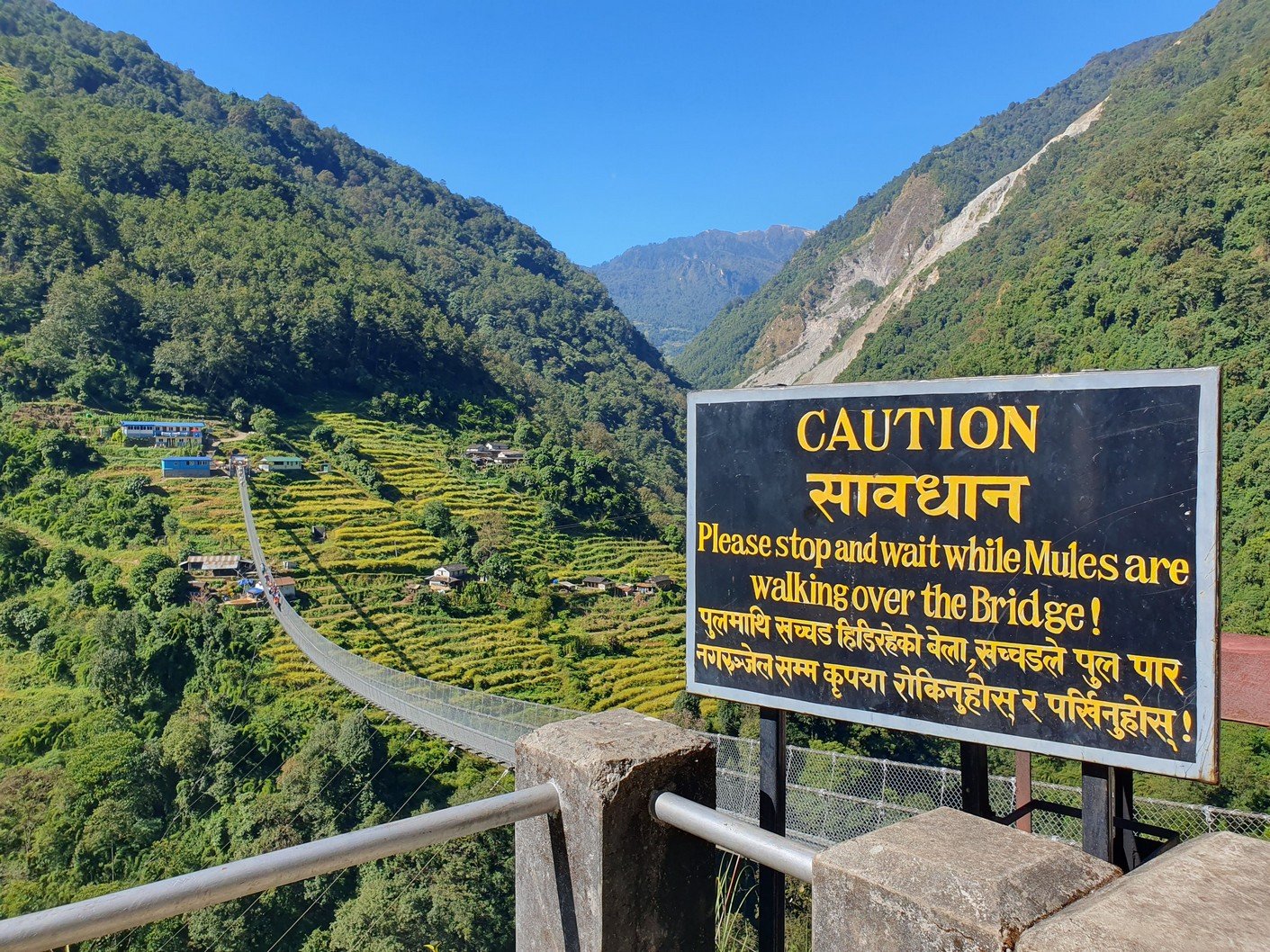 Laakson pohjalla virtaavan joen ylittävä Jhinu Dandan riippusilta on melkoisen vaikuttava rakennelma. Pituutta on 287 metriä ja korkeutta enimmillään 135 metriä. Siinä jää stadikan torni heittämällä kakkoseksi ja näkymät olivat sen mukaiset. Sillan kummassakin päässä on varoituskyltti, joka kieltää sillalle menon jos sillä on jo muulikaravaani liikkeellä. Koska ABC-alueen tavarat tuodaan autolla tien päähän ja siitä eteenpäin muuleilla tai kantajien selässä, elukoita on liikkellä tasaiseen tahtiin. Mekin jouduimme odottelemaan, koska toiselta puolelta oli juuri lähtenyt puolen tusinan muulin letka liikkeelle.