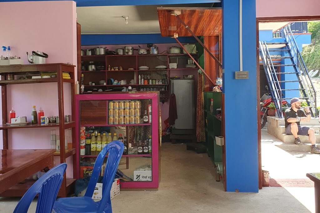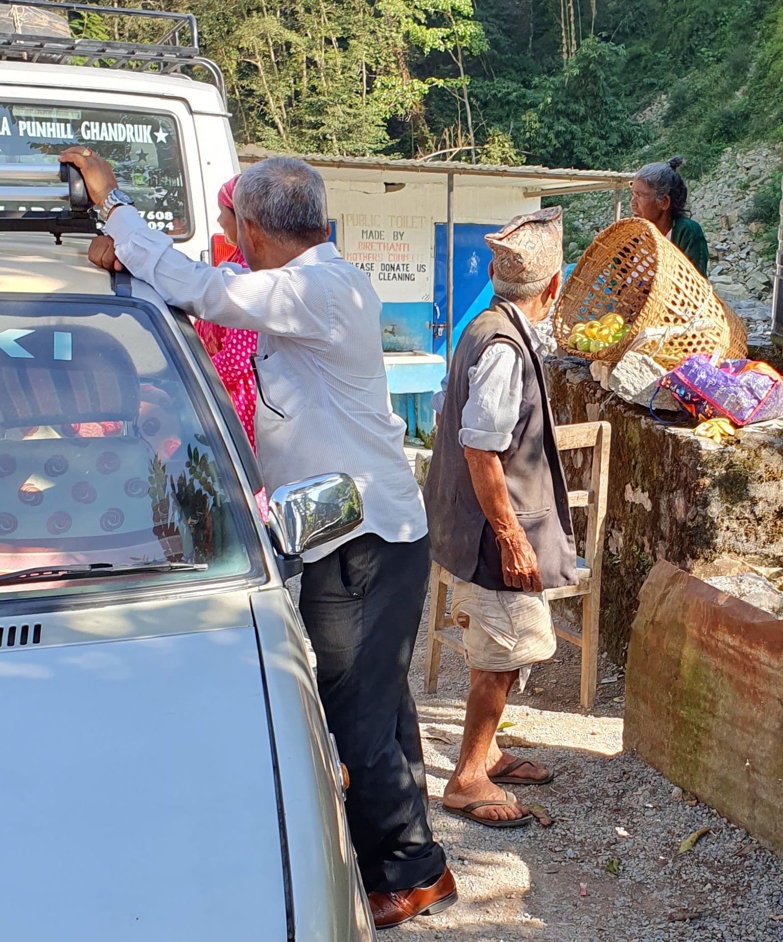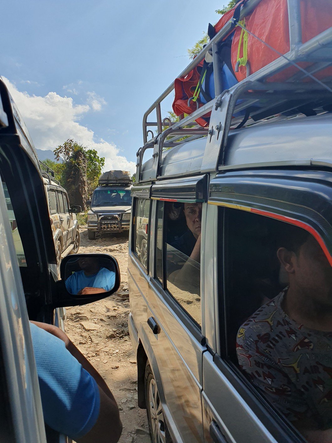 Olimme perillä jeeppiasemalla varttia vaille yksitoista. Ehdimme syödä kevyen lounaan yksityisellä kattoterassilla, ennen kuin kyytimme oli valmiina lähtöön. Kattoterassi oli kauniisti sanottuna rustiikki, mutta maisemat olivat ainutlaatuiset. Koska matka oli nyt paketissa, sitä piti luonnollisesti juhlistaa pikkupullolla Khukri-rommia. Kyllä kelpasi istuskella kattoterassilla ja siemailla Khukri-kaakaota. Koska pikkupullo katosi parempiin suihin alta aikayksikön, piti jeeppimatkalle ostaa vielä toinen pullo.