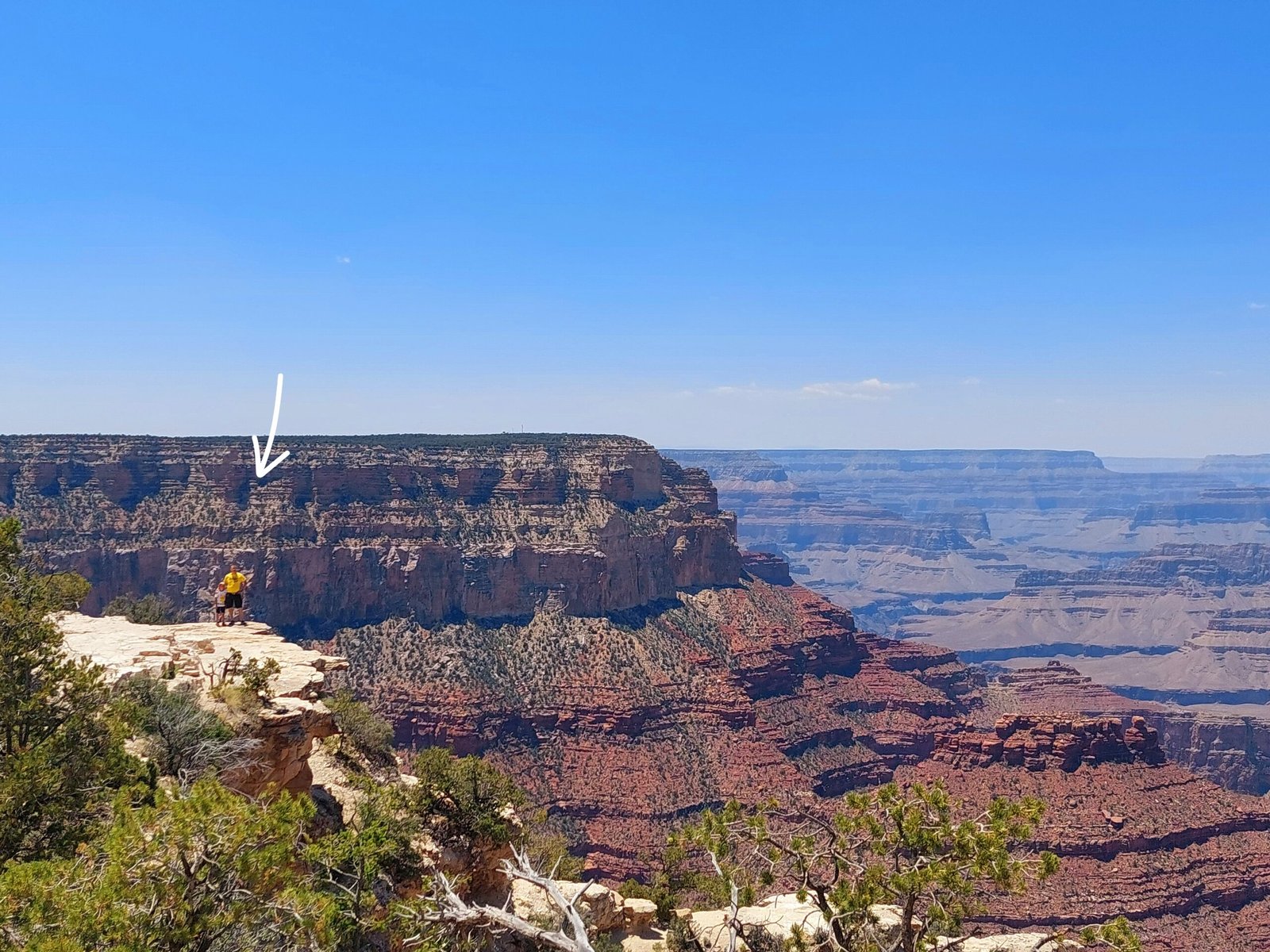 Finally, however, we arrived at our first stop, Yavapai Point. There would have been a geological museum there, but we didn’t go there, preferring to look at the rock formations outside. Jaana had been to the Grand Canyon once before, but the sheer size of the place still amazed her. The pictures do not do justice to how stunning the Grand Canyon is. At its widest point, the canyon is about 29km wide, and even in the narrower parts it is almost 19km. The canyon is up to 1.8km deep with an average depth of about 1.5km, so it’s certainly grand! It would also be interesting to visit in winter, when there can be up to 1.5m of snow on the south rim, and even more snow on the northern rim. Now, in the thirty degree heat, it was a bit hard to believe, though.