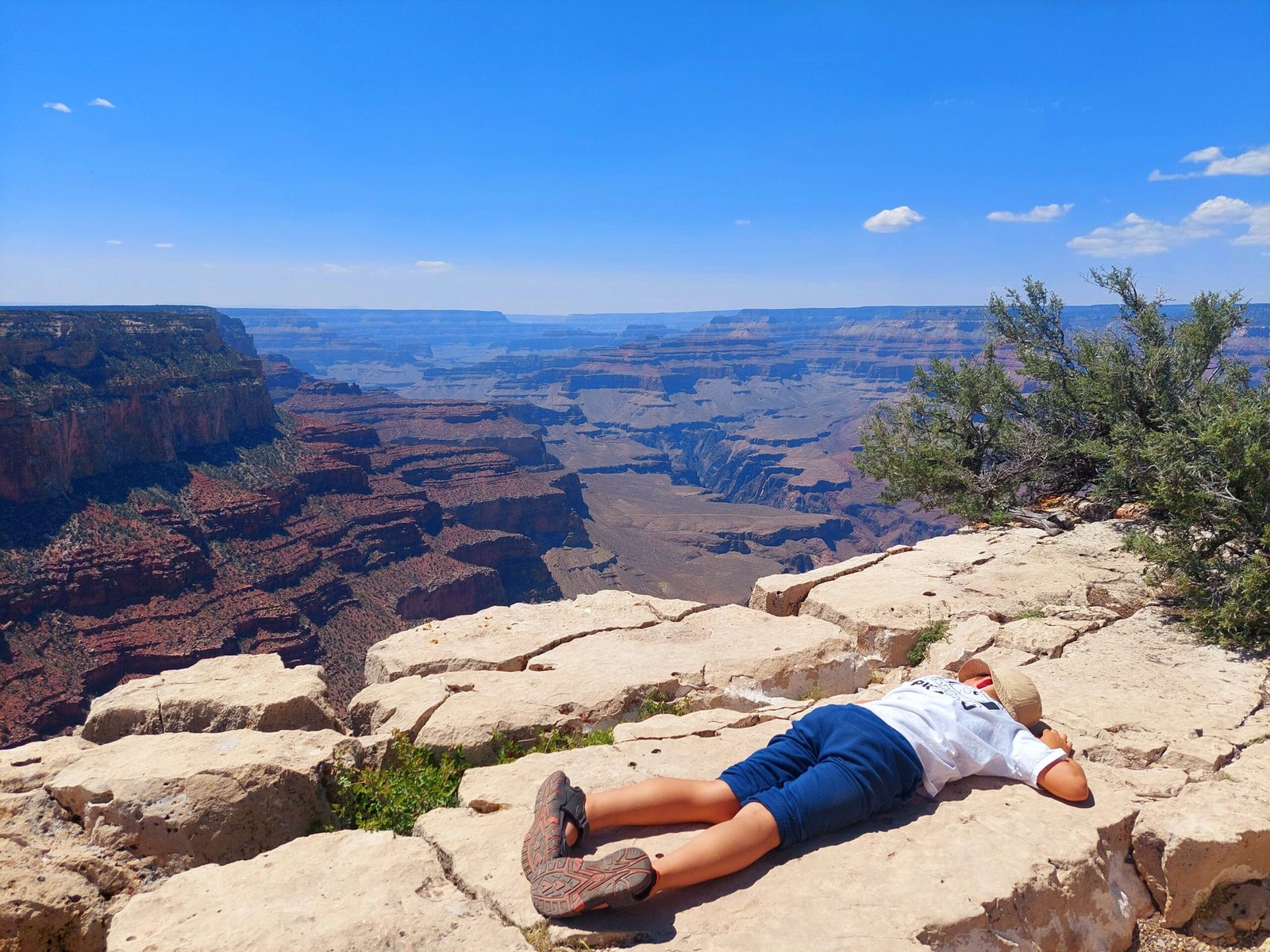 Our second stop was at Yaki Point, where Risto had had enough of looking at the rocks and decided to take a nap on the rim. He said the tour was a bit boring, and he had left the binoculars on the train. The rest of us kept on admiring the scenery despite the scorching heat. The temperature on the Grand Canyon plateau was just over 30 degrees Celsius, so we didn’t for a moment feel like going on a hike to the bottom of the canyon, where temperatures stay in the mid-40s day and night. At least on the plateau the temperature drops considerably at night, and cools down nicely.