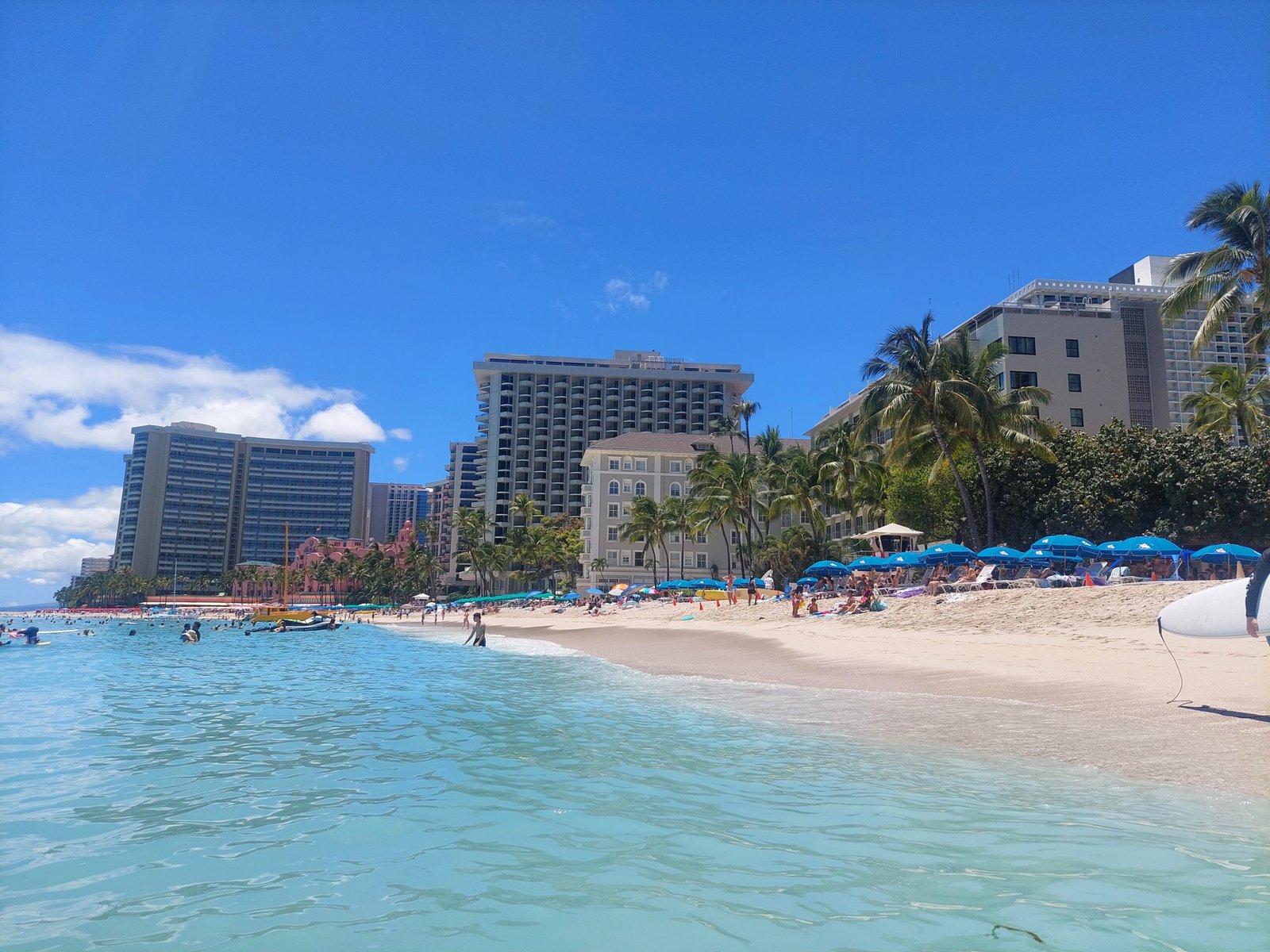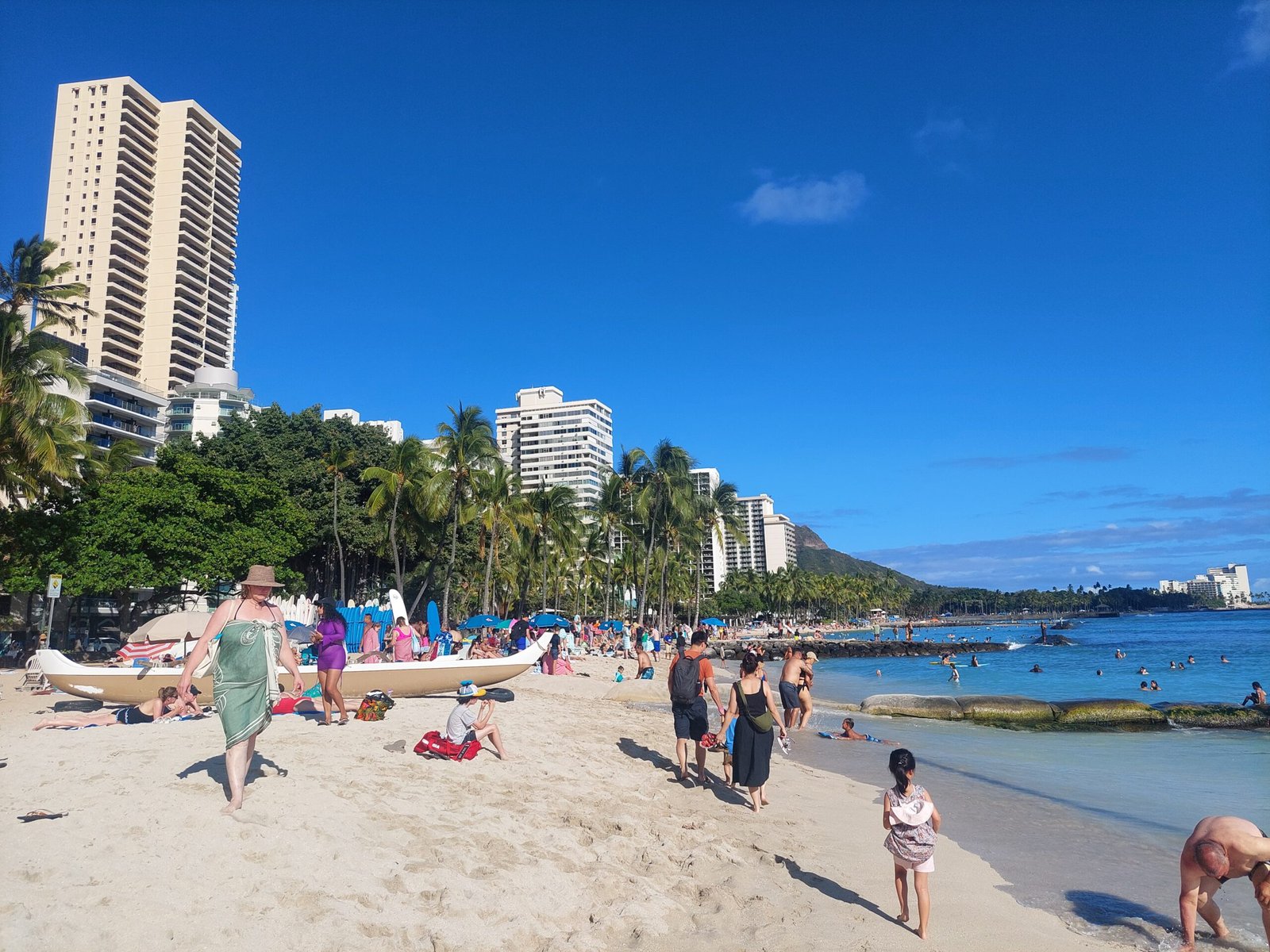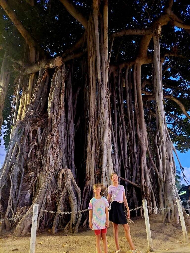 On the first day, we decided to immediately explore Honolulu’s famous Waikiki Beach, which is lined with several relatively expensive resorts. Our apartment had everything we needed for a day at the beach, so we packed our bathing suits, a cooler with snacks, beach chairs and a couple of surfboards for the kids. These surfboards were a shorter model that you lay on your belly and slide along the crest of the wave. There were also a couple of shovels for playing in the sand.