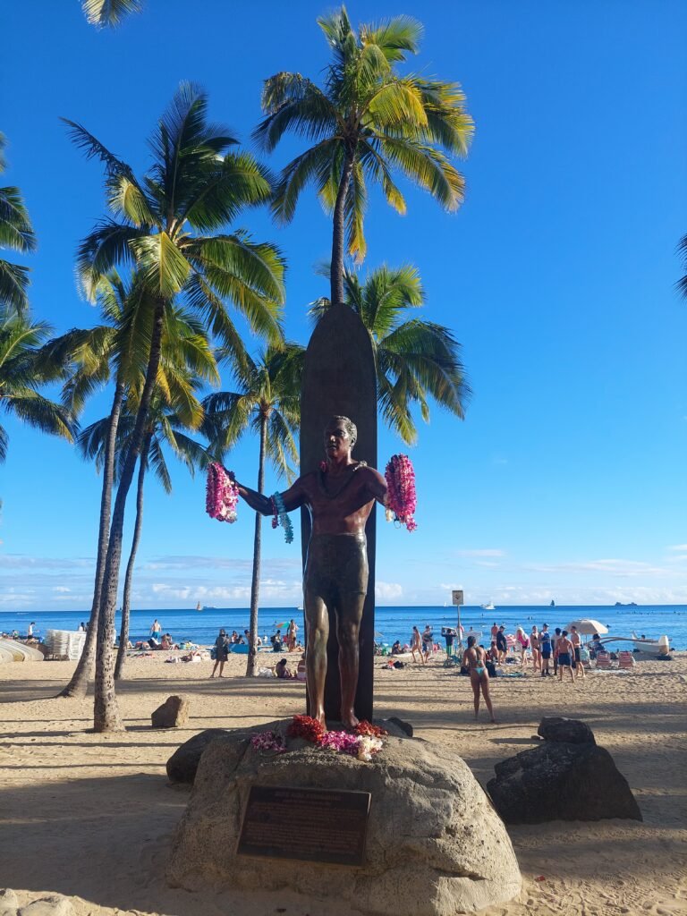 We set up camp right at the beginning of Waikiki Beach in front of the statue of Duke Kahanamoku. Duke Kahanamoku is the “father” of modern surfing, having learned to surf on Waikiki Beach himself. He later taught new enthusiastic surfers there. Apparently, this guy is something of a legend in the surfing community. The name didn’t mean anything to us.