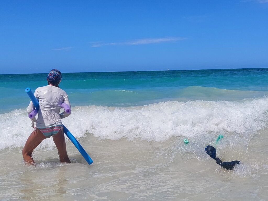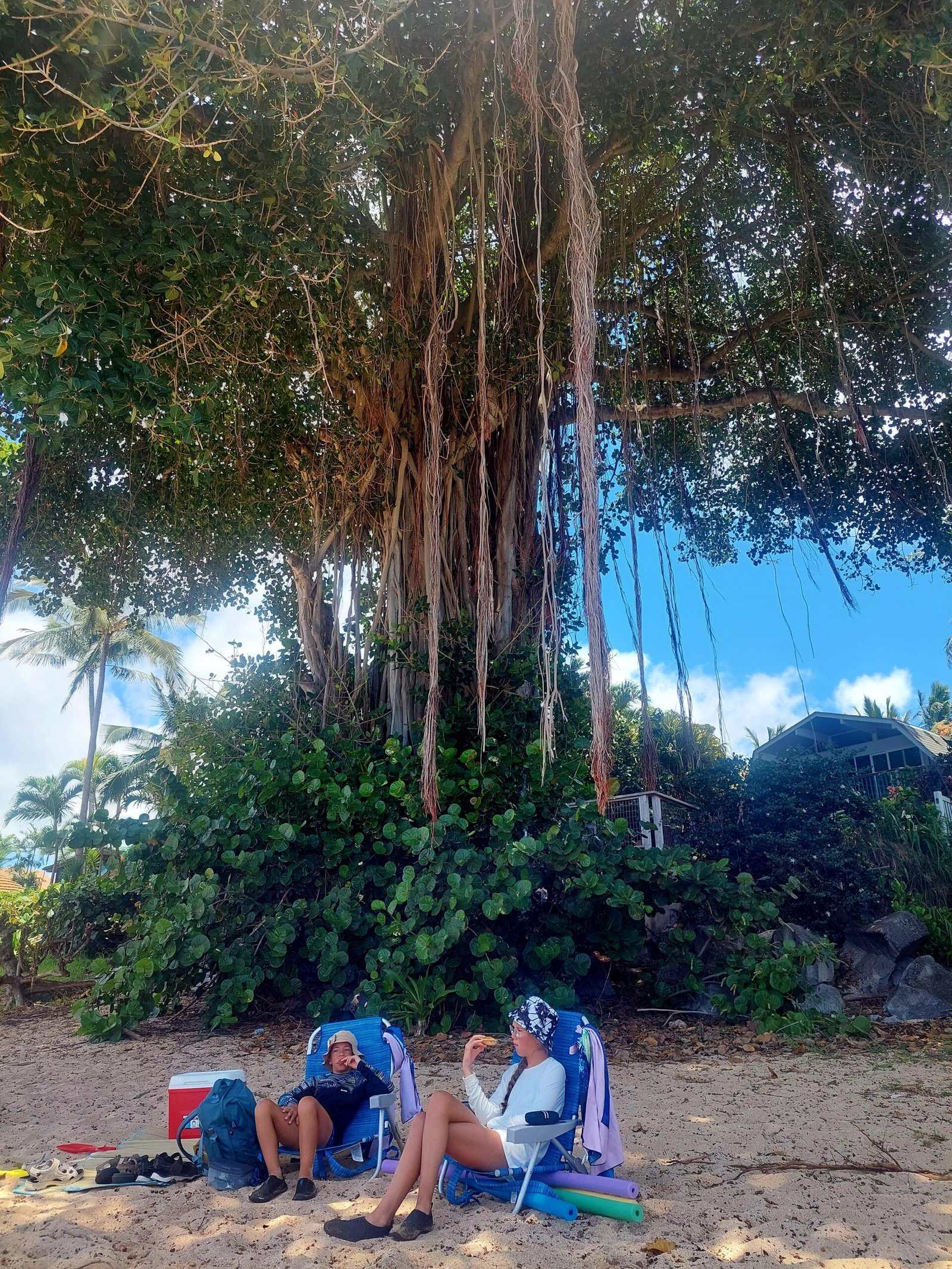 Luckily, our beach chairs were the kind you could carry on your back, so we didn’t mind having to walk some distance back along the beach to find a suitable shady spot under the palm trees. We also had to get to a part of the beach where there was no breakwater, otherwise the children would not have been able to play in the waves on their body boards.