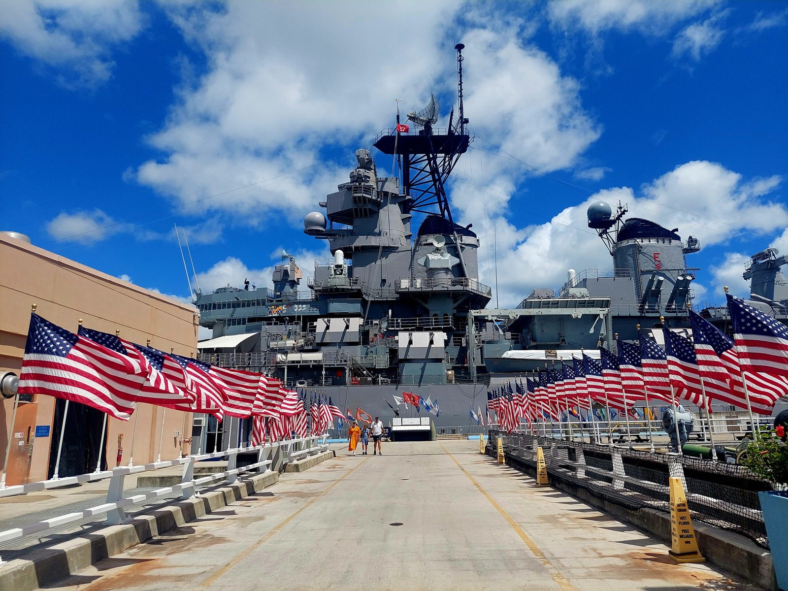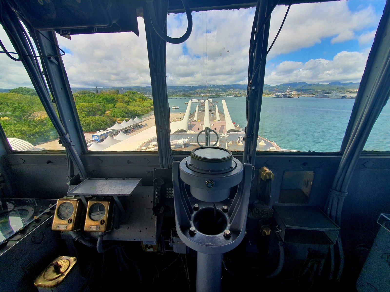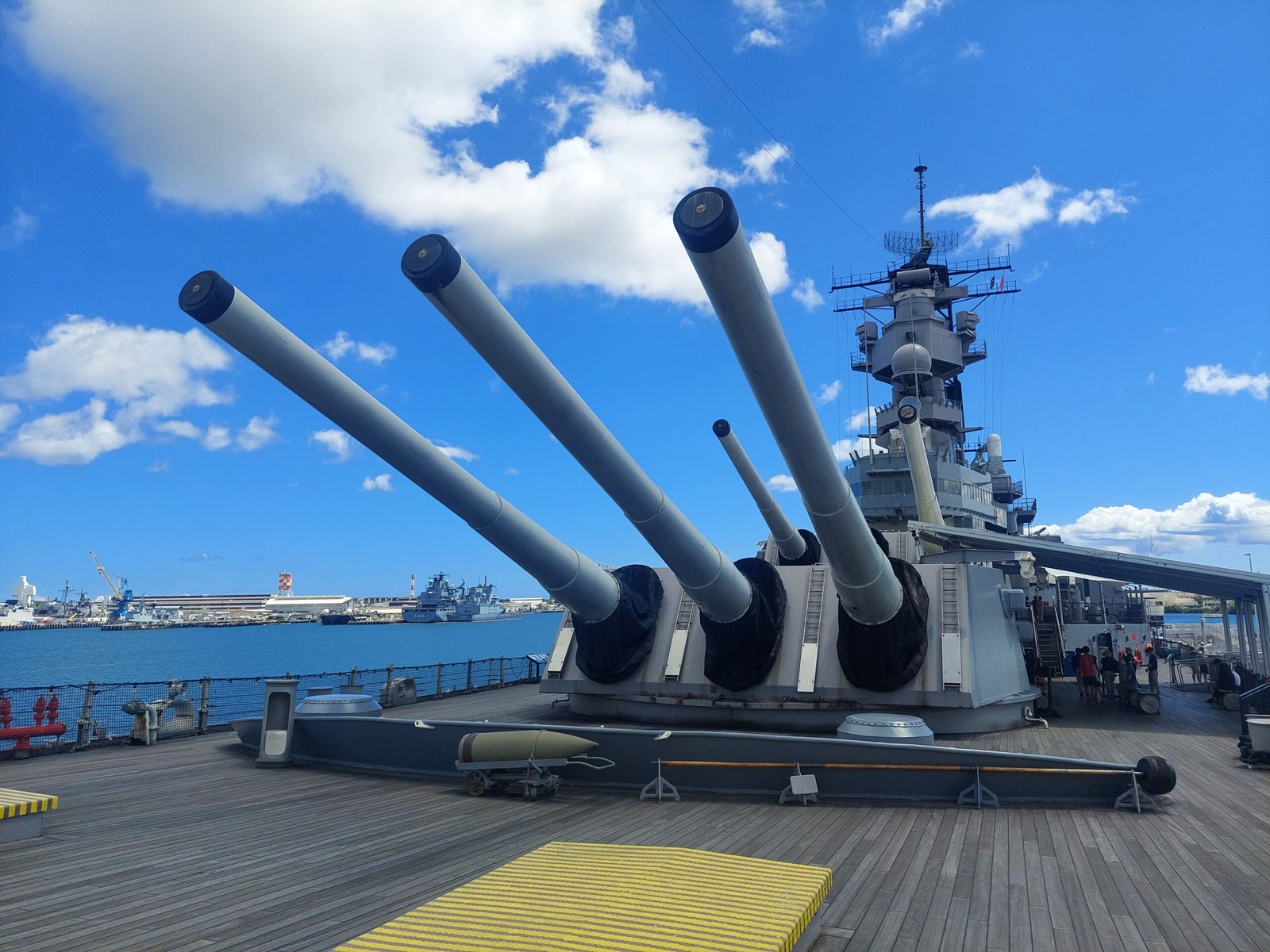 It was actually quite incredible that we found ourselves in this situation. Nowhere does it say when you buy tickets that you have to go through an active military base to get on board. Understandably, people moving around there have to carry ID, but none of us were getting off the bus before boarding the ship. Apparently this random check, and the requirement for ID, came as a surprise even to the bus driver, because she was very confused and asked what this was all about. After a moment of confusion, the police told the driver that, in principle, they should refuse entry to all undocumented persons. However, we were allowed to continue our journey, and eventually made it to the deck of the USS Missouri.