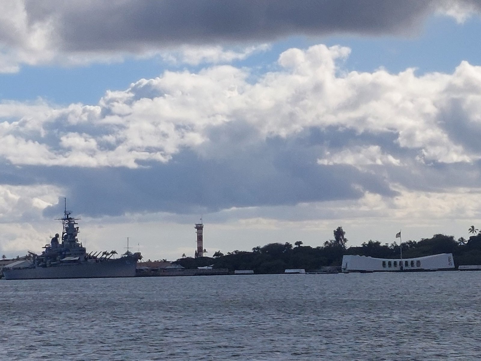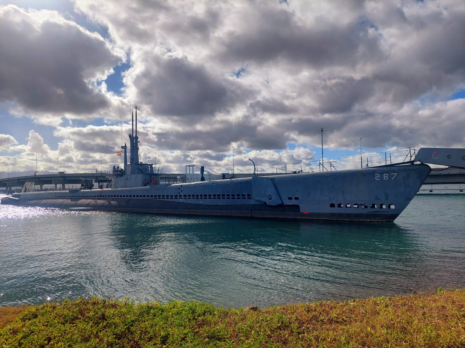 A free shuttle bus took visitors from Pearl Harbor to the USS Missouri. The ship was located on Ford Island, which was reached by crossing a bridge. As this was the entrance to an active military base, the bus was stopped before entering the island. Apparently, normally the bus driver just checks in at this point and continues on his way, but this time two police officers boarded the bus. They said it was a random anti-terrorist check and everyone had to show their IDs. Of course, most didn’t have them (including Jaana and the kids), because you are not allowed to take any bags, not even handbags, to the Pearl Harbour Memorial Site. So Jaana had left her own handbag in the car (there was a paid bag park in the area), and had only taken her phone. Many other travellers had done the same.