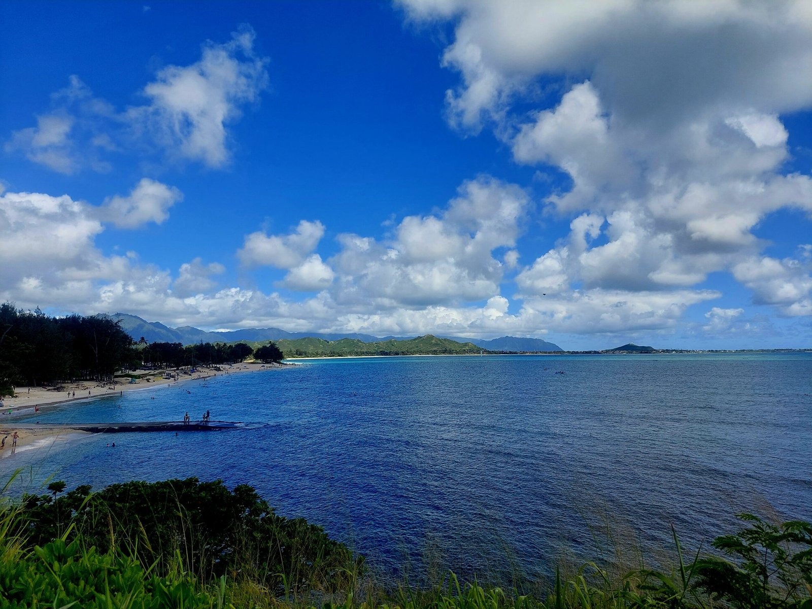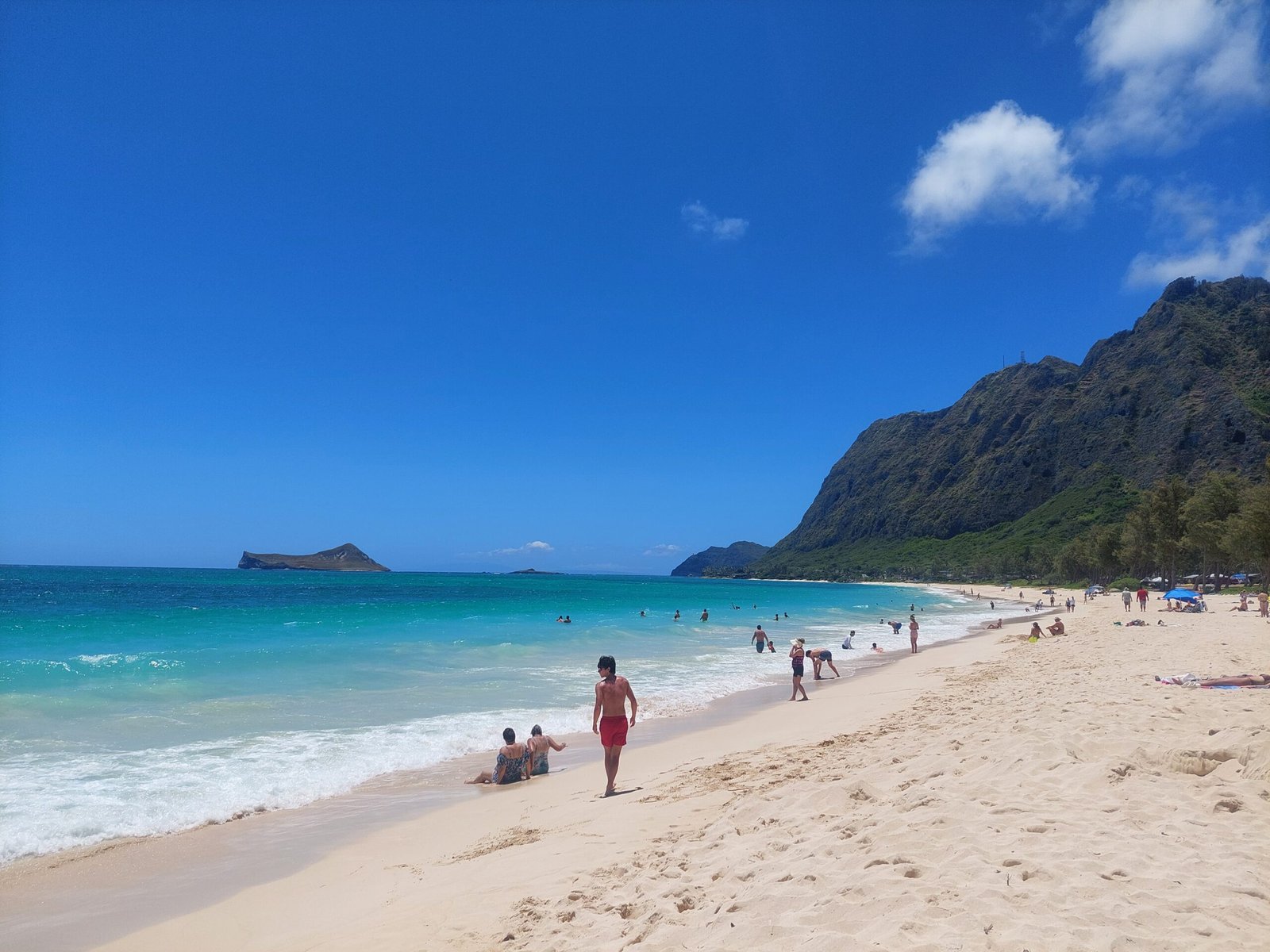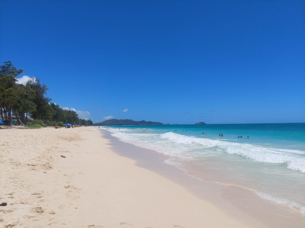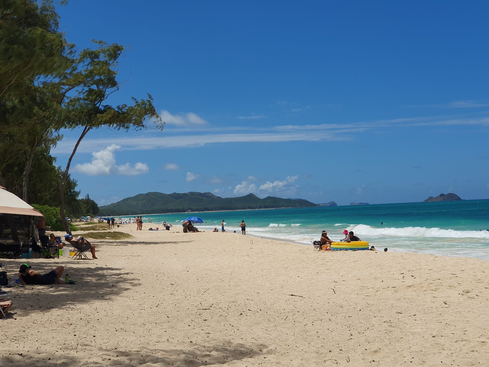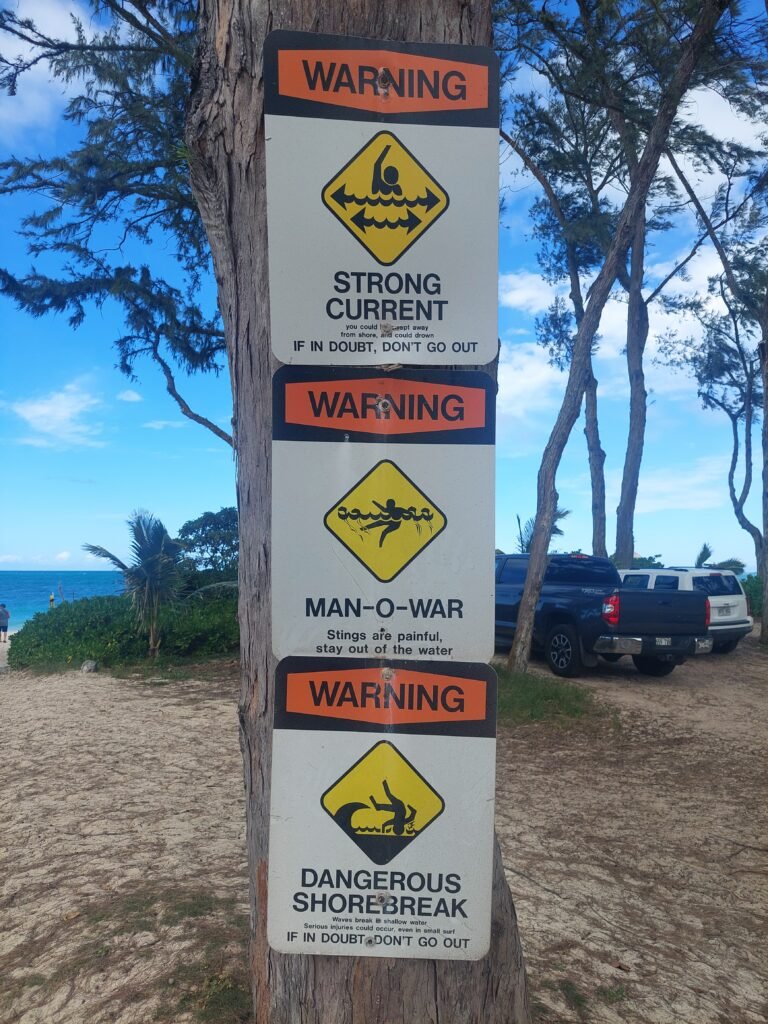 Sunday was also a beach day. This time the destination was Waimanalo Beach on the east coast of the island. It was a half hour drive, but as the island is relatively small, nothing here is too far away after all. This time there was a car park on the beach, so we didn’t have to carry our stuff very far. This 5 mile stretch of white sandy beach was stunning though. When we got there, we were met by several warning signs, but despite them, the beach was crowded, so we headed there too. The beach was lined with large trees, so it was a good place to spend a day at the beach. We thought we were well equipped, but we were certainly outdone by many. Some families had barbecues and beach chairs. One family had brought a covered playpen for their baby, and another family had brought an inflatable pool for their toddler, which they filled with seawater. Apparently they did not trust that their child would be able to play safely enough in the waves.