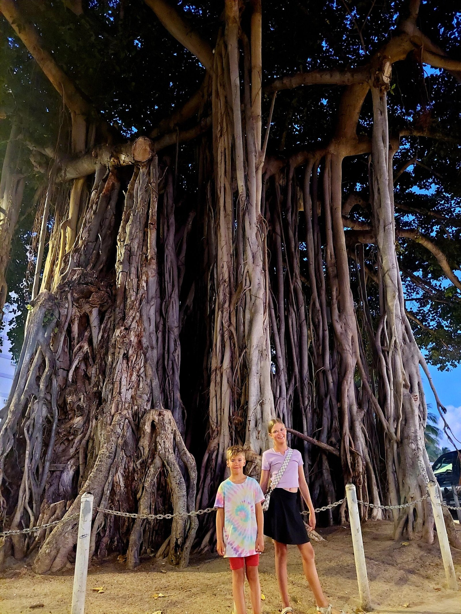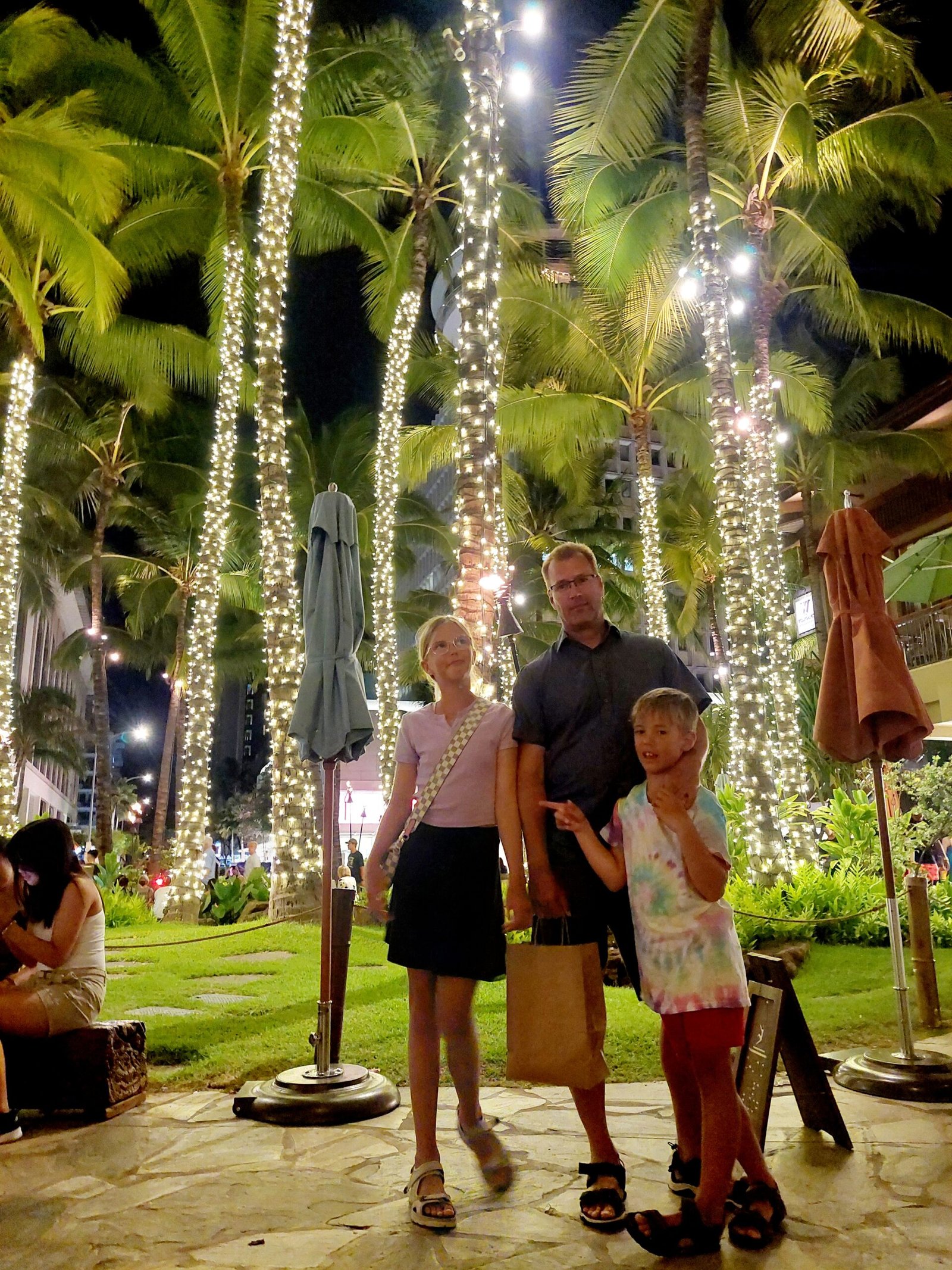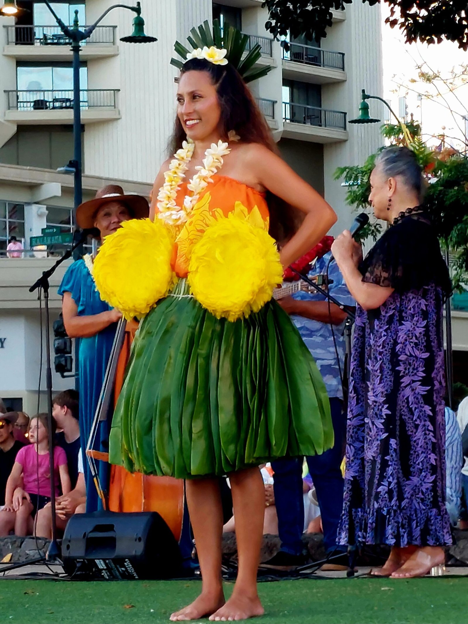 Because the beach was so nice for snorkelling, we stayed there a little longer than we had originally planned. So we were almost in a hurry to eat before we went to Waikiki Beach in the evening to see the free Hula dance show. The show takes place there twice a week, on Tuesdays and Saturdays. We went to see the show especially at Ronja’s request. After the hour-long show, she said she had really enjoyed the dances. She also thought that, at least in terms of hair length, she could have easily joined a hula dance group. Apparently, it is traditional for a dancer to have long hair. Although, at the very beginning, the dancers were men and boys, as it was not considered appropriate at the time to allow girls to dance.