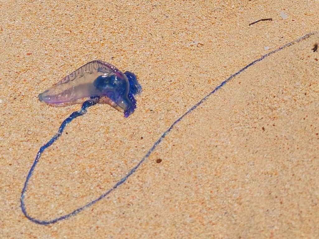 As the day passed, we realised that the warning signs on the beach were not there for nothing. Of course, we had already seen the waves, and we always take warnings about sea currents seriously. A little later we also saw a Portuguese warship washed ashore and a moment later we saw another one. This species of polychaete stingray looks like a single mollusc, but it is not an individual, but a colony of several specialised polychaetes. Its tentacle burns, but fortunately the hit is rarely fatal to humans.