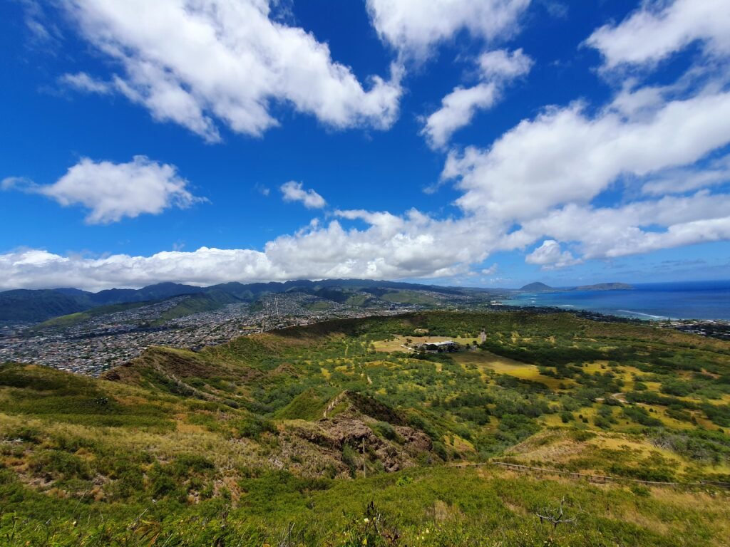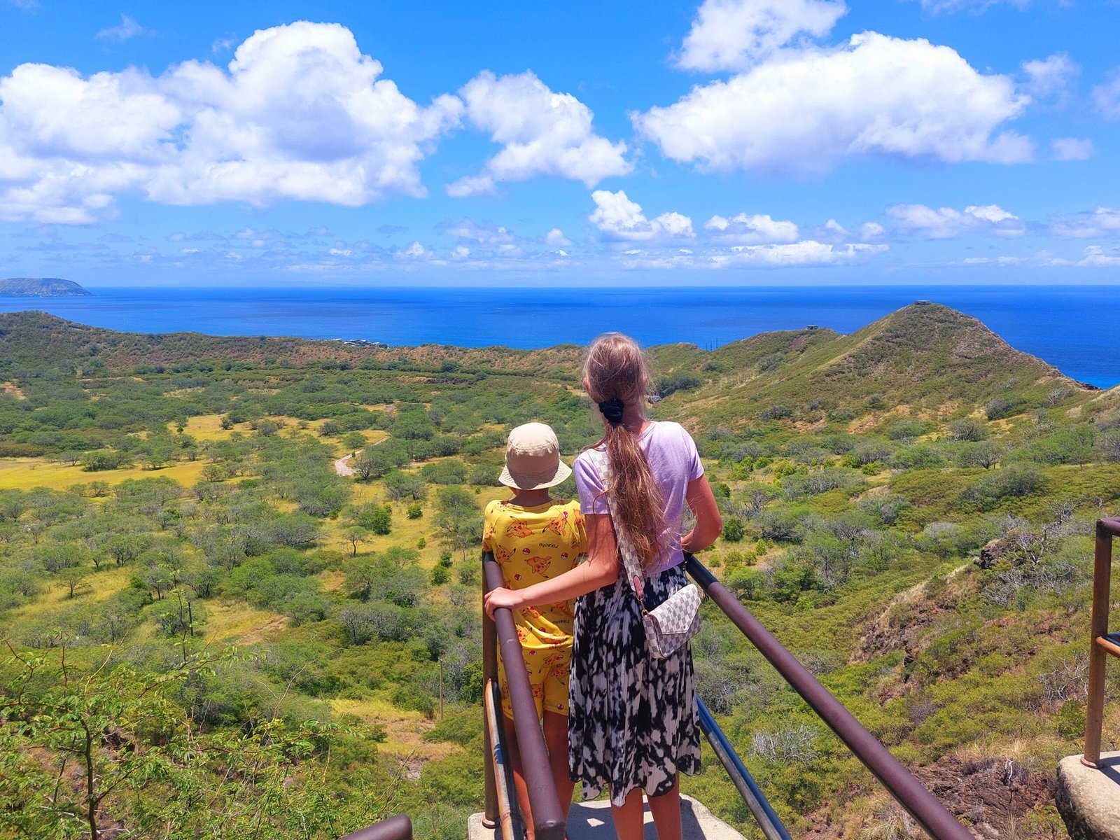 Since we still had plenty of time before we had to return our rental car, we decided to go for a drive in Hanauma Bay. We wanted to see what kind of snorkeling spot we had missed. We knew that you can’t snorkel in the area on Mondays or Tuesdays, but we thought we could still drive there to see the scenery. Turns out we were wrong. A guard was waiting at the park gates to inform us that it was not possible to enter the park at all, and that it was not possible to visit the cove formed by the volcanic crater. So we dutifully turned back, and stopped immediately at a lookout on the other side of the road, with views in the other direction. There we overheard a local woman telling a friend how there was a fitness trail up nearby Koko Head hill, and how spectacular the views were from the top of the hill.