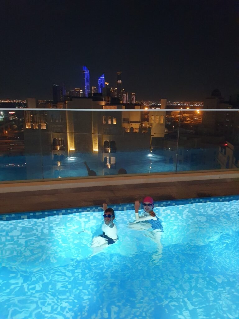 In the evening the kids went for a moonlight swim at the rooftop swimming pool. Then it was time to go to bed again.