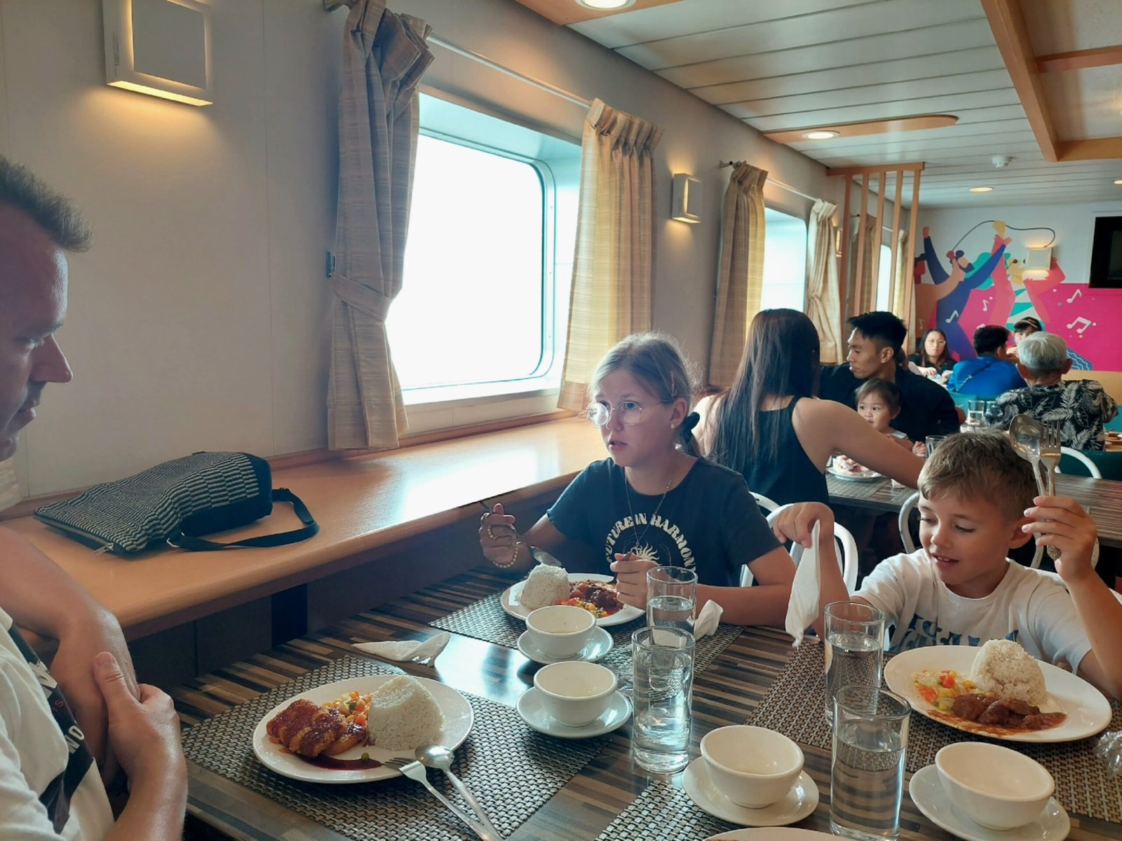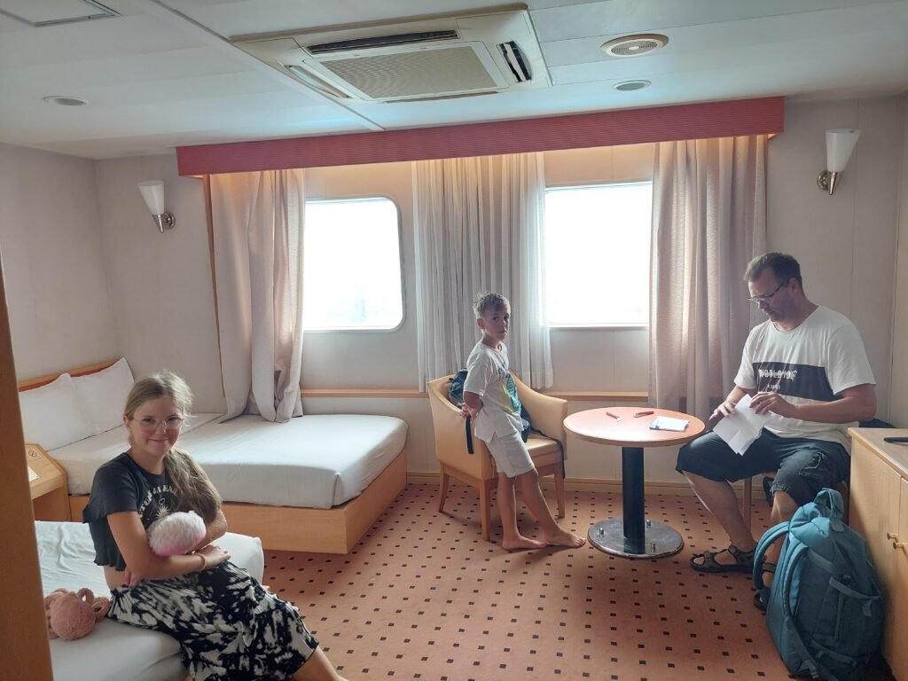 For the night Jaana and the kids stayed in the state room, and Marko walked downstairs to his business class single cabin. The pillow and the bedsheet were included, but Marko had to rent his blanket for 50PHP (less than one Euro)