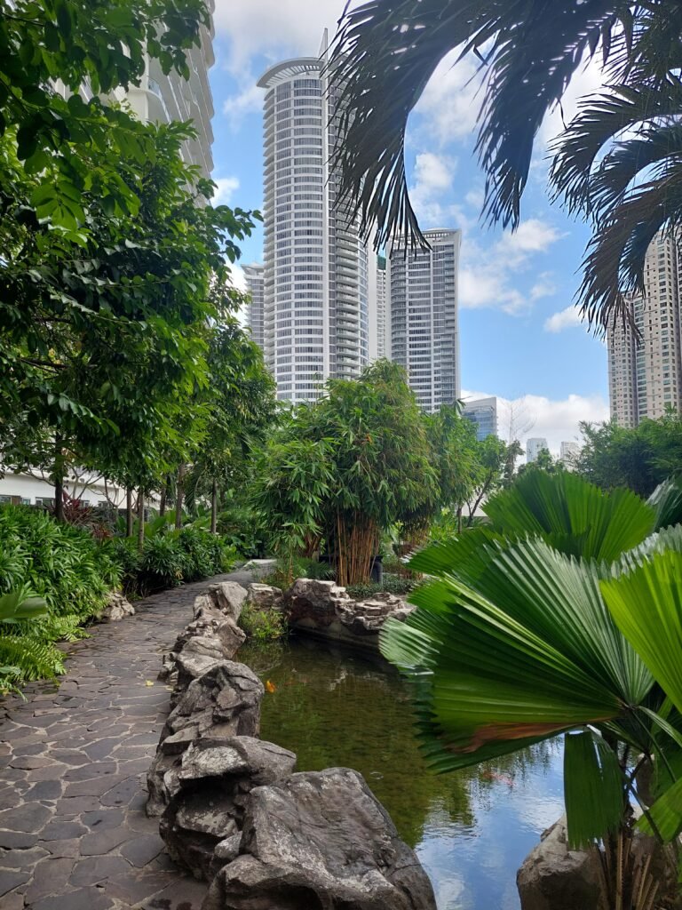 The housing compound is nice and strictly guarded. The guards monitor even the elevators. Once Jaana was coming from the pool wrapped in a towel, we heard the security guard’s voice in the elevator saying “Madam, next time you need to wear a dress. Now it’s ok, but next time not.” (We’re assuming it means, that Jaana would be fined if caught wearing a towel in the lift the next time.) There are restaurants, cafes, a couple of small grocery stores, a pet shop, barber and even a kindy within this area. Since Manila isn’t famous for its greenery, there is also “a secret garden” between the towers, where you can go out for a walk if you like. So far this seems to be a nicer area to live in than the one where we stayed the night when we arrived to the Philippines for the first time.