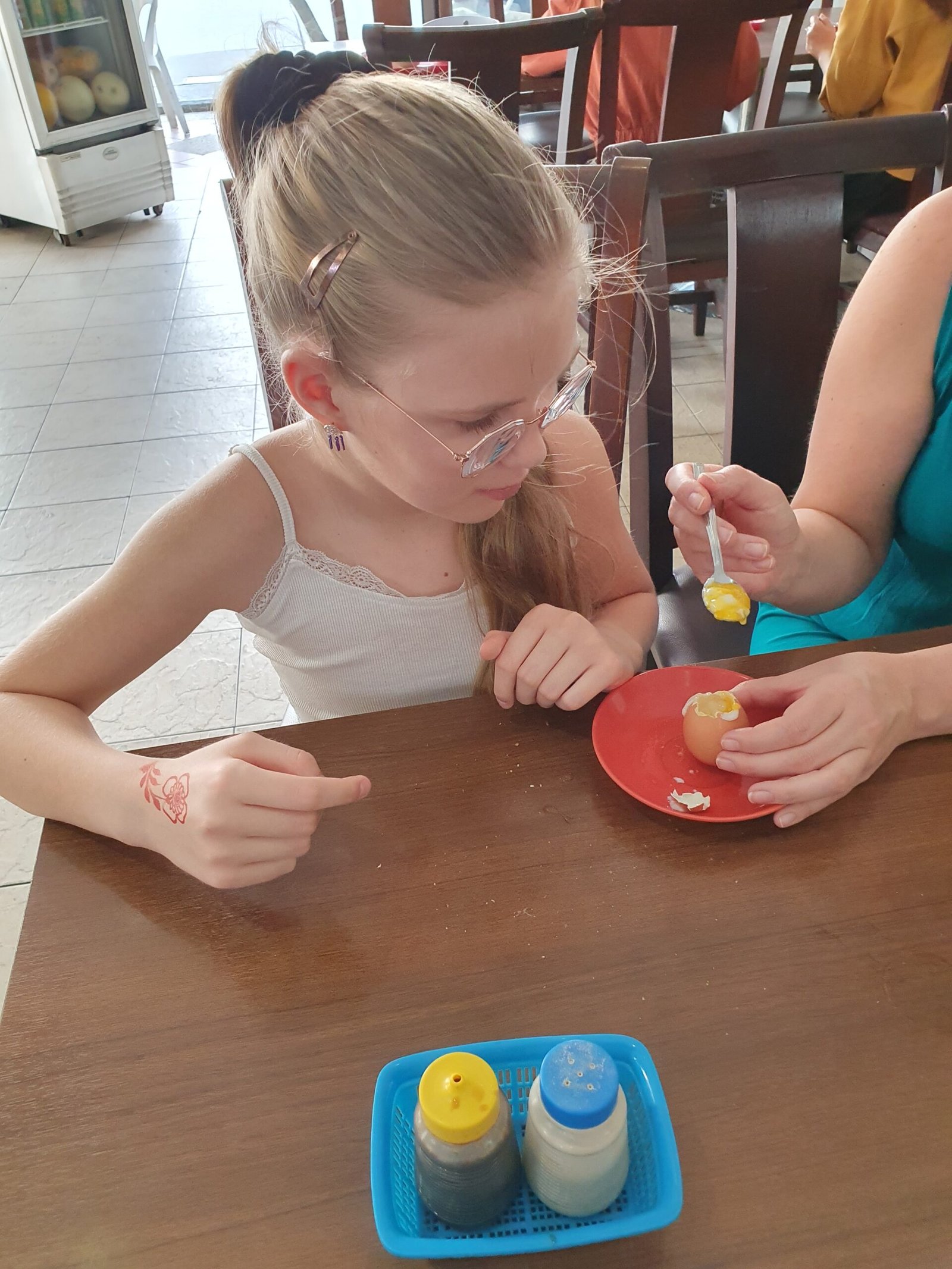 The next day we had breakfast at one of the local food stall. Eventually we ended up buying just toast and eggs, because all the other items there were somewhat unknown to us. The eggs were boiled by pouring hot water on top of the eggs in a plastic bowl. When the water got cold, the lady replaced the water with hot one. The result wasn’t even close to hard-boiled eggs, but we got spoons to tackle with them.