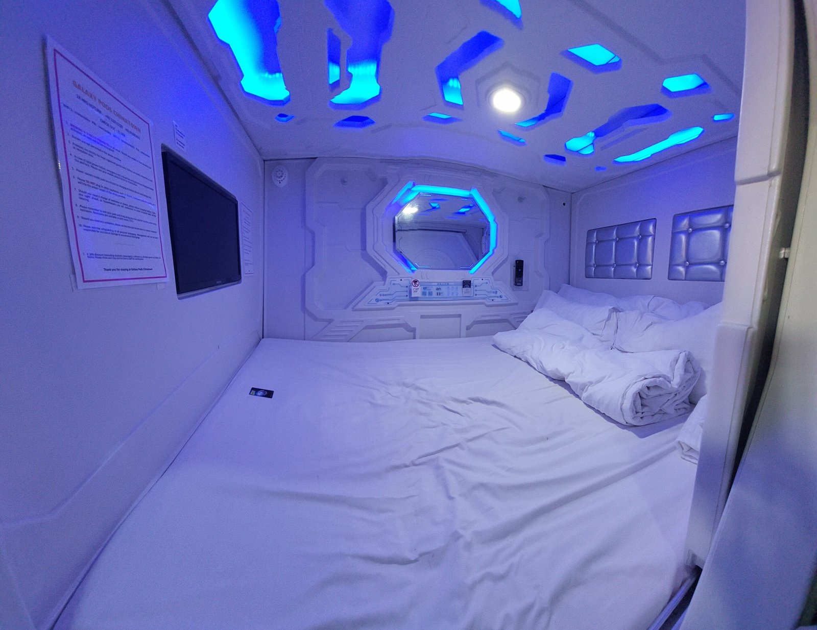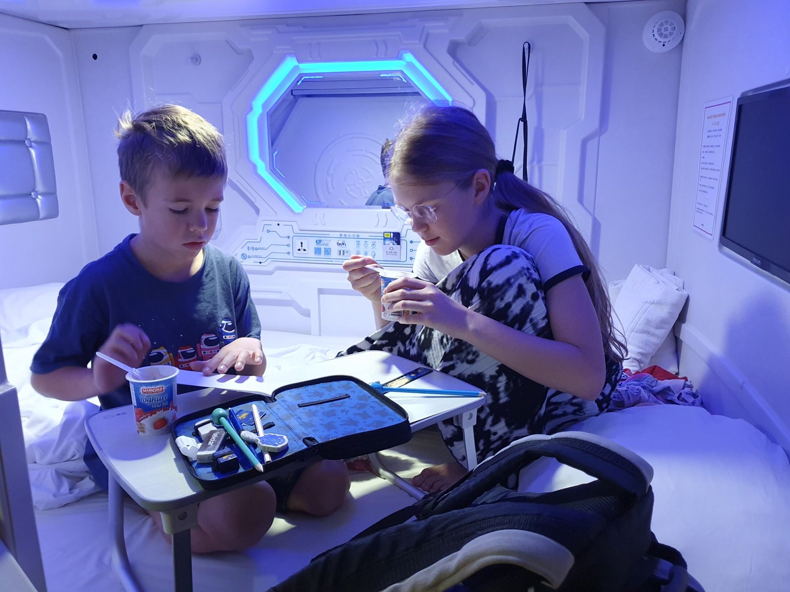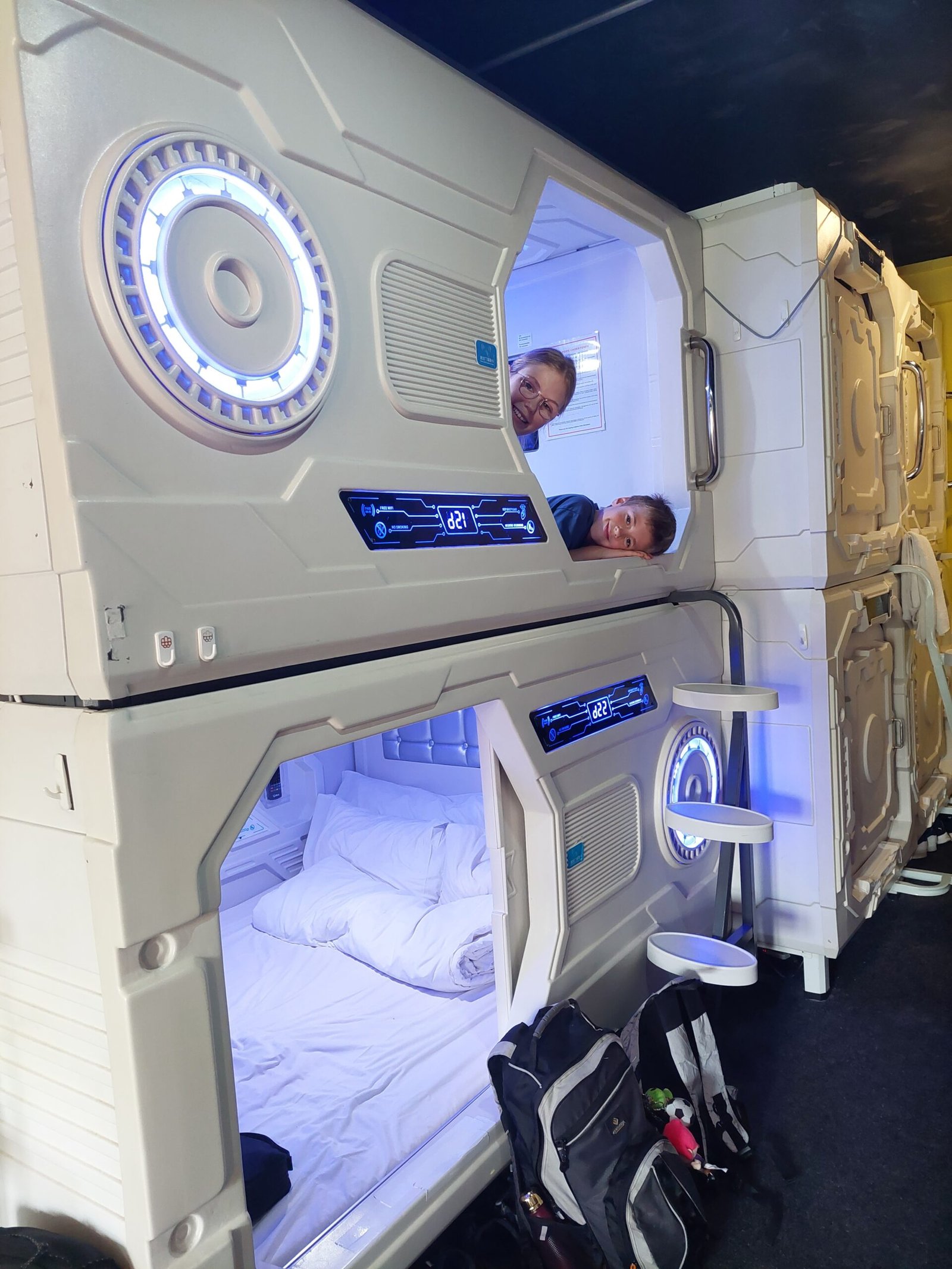 The Galaxy Pods looked like little space ships. There was even a button for space light mode, which the kids chose, of course, and insisted on also sleeping in that blue light. There was a little table attached to the wall of the pod, and also a TV. We didn’t check on the TV though, but I guess we didn’t miss out on anything. Even though the pods looked like spaceships, inside wasn’t as quiet as in space. You could hear the karaoke version of “I did it my way” sung in the bar downstairs even through your ear plugs. The place had shared bathrooms, and since the toilet and the shower were in the same space, the toilet was sometimes very wet.
