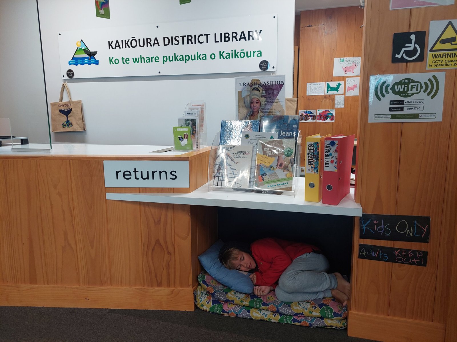 The next morning it started to rain in Kaikoura and it continued to rain the whole day. To make matters worse, the electricity at the campsite was out until the late afternoon, so we all went to the Kaikoura library. The library was very well equipped. At first we did some school work with the children, but they also had time to do other things in the library too. Ronja especially enjoyed the library visit.