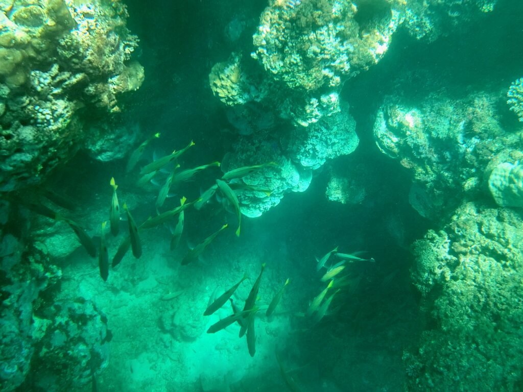 The next day we were wiser and went snorkelling right after breakfast. The reef had a very strong current in places. It can quickly carry you far away if you’re not careful. Fortunately, however, this current does not go out to sea, but sideways along the beach. We snorkelled together for an hour. We saw lots of different colourful (and not so colourful) fish. Many were quite small, but there were a few larger fish too. The corals, on the other hand, were not very colourful here, but mostly brownish. We were told that the reason for this is the strong tides, which almost always expose the corals when the tide is at its lowest. Then you can even walk to the outer edge of the reef with almost dry feet if you wish.