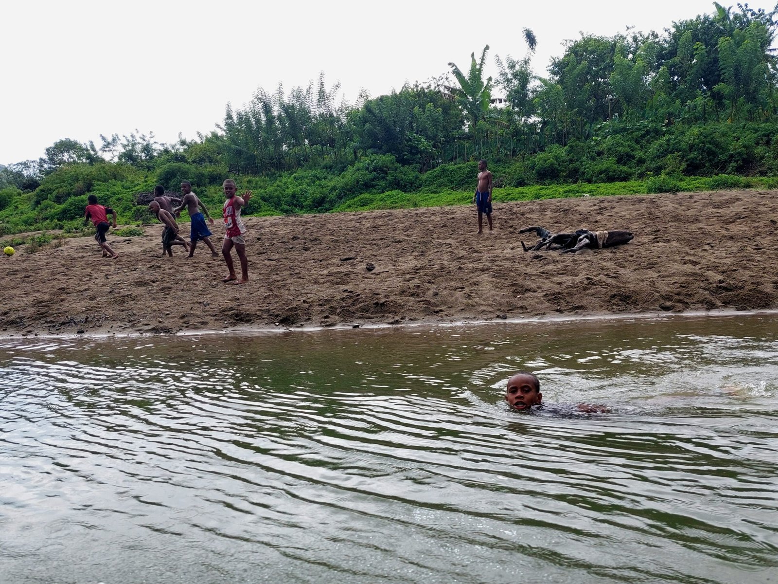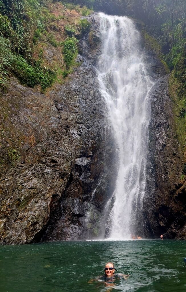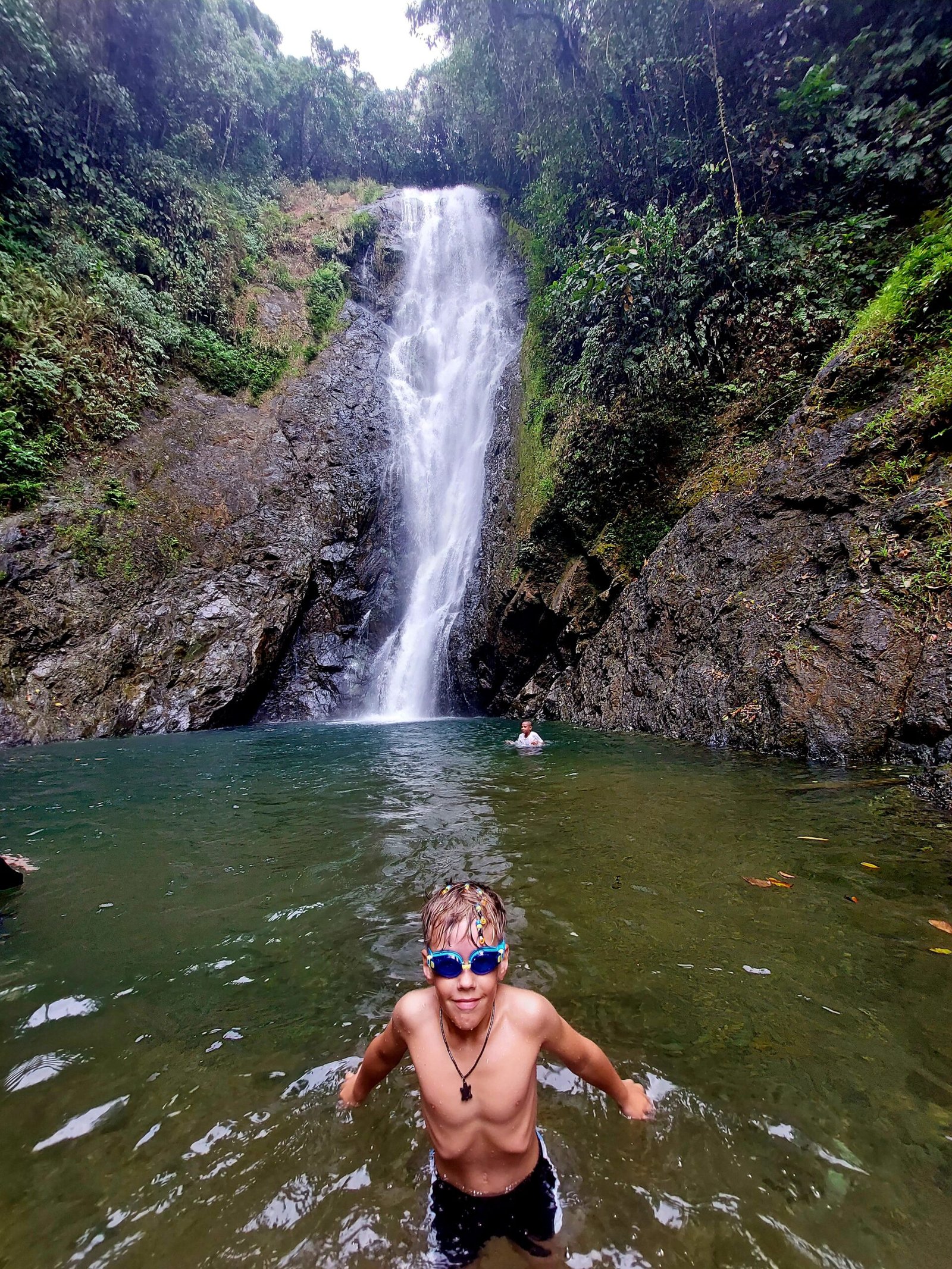 After a delicious lunch, we set off on a boat towards the waterfalls in a heavy downpour. The rain didn’t matter as we were all wearing nothing but our swim suits. The rain was also really warm. As we cruised along the river, we saw locals playing, fishing, swimming and herding their cows along the river banks. We saw a couple of diggers in the river too. They were digging out stones and gravel from the riverbed for a new section of road somewhere nearby.