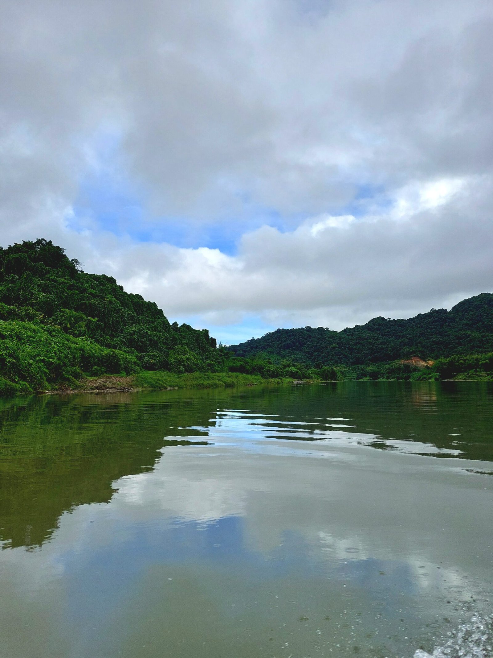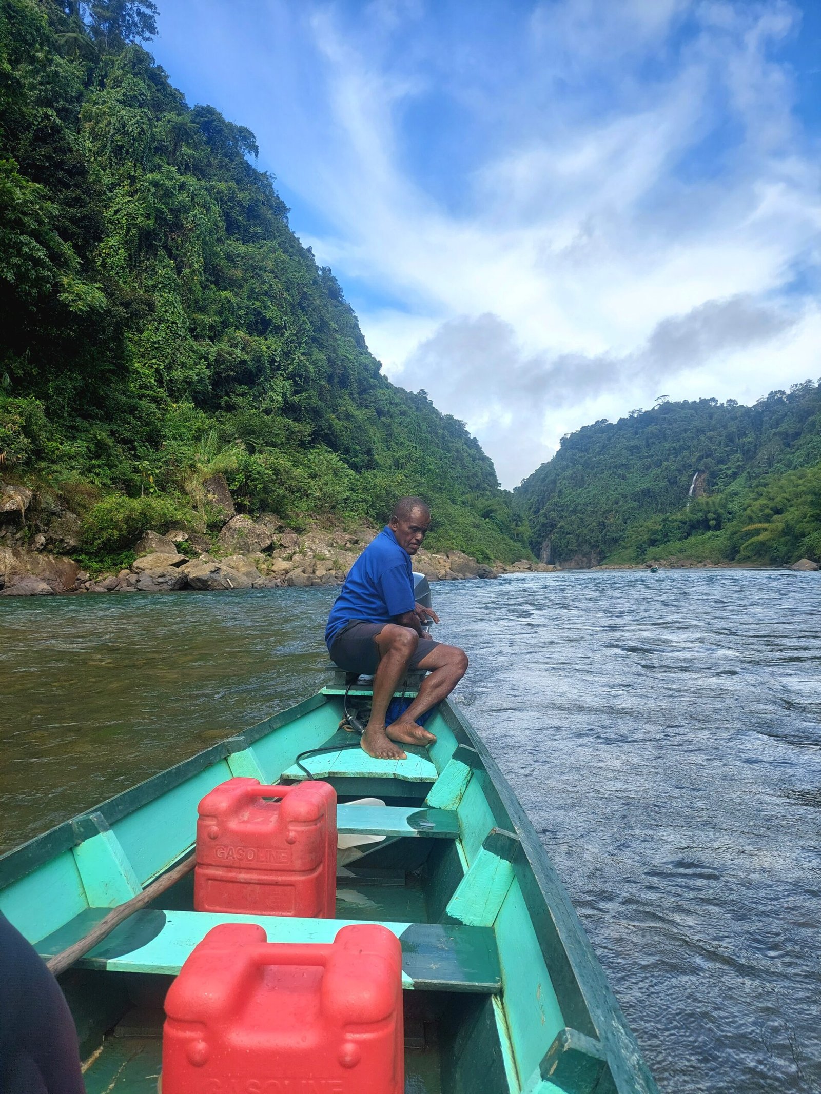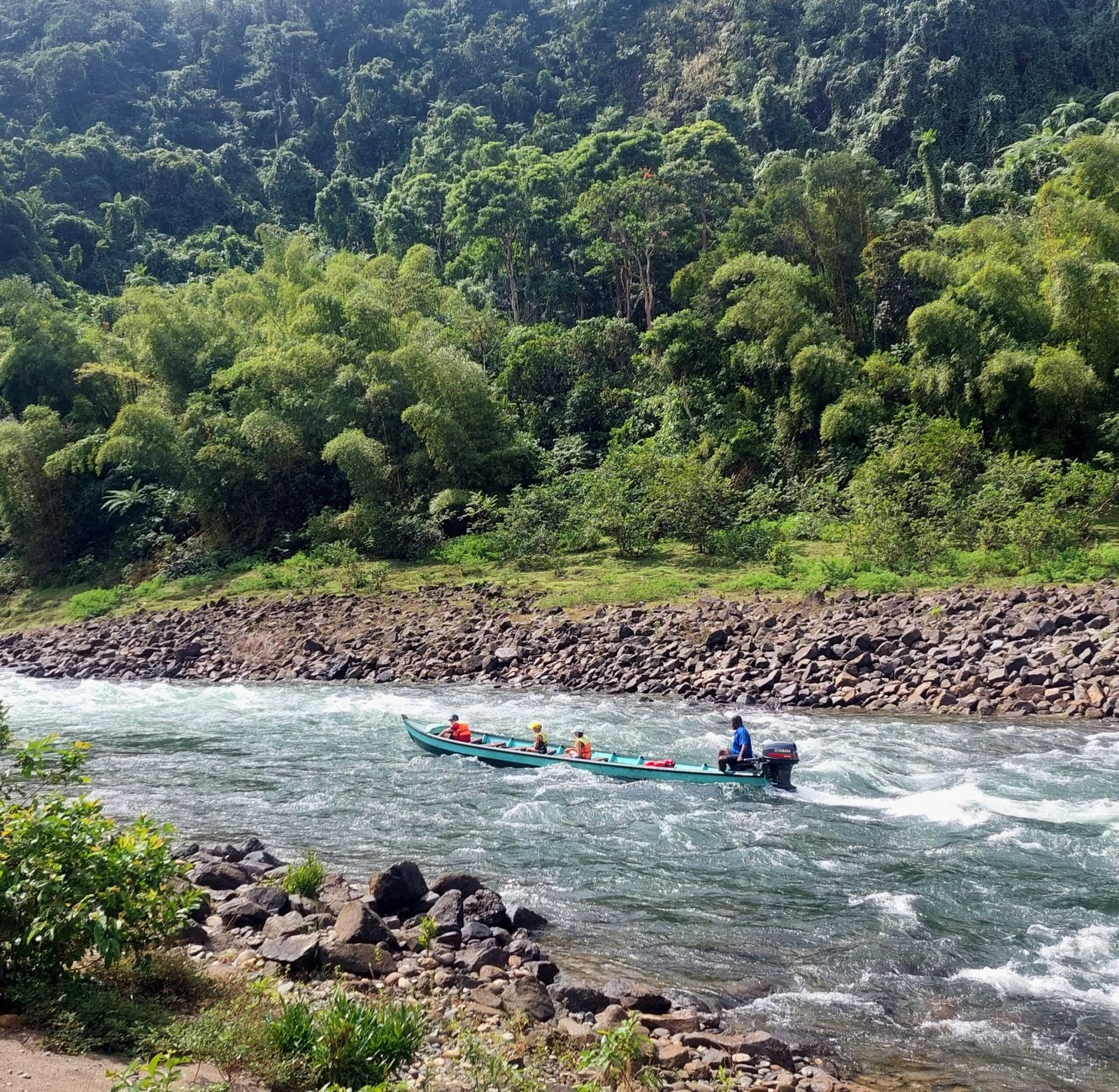 After a delicious lunch, we set off on a boat towards the waterfalls in a heavy downpour. The rain didn’t matter as we were all wearing nothing but our swim suits. The rain was also really warm. As we cruised along the river, we saw locals playing, fishing, swimming and herding their cows along the river banks. We saw a couple of diggers in the river too. They were digging out stones and gravel from the riverbed for a new section of road somewhere nearby.