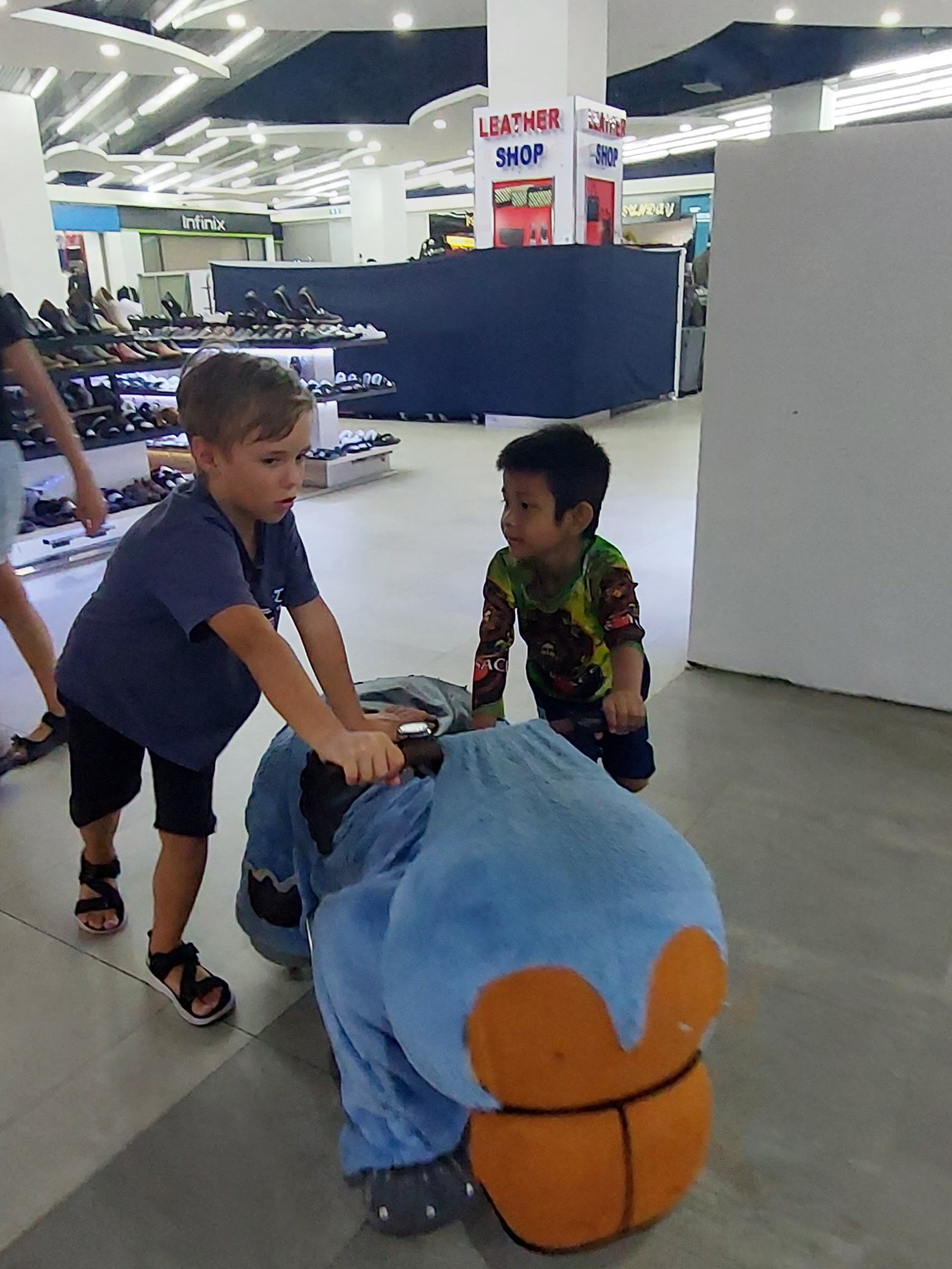 From the temple, we continued by tuk tuk to the local mall. It was several floors high, but inside it was very empty. On one of the upper floors we found a small indoor playground where both children went to play for a while. You could also buy tokens for some kind of electric animal scooters. At first, the kids were driving together around the mall, but then Risto picked up a local little boy, and Ronja followed them on foot.