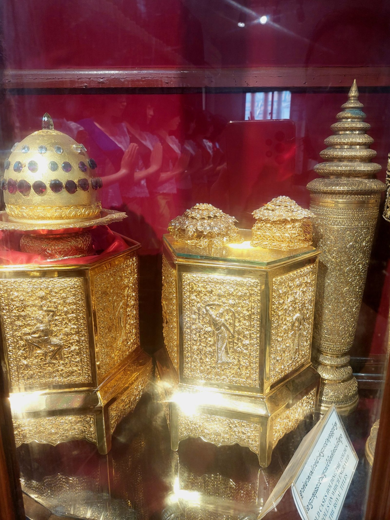 Tourists were allowed in to the Silver Pagoda in the grounds of the palace, so we went there next. The name of the building comes from the fact that its entire floor is made of 500 silver tiles. If you add up their weight, it’s almost six tons. The silver tiles were covered with thick red carpets, but some of them were left visible for tourists to admire. The pagoda also had a huge golden Buddha statue weighing 90kg. This gold statue was also decorated with 9,584 diamonds, so it was no wonder that there were guards on every corner. In addition to the silvery floor and the golden Buddha statue, there were many other silver and gold statues and artefacts on display in the pagoda. So we were practically visiting a huge treasury.