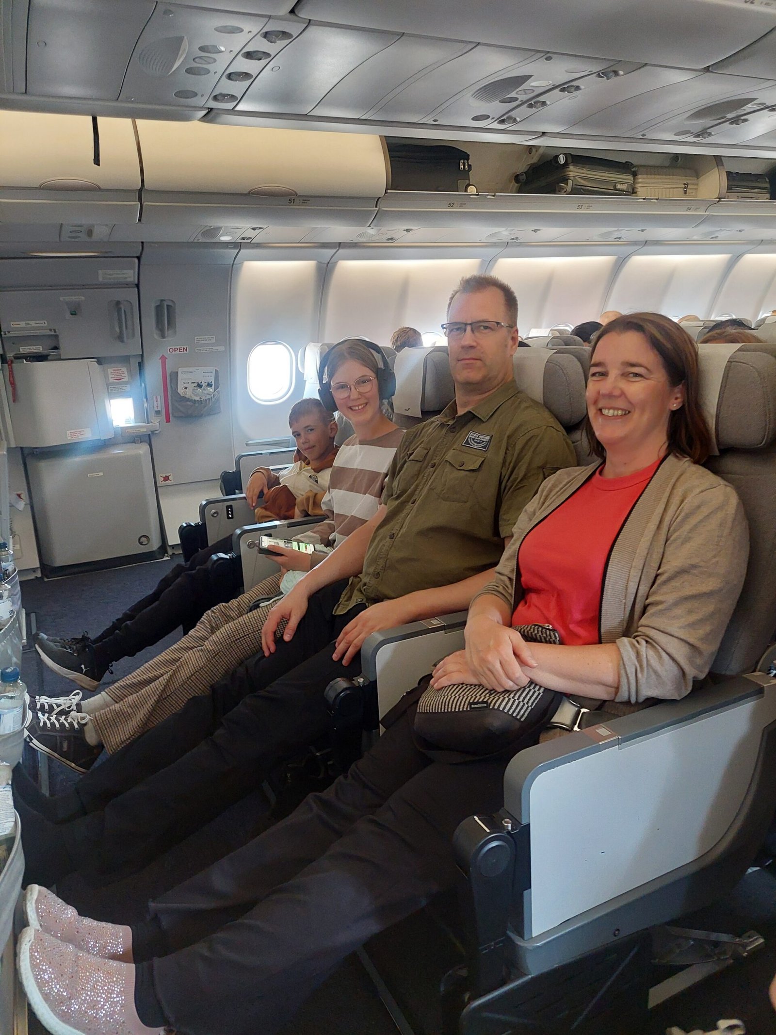Lähdimme reissuun heti koulujen päätyttyä sunnuntaina 1.6. iltapäivän lennolla Dohaan. Meillä kävi mieletön tuuri, sillä satuimme saamaan keskirivin ensimmäiset paikat, joissa oli huomattavasti enemmän jalkatilaa, kuin karjavaunun muissa istumapaikoissa. Tämä noin 6h lento menikin siis oikein mukavasti. Toisella lennolla Dohasta Kapkaupunkiin emme olleet yhtä onnekkaita, mutta onneksi kyseessä oli yölento, niin osa matkasta meni nukkuessa. Tällä jälkimmäisellä lennolla oli meille hienoinen yllätys, että koneen startattua joskus kahden jälkeen yöllä, siellä ryhdyttiin tarjoilemaan matkustajille päivällistä puolen neljän aikaan aamuyöstä. Me kaikki muut söimme kiltisti ruokamme, paitsi Risto, joka ilmoitti, että siihen aikaan hänellä ei ollut yhtään nälkä.