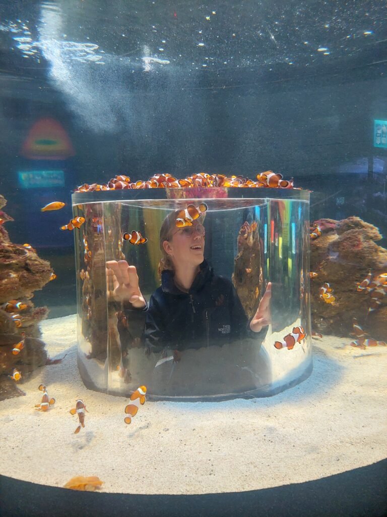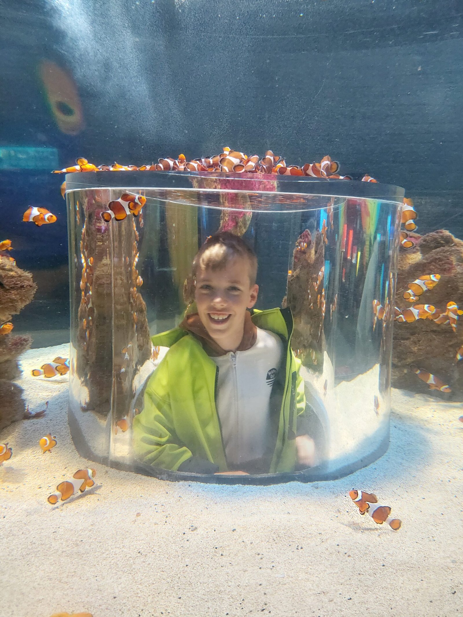 Seuraavana aamuna kaikilla olikin huomattavasti pirteämpi olo. Koska päivä oli pilvinen ja sateinen, mitään ulkoilma-aktiviteetteja ei kannattanut edes harkita. Niinpä suuntasimme Two Oceans Aquariumiin. Olimme käyneet siellä viimeksi silloin, kun Ronja oli vuoden ikäinen. Vuokkokala-allas, jonka sisälle pääsi kaloja ihmettelemään, oli paikan sisääntuloaulassa edelleen. Niinpä meidän oli ihan pakko ottaa Ronjasta uusi kuva sen sisällä kaloja ihmettelemässä. Tällä kertaa Ronja ylettyi jo ihan itse kurkistamaan luukusta kaloja, joten äidin nostoapua ei enää tarvittu.
