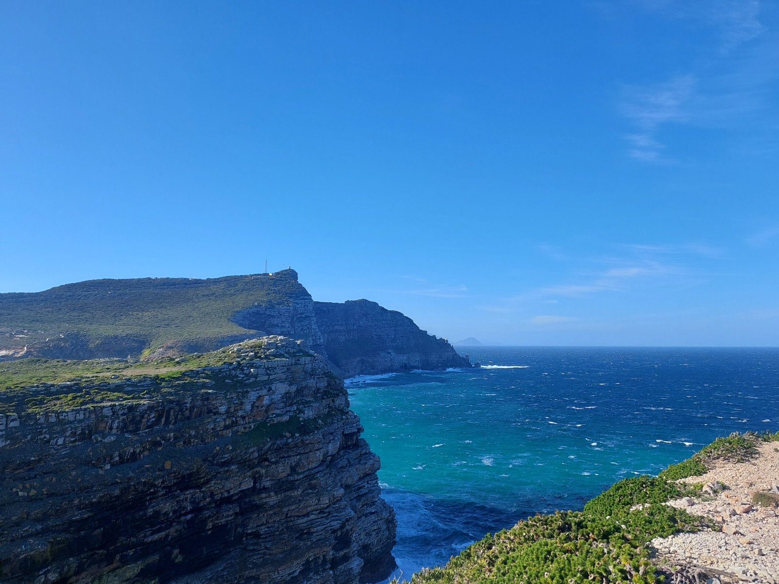 Pingviinien tarkkailun jälkeen hyppäsimme jälleen autoon ja hurautimme Hyväntoivonniemelle Afrikan lounaiskärkeen. Usein ajatellaan, että Hyväntoivonniemi on Afrikan eteläisin kärki, mutta eteläisin piste sijaitsee oikeasti Cape Agulhas -nimisessä niemenkärjessä. Otettuamme pakolliset valokuvat kyltin luona, lähdimme kävelemään 45min pituista reittiä pitkin Cape Pointin majakalle. Maisemat reitin varrella olivat huikeat. Navakka tuuli ja kivikkoinen maasto tekivät kävelystä asteen verran jännittävämpää. Oppaamme tuumasikin, että onneksi tuulee mereltä päin, ettemme putoa tuulen mukana alas aallokkoon. Hyväntoivonniemen luonnonpuistossa elää myös strutseja ja Etelä-Afrikan suurin antilooppilaji, hirviantilooppi. Sean kertoi, että tämän eläimen säkäkorkeus on 190cm, joten ihan mistään pikkuelukasta ei ollut kyse. Näimmekin tällaisen juuri vähän ennen, kuin saavuimme majakan luokse. Onneksi antilooppi tajusi pysyä vähän kauempana, eikä meidän tarvinnut kokeilla, kumpi juoksee lujempaa – ihminen, vai se. Antiloopin lisäksi näimme jonkin pienen mustan liskon, mutta strutseja emme tällä kertaa nähneet.