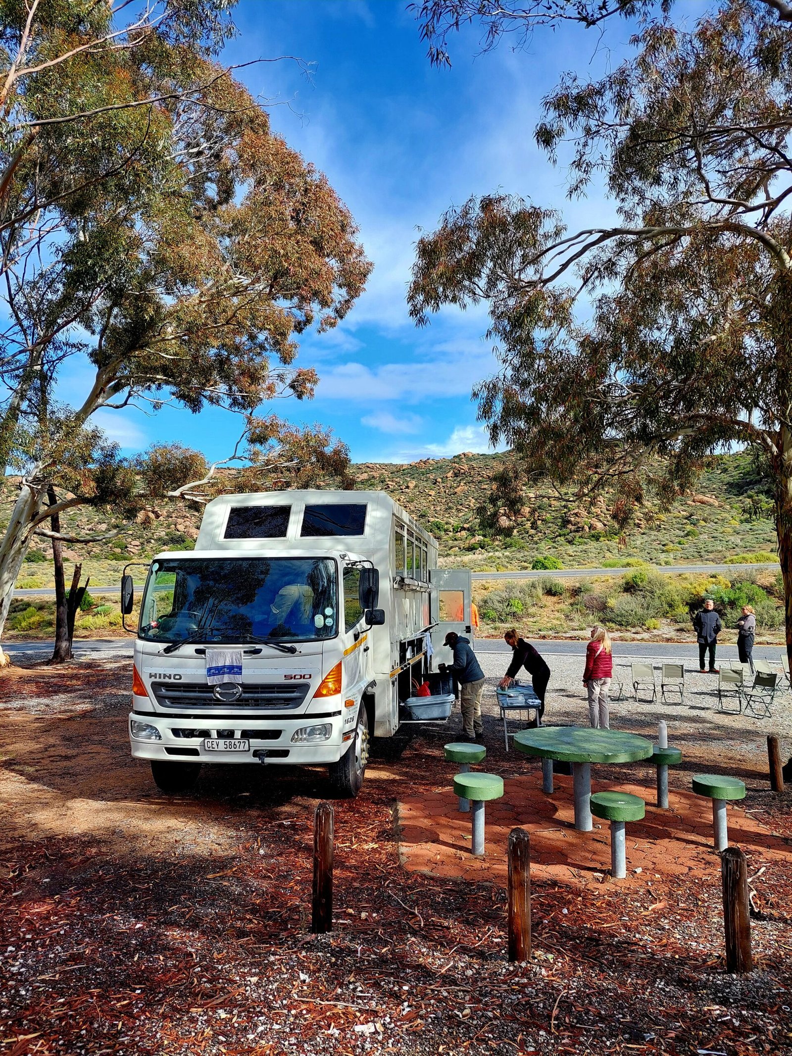 Sateen saattelemina lähdimme lauantaina kuorma-autollamme matkaan Kapkaupungista klo 8:00 kohti Namibian rajaa. Meistä oli aika yllättävää, että pysähdyimme ensimmäiseksi yöksi jo vain parin tunnin ajomatkan päähän Kapkaupungista. Yövyimme Marcuskraalin sitrushedelmäfarmilla, joka majoittaa myös jonkin verran satunnaisia matkalaisia. Pääelinkeinona heillä on kuitenkin sitrushedelmien kasvattaminen.