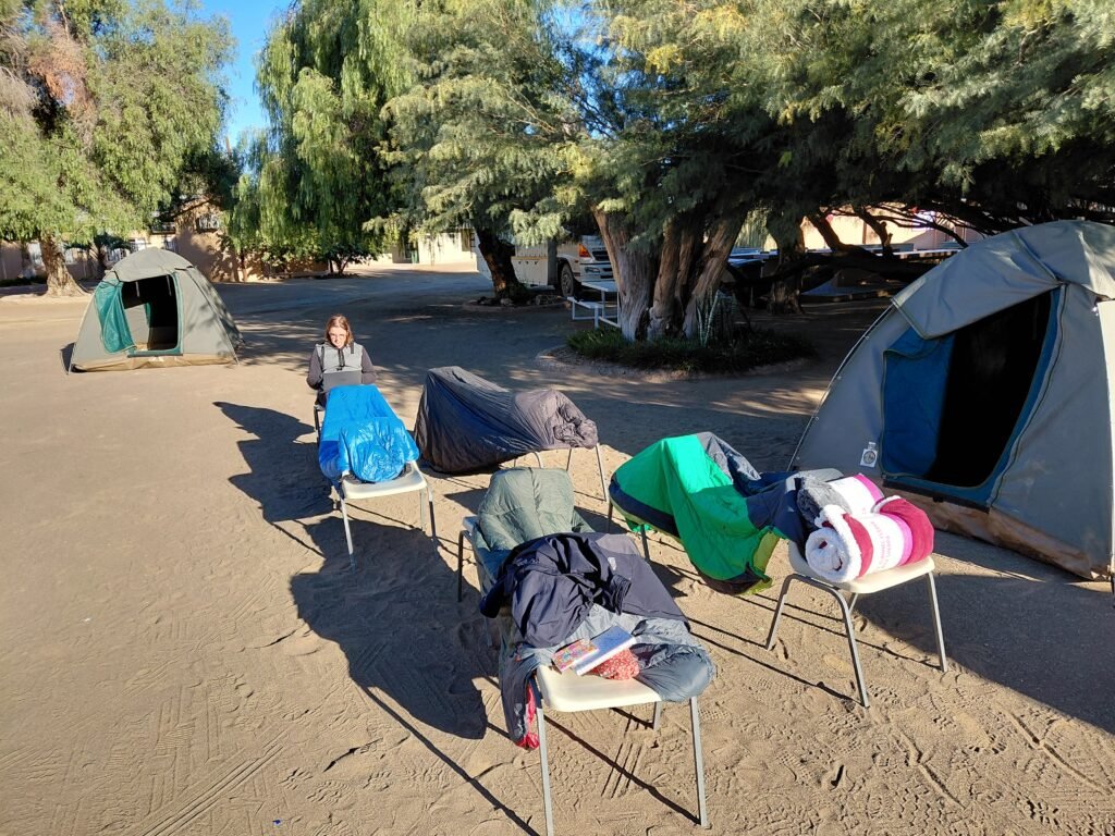 Leirintäalueen pihassa levitimme makuupussimme ja pystytimme telttamme nopeasti aurinkoon kuivumaan. Auringossa ne kuivuivatkin nopeasti, ja tiedossa oli sillä kertaa kuiva, mutta kylmä yö. Marko lähti käymään pikaisesti läheisessä supermarketissa ostamassa Ronjalle lisäviltin makuupussin päälle. Emme halunneet hänen joutuvan palelemaan enää yhtään yötä lisää. Telttailu ei ole kivaa, jos on kylmä. Marko palasikin takaisin kahden paksun fleecepeiton kanssa. Toisen sai Ronja, ja toinen annettiin varmuuden vuoksi Jaanalle, koska hän vaihtoi makuupusseja Ronjan kanssa. Paperilla ainakin Ronjan makuupussin pitäisi olla kaikkein lämpimin, koska on suomalainen Joutsen-merkkinen untuvapussi. Koska Ronja sanoi palelevansa sen sisällä, ajattelimme, että annetaan hänelle sitten synteettisellä kuidulla täytetty makuupussi, jossa ainakaan edellisinä öinä ei ollut tullut Jaanalle kylmä. Lisäksi Yvonne oli ottanut itselleen täksi yöksi huoneen ja saimme sieltä vielä kaksi paksua lisäpeittoa Ronjalle ja Ristolle. Kaiken huipuksi Yvonne sanoi jättävänsä vielä huoneensa oven lukitsematta, joten jos Ronjalle kaikista lisäpeitoista huolimatta tulisi kylmä, hän voisi vain ottaa patjansa sekä peittonsa ja hipsiä nukkumaan Yvonnen huoneen lattialle. Aika ihanasti ajateltu!