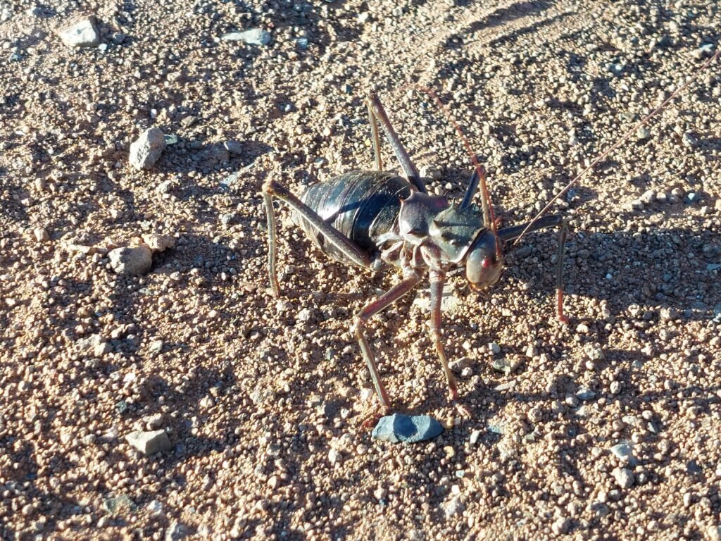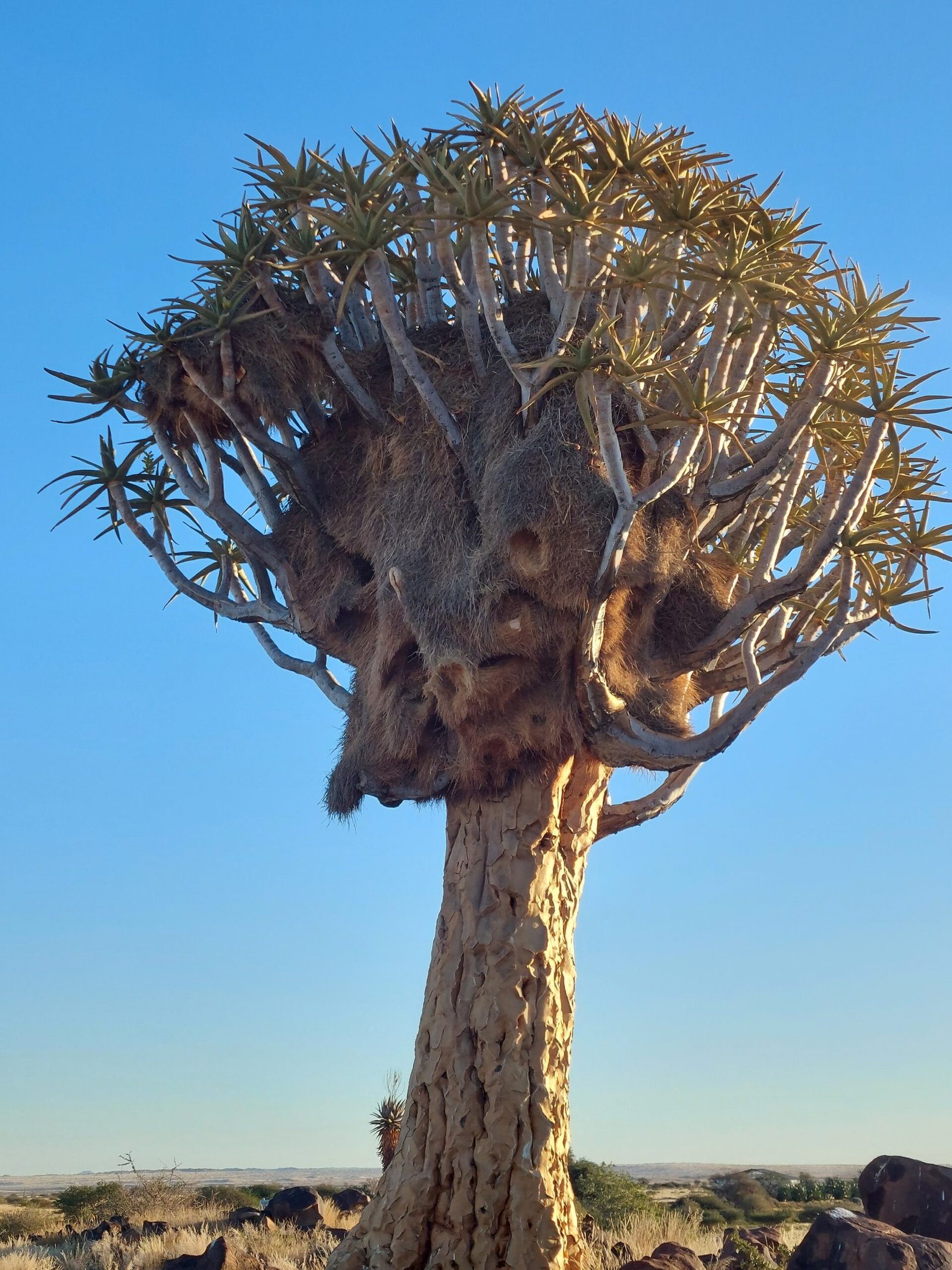 Ennen päivällistä lähdimme vielä käymään paikassa nimeltä Quiver Tree Forest. Siellä kasvoikin hassun näköisiä puita, joihin kutojalinnut olivat tehneet pesiä. Vaikka paikan nimi viittaa puihin ja metsään, meille kerrottiin, että tämä Quiver Tree ei olekaan puu, vaan itseasiassa se kuuluu Aloe-kasvien heimoon. Kutojalintujen lisäksi metsikössä majaili Pöytävuorelta meille tuttuja tamaaneja, sekä aivan tolkuttoman kokoisia heinäsirkkoja.