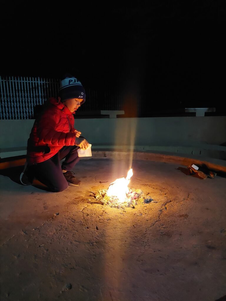 Marko ja Ronja jäivät vielä ravintolaan juttelemaan muiden matkalaisten kanssa. Hetken kuluttua Ronjakin tuli leirinuotiolle, jonka jälkeen Jaana ja lapset vetäytyivät telttoihin nukkumaan. Koska yölämpötilan odotettiin menevän sinä yönä pakkasen puolelle, puimme runsaasti vaatetta yllemme ennen makuupusseihin pujahtamista. Ronja käärittiin lisäksi vielä makuupusseineen päivineen kahden viltin sisään, joten tämä yö sujuisi toivottavasti lämpöisemmissä tunnelmissa.