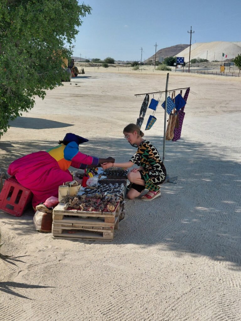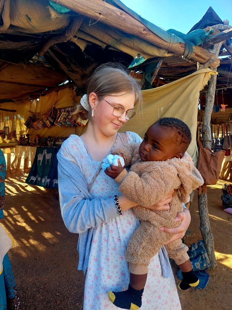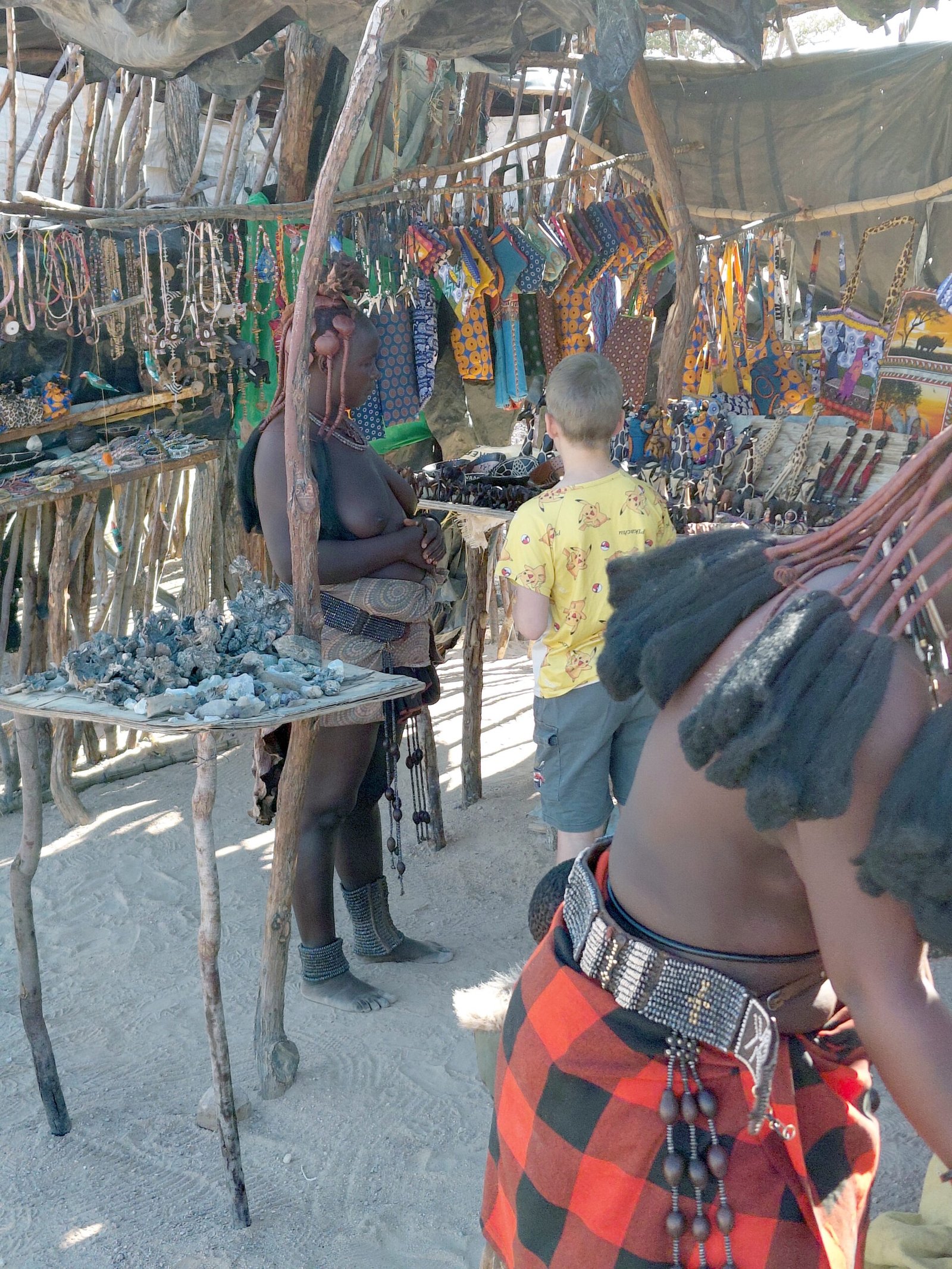 The next day, we continued our journey towards Etosha National Park. So, we had another day of driving ahead of us. At the beginning of the trip, we stopped at a place where Herero and Himba women were selling their handicrafts. We didn’t buy any handicrafts, even though they were beautiful, because the wooden decorative items in particular would surely be broken before we got back to Finland. Risto, on the other hand, spent 80 NAD on gemstones, which the women were also selling in their stalls. Ronja had managed to make another octopus, and she decided to give it to a little boy belonging to one of the Herero women. In return, Ronja got to hold the little boy and she was given a beautiful bracelet as a gift.