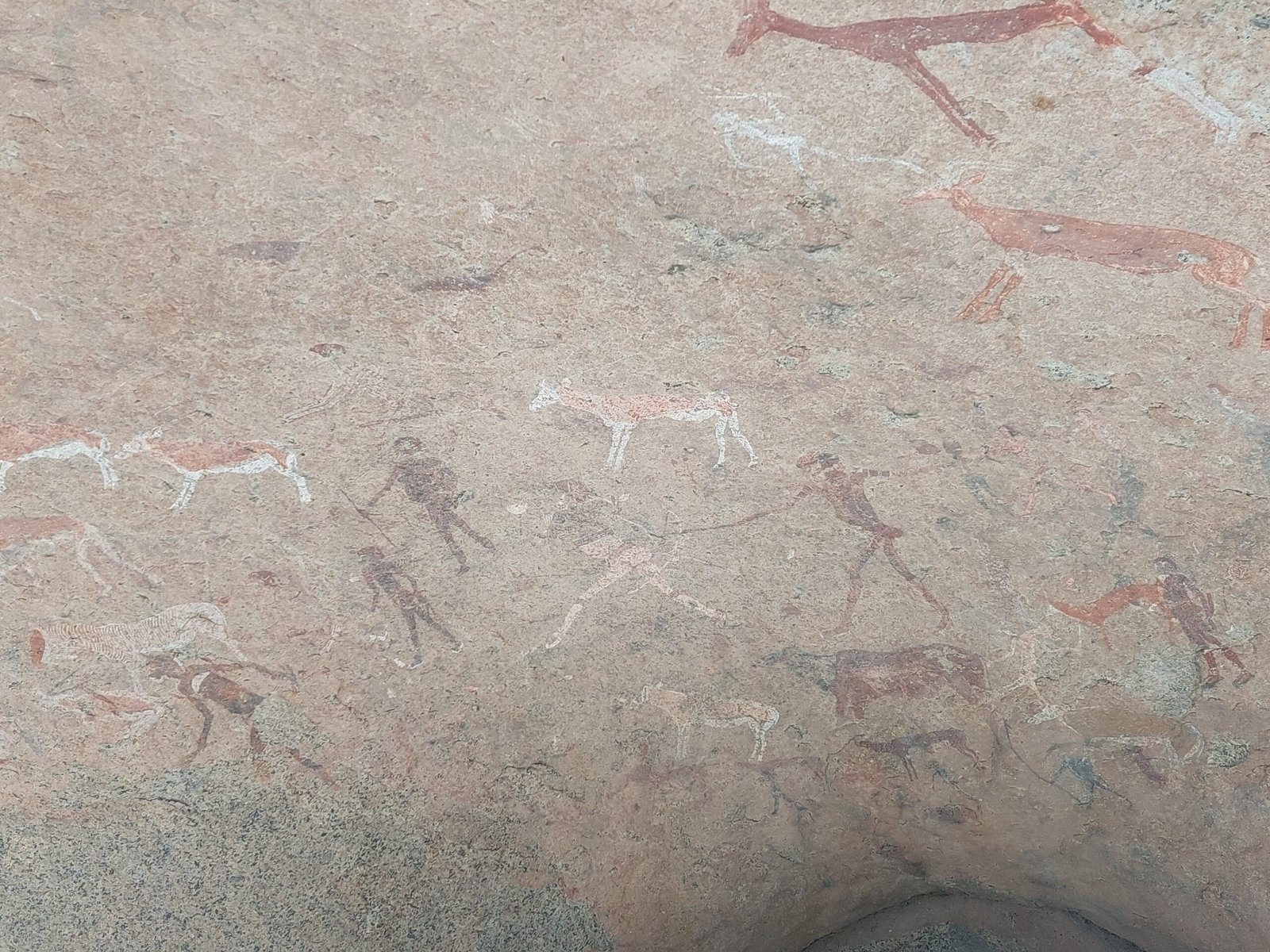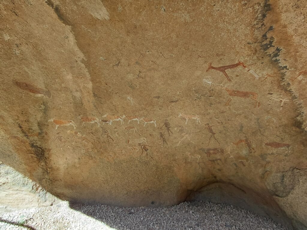 Brandberg Mountain is the highest point in Namibia, reaching just under 2,600 meters (2,573 meters) at its peak. It would have been possible to hike there, but the route would have taken four days. We didn’t go hiking just for fun, but to see the rock paintings made by the indigenous people. The most important of these was called the White Lady. However, we were told that the fair-skinned person in the painting was not white, nor was it even a woman. In reality, it was a shaman who had been painted white with ash. The rock paintings we saw were very well preserved and were between 2,000 and 5,000 years old. There are many other rock paintings in the Brandberg area. According to our guide, they have been found in over a thousand locations, and there are a total of about 43,000 individual paintings. It would be quite a task to see them all!
