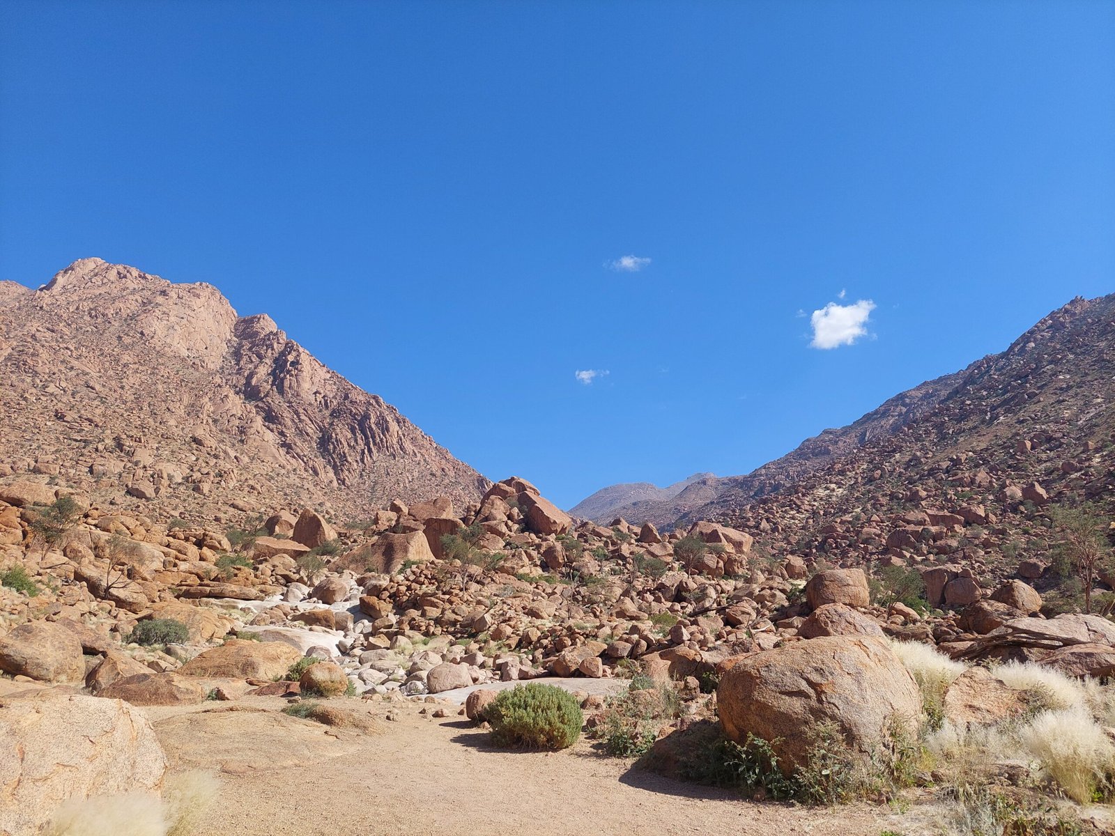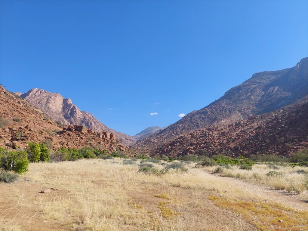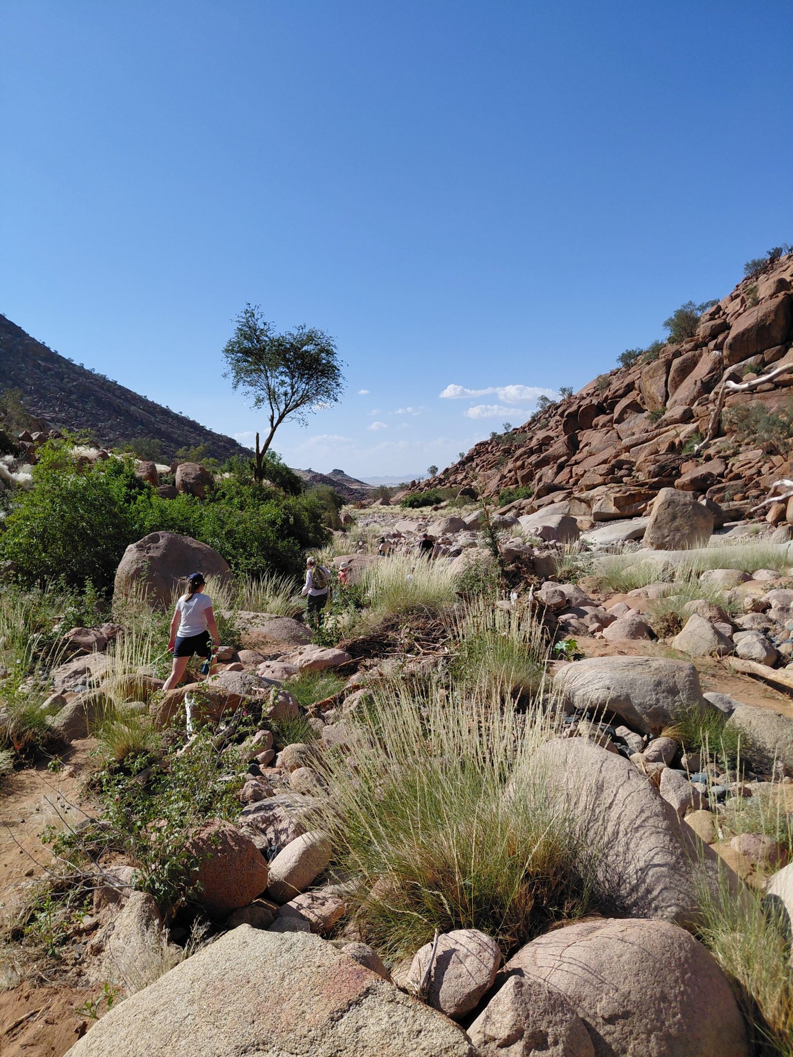 On Sunday, we continued our journey toward Brandberg Mountain. The drive wasn’t long, so we arrived at the village of Uis around noon. Before setting up camp, we went on a three-hour walk in the valley between the mountain peaks. It wasn’t the best time for a walk, as it was incredibly hot. The walk wasn’t very long, only about 5 km in total, but heavy rains had washed away part of the trail. So we walked almost the entire way along a very rocky path, which was quite slow going.