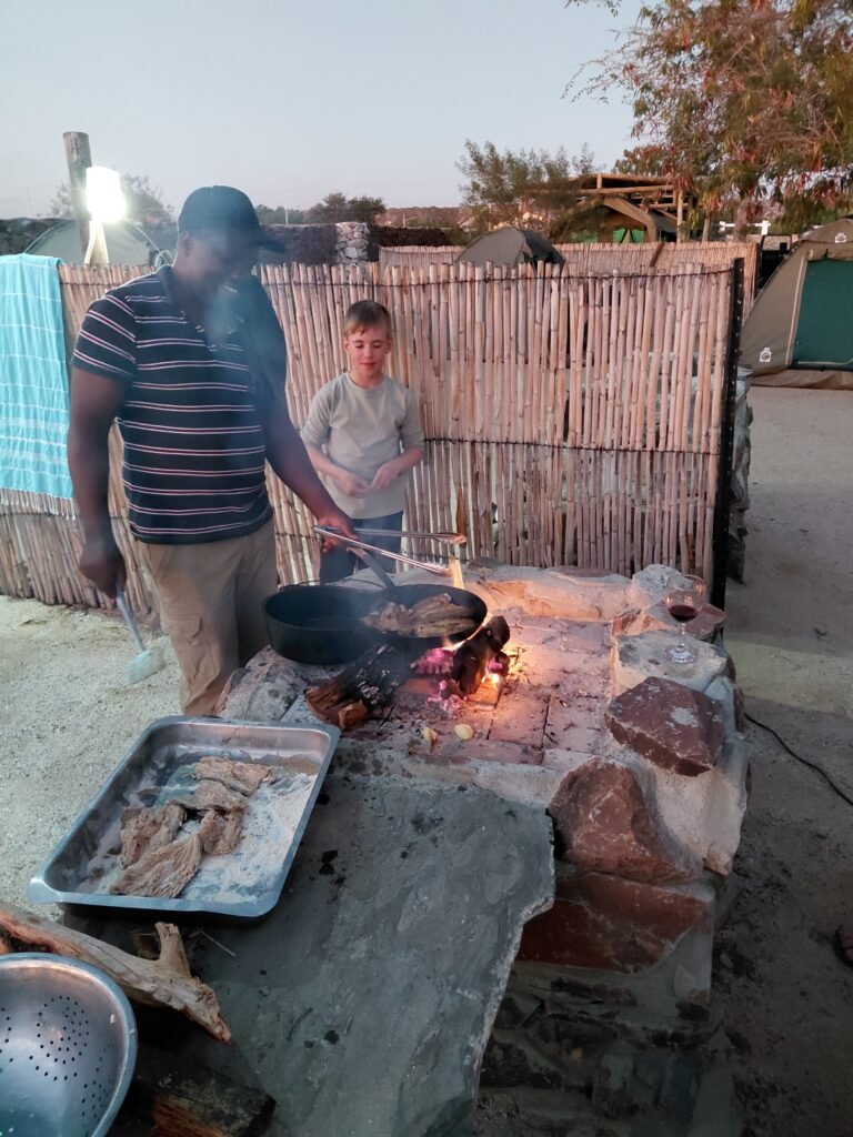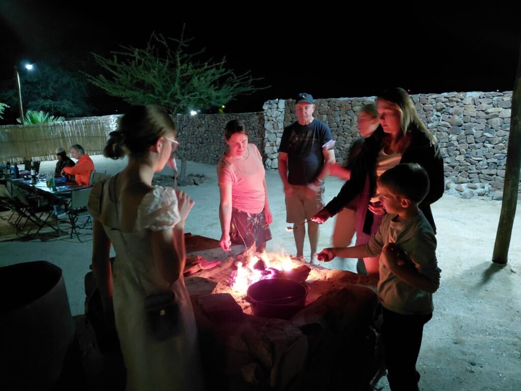 After our walk, we returned to the campsite in the village of Uis and pitched our tent. There was also a small swimming pool, which the children quickly jumped into despite the rather cold water. We adults were content to sit at the bar and enjoy €1.50 ciders. For dinner, a long table was set for us, and Stanley cooked us some delicious fish. (Much to Risto’s delight, over the campfire.)