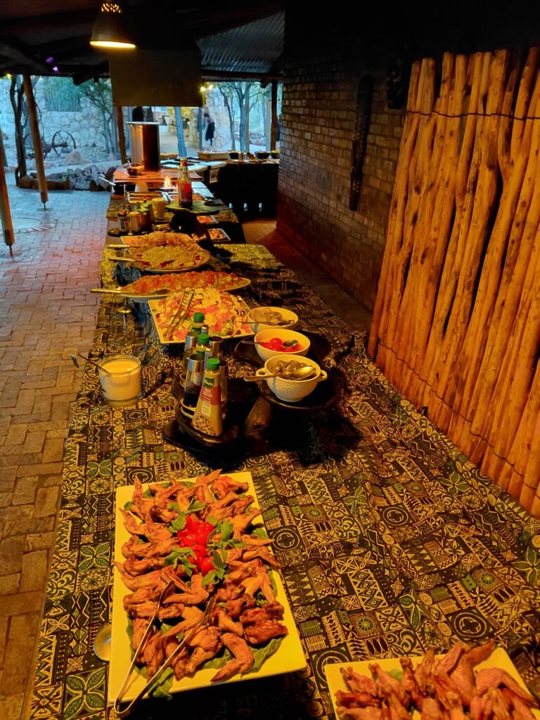 Dinner was quite a feast. The main course included springbok, kudu, zebra, and eland. We had to try them all. In our opinion, all the meat options tasted pretty much the same. However, the eland got the worst marks from us. In addition to meat, there were also various salads, bread, and, of course, desserts. When we returned to the campsite after dinner, there was a snake in the middle of the road. As it was quite cool, it moved slowly, so we had plenty of time to marvel at it before it disappeared into the grass. As you might expect, Ronja was a little freaked out by the encounter and immediately demanded to upgrade from a tent to a cabin. Ronja’s opinion was noted, but no action was taken.