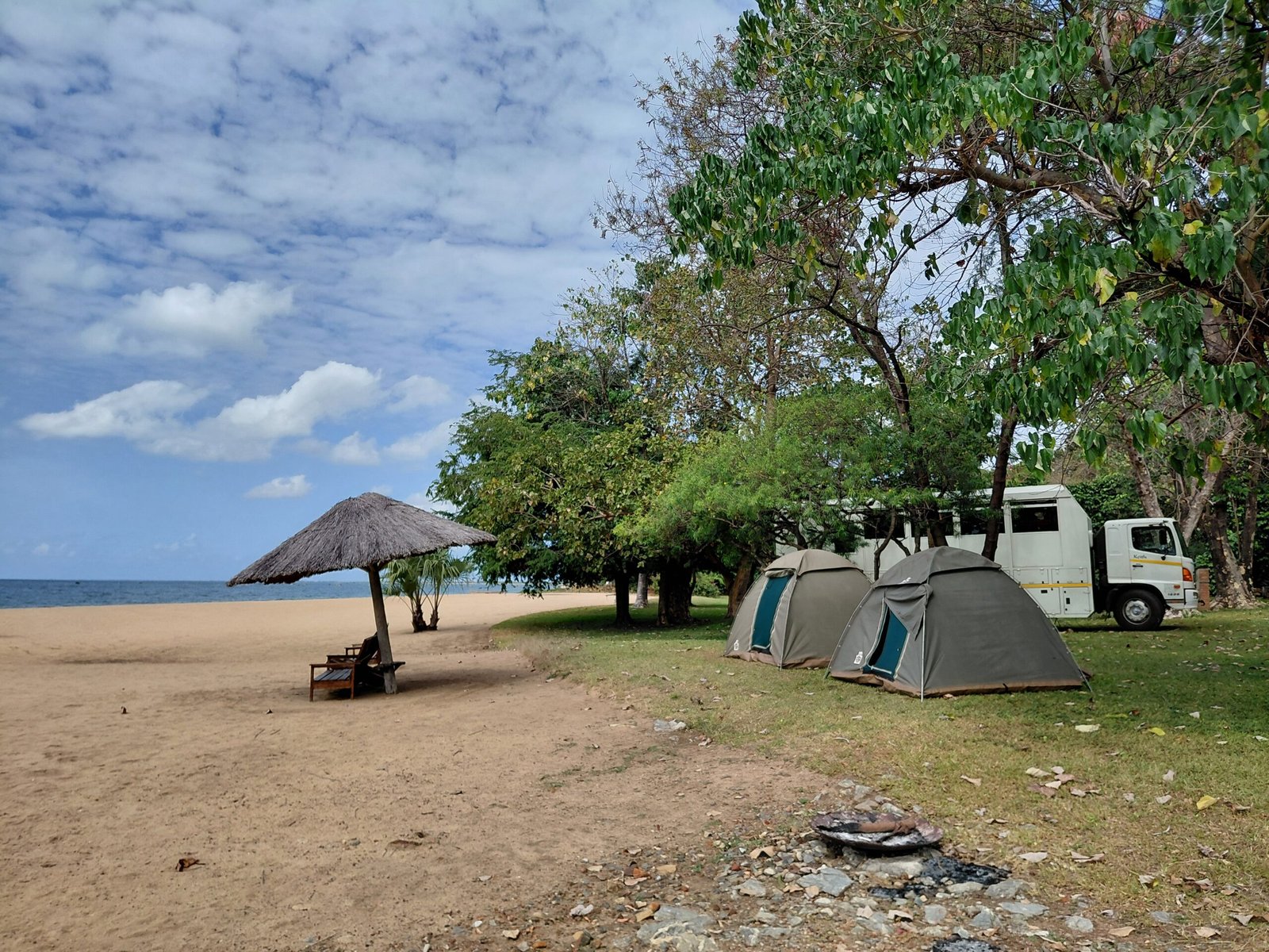 After crossing the Malawi border, we cruised at a very slow pace towards our next overnight stop in the village of Ngala. We knew it would be a long and bumpy journey, but I guess none of us were prepared for how long the journey would end up taking. After 14,5h we arrived at Ngala Beach Lodge. As it was getting late, we had dinner at the on-site restaurant. Meanwhile, Gift and Casper pitched our tent. We were the only ones camping this time, as everyone else had decided to opt for room accommodation due to the earlier rain. We also considered this option for a while, but as the rain had stopped, we decided to continue camping.