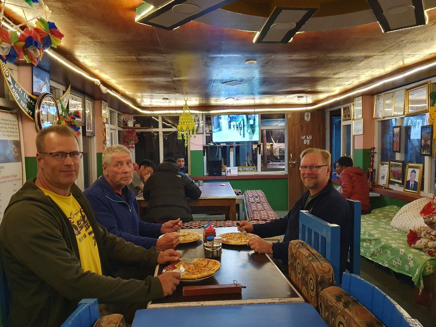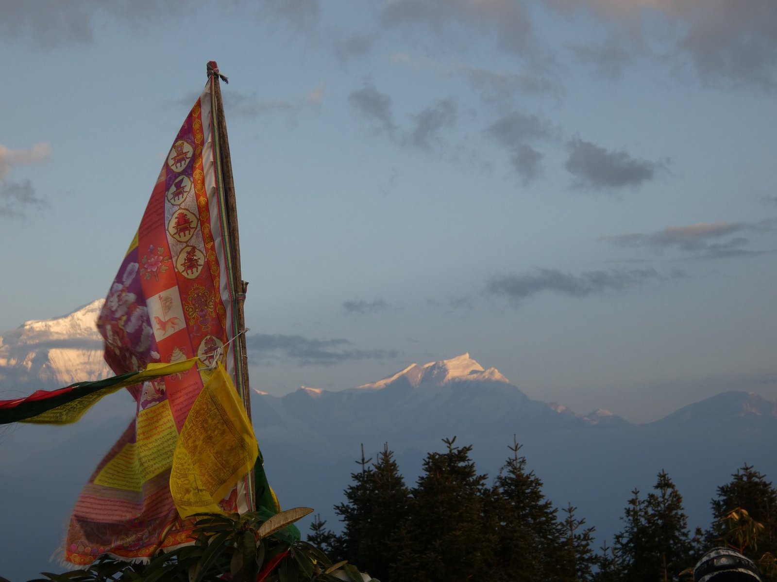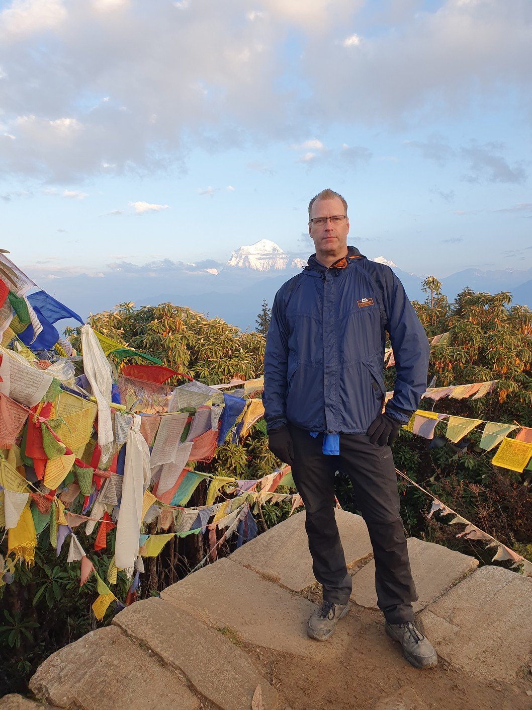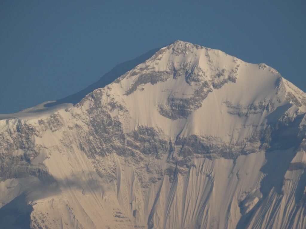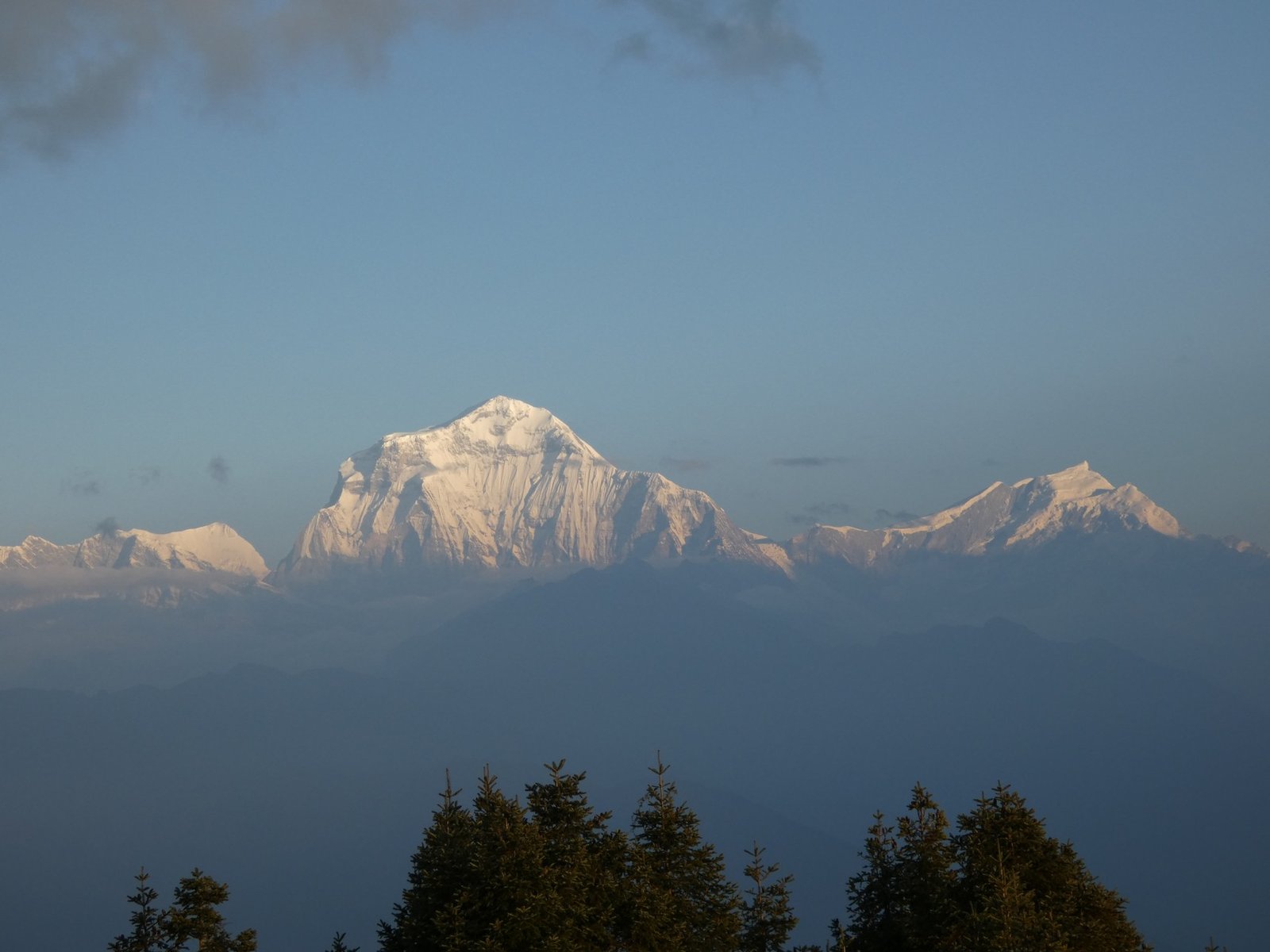 We arrived at 05:50, so we had to wait a while for the sunrise in the cold. Photos could be taken in two different directions. In the east we could see the reddish horizon and in the west the sun was illuminating the peak of Dhaulagiri more and more every minute. At 8167 metres, Dhaulagiri is the seventh highest mountain in the world. The scenery was undeniably spectacular. At maybe a quarter to seven we headed down towards our accommodation and breakfast.
