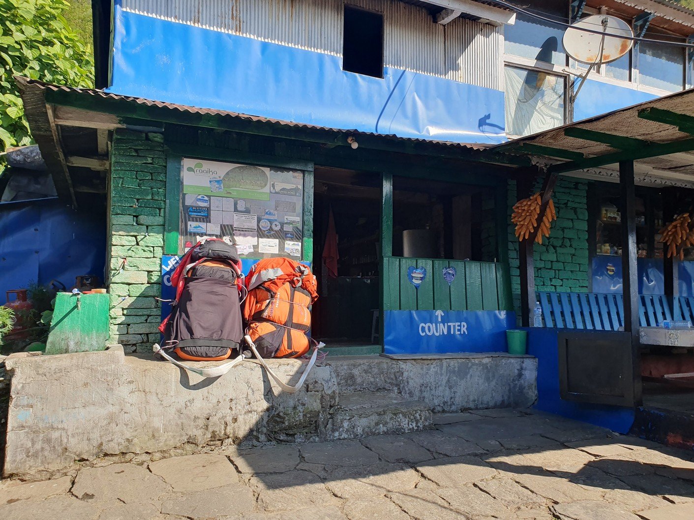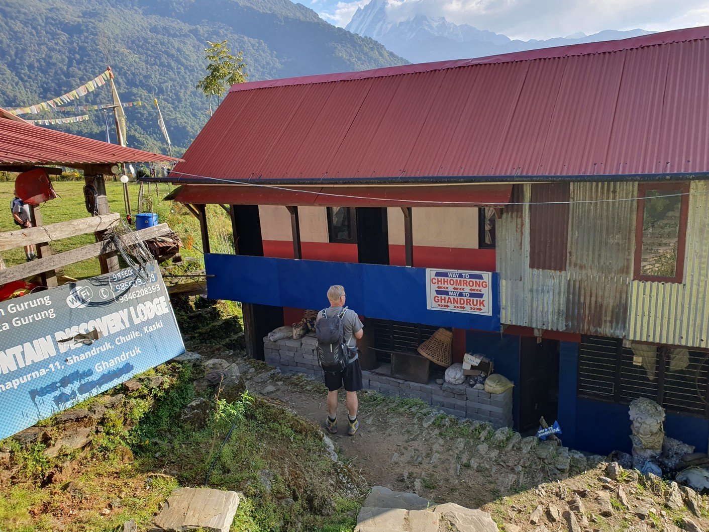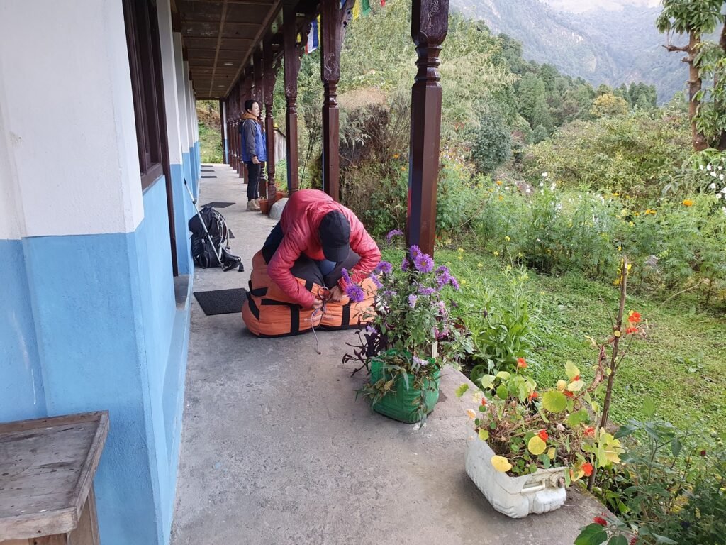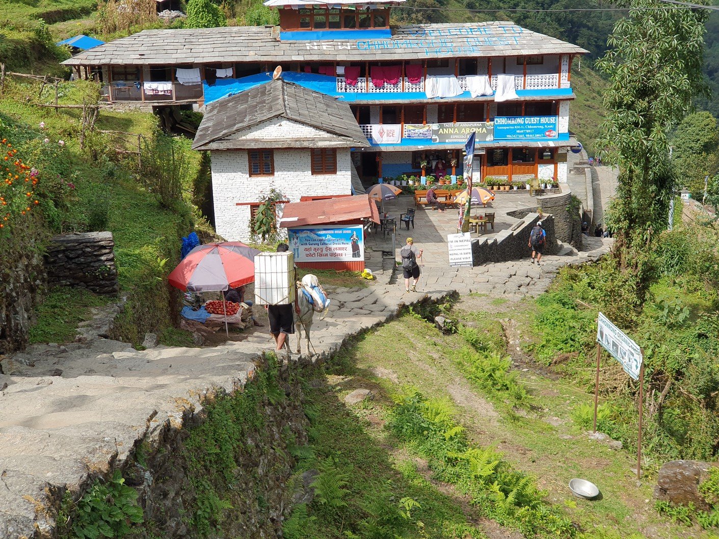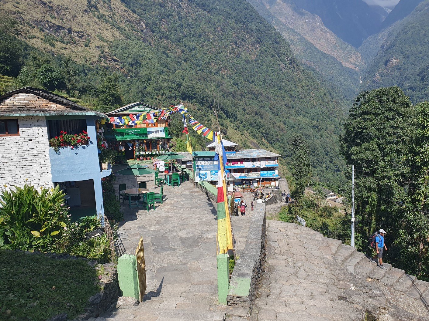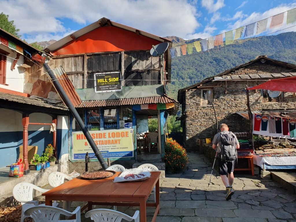 Unfortunately, the itinerary for the day was quite similar to the previous day. From Chuile we started with a long downhill followed, surprisingly, by a correspondingly crazy uphill. It took us over three hours to reach our lunch spot at Chomrong. A road ended in the valley below Chomrong and we would use the ‘jeep stop’ there to eventually take a jeep to Pokhara. From here the route would continue up one of the valleys towards the Annapurna base camp. Amrit asked us to see if there was anything we didn’t need in our gear bags so that we could leave them at the guest house for storage. Amrit assured us that thick blankets would be available at the guest houses we would be using the following days, so we all left our sleeping bags, which alone weighed quite a few kilos. I also left the sturdier hiking boots, which also weighed almost two kilos, and a big bag of dirty laundry. Amrit also asked us if we could leave out the emergency oxygen bottle. Since we had already been well above the altitude we were going to, we didn’t think it was necessary to carry the oxygen bottle any more. There was also no need for the crampons that were in the tour operator’s equipment bag. All in all, we left at least twenty kilos of stuff in storage, which made the job of the porters much easier.