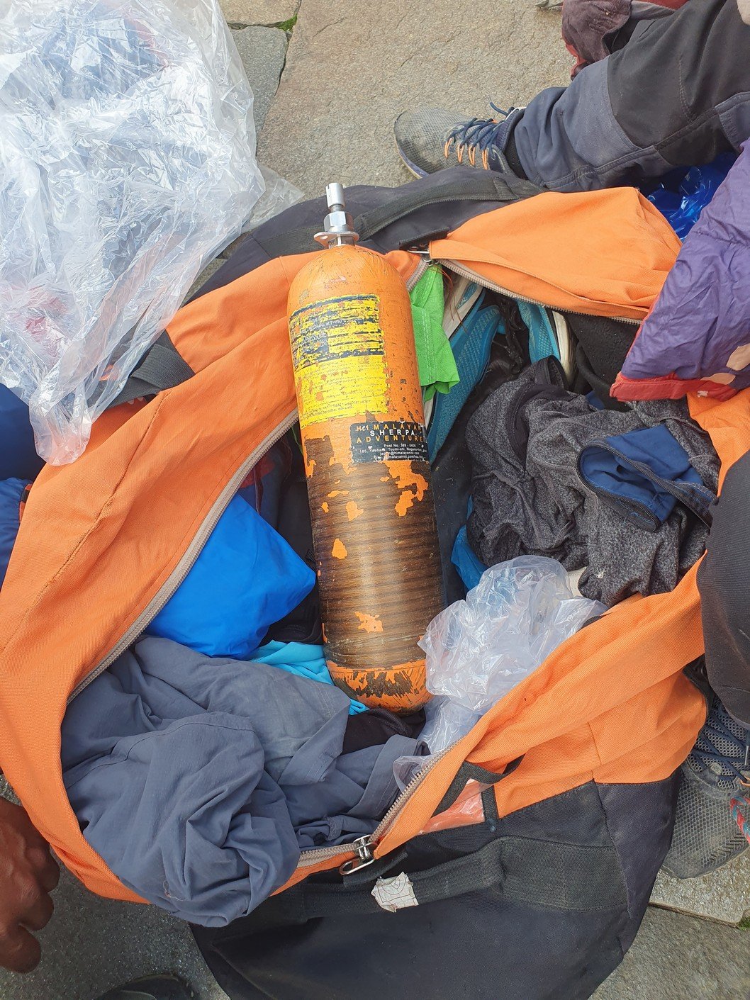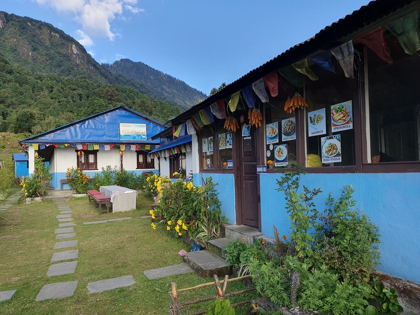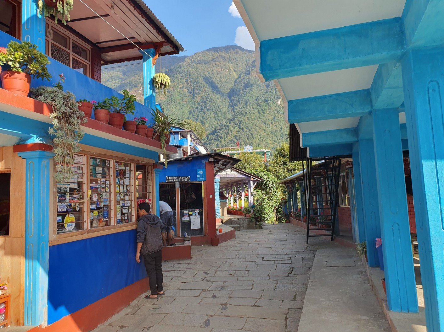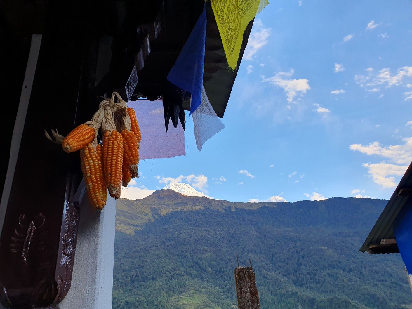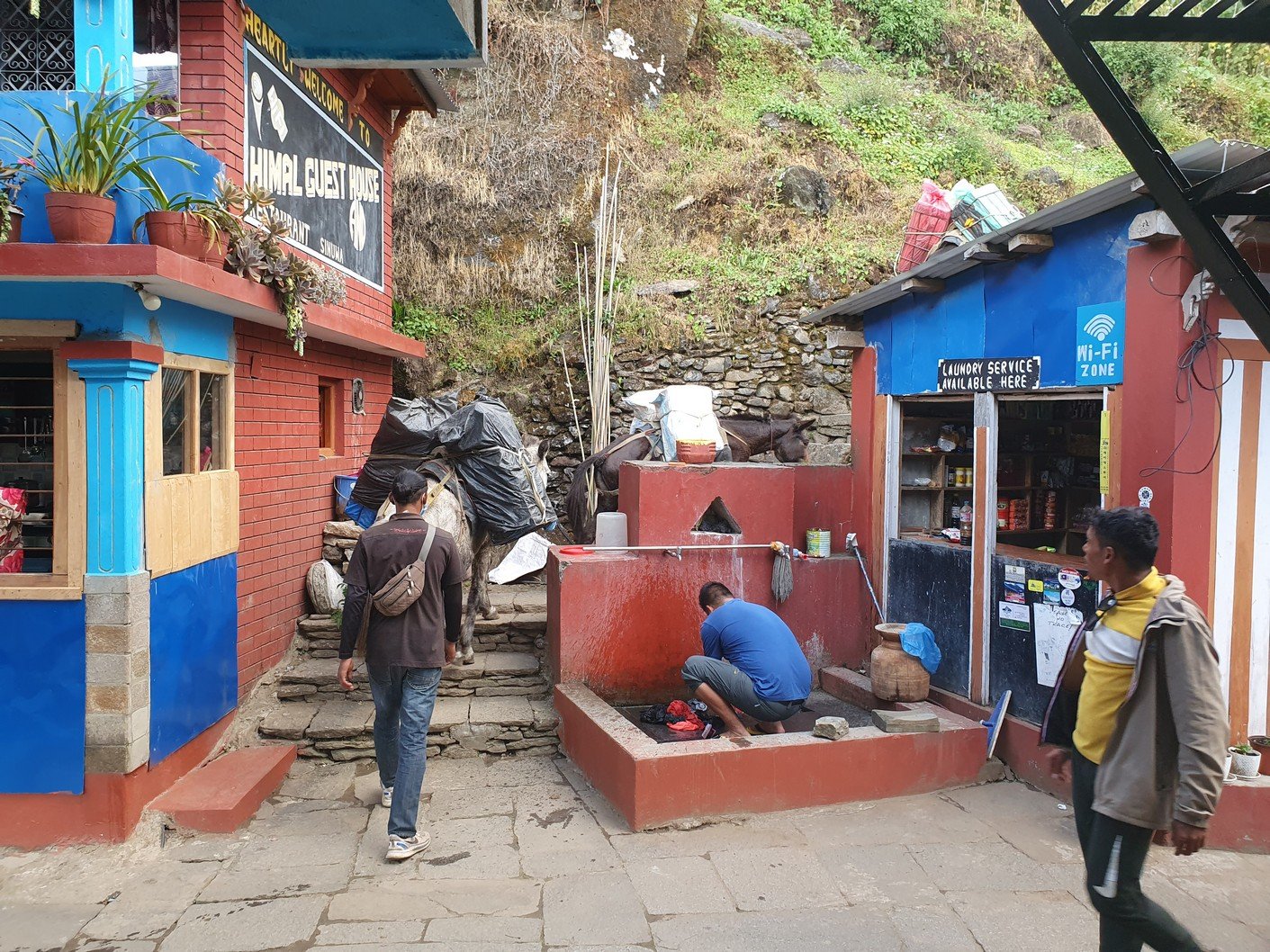 Unfortunately, the itinerary for the day was quite similar to the previous day. From Chuile we started with a long downhill followed, surprisingly, by a correspondingly crazy uphill. It took us over three hours to reach our lunch spot at Chomrong. A road ended in the valley below Chomrong and we would use the ‘jeep stop’ there to eventually take a jeep to Pokhara. From here the route would continue up one of the valleys towards the Annapurna base camp. Amrit asked us to see if there was anything we didn’t need in our gear bags so that we could leave them at the guest house for storage. Amrit assured us that thick blankets would be available at the guest houses we would be using the following days, so we all left our sleeping bags, which alone weighed quite a few kilos. I also left the sturdier hiking boots, which also weighed almost two kilos, and a big bag of dirty laundry. Amrit also asked us if we could leave out the emergency oxygen bottle. Since we had already been well above the altitude we were going to, we didn’t think it was necessary to carry the oxygen bottle any more. There was also no need for the crampons that were in the tour operator’s equipment bag. All in all, we left at least twenty kilos of stuff in storage, which made the job of the porters much easier.